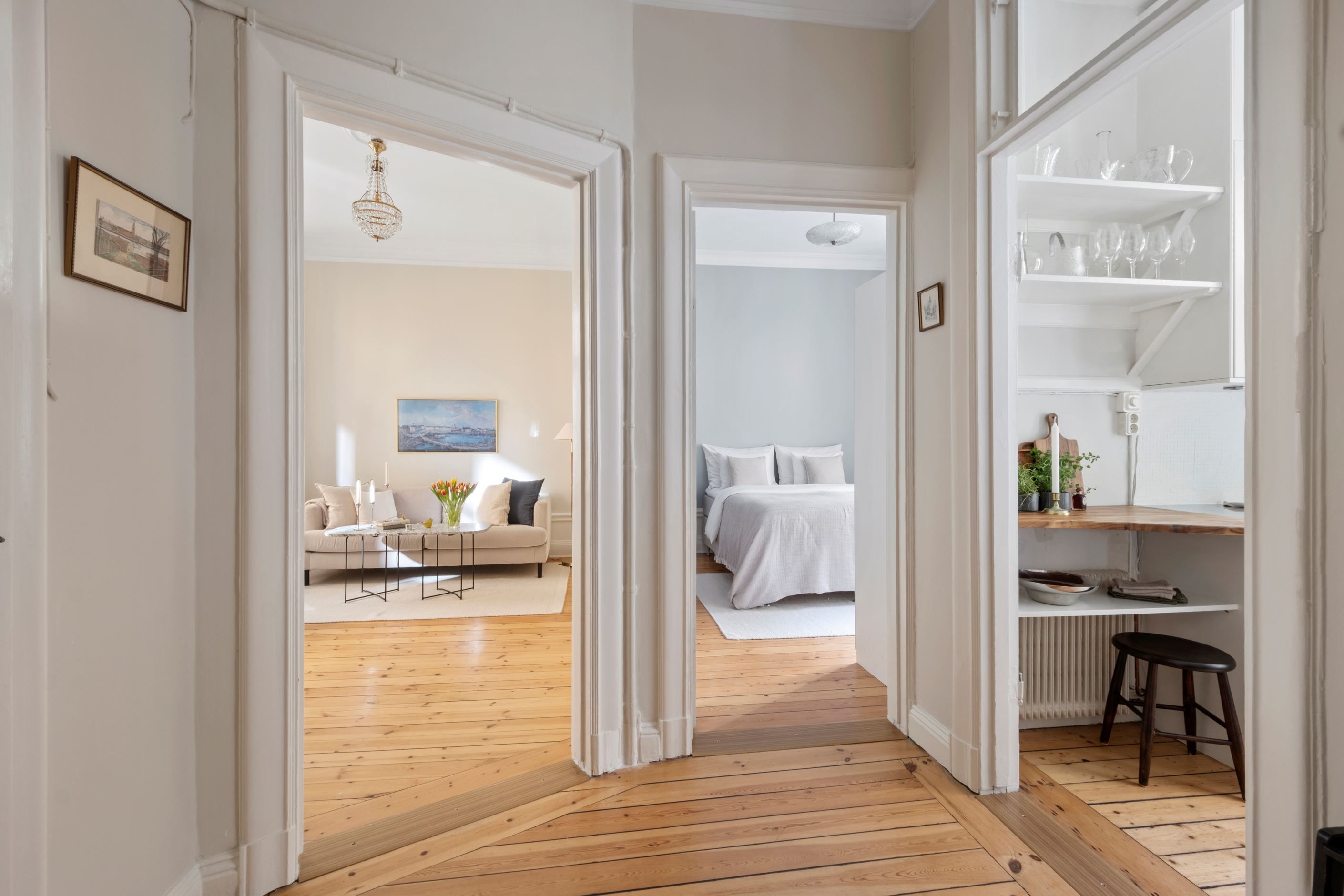 Det rymliga vardagsrummet blir bostadens självklara samlingspunkt, med gott om plats för både soffgrupp och matbord. Härifrån når du även den trevliga och rymliga balkongen som rymmer plats för både soffgrupp, bord och växter.