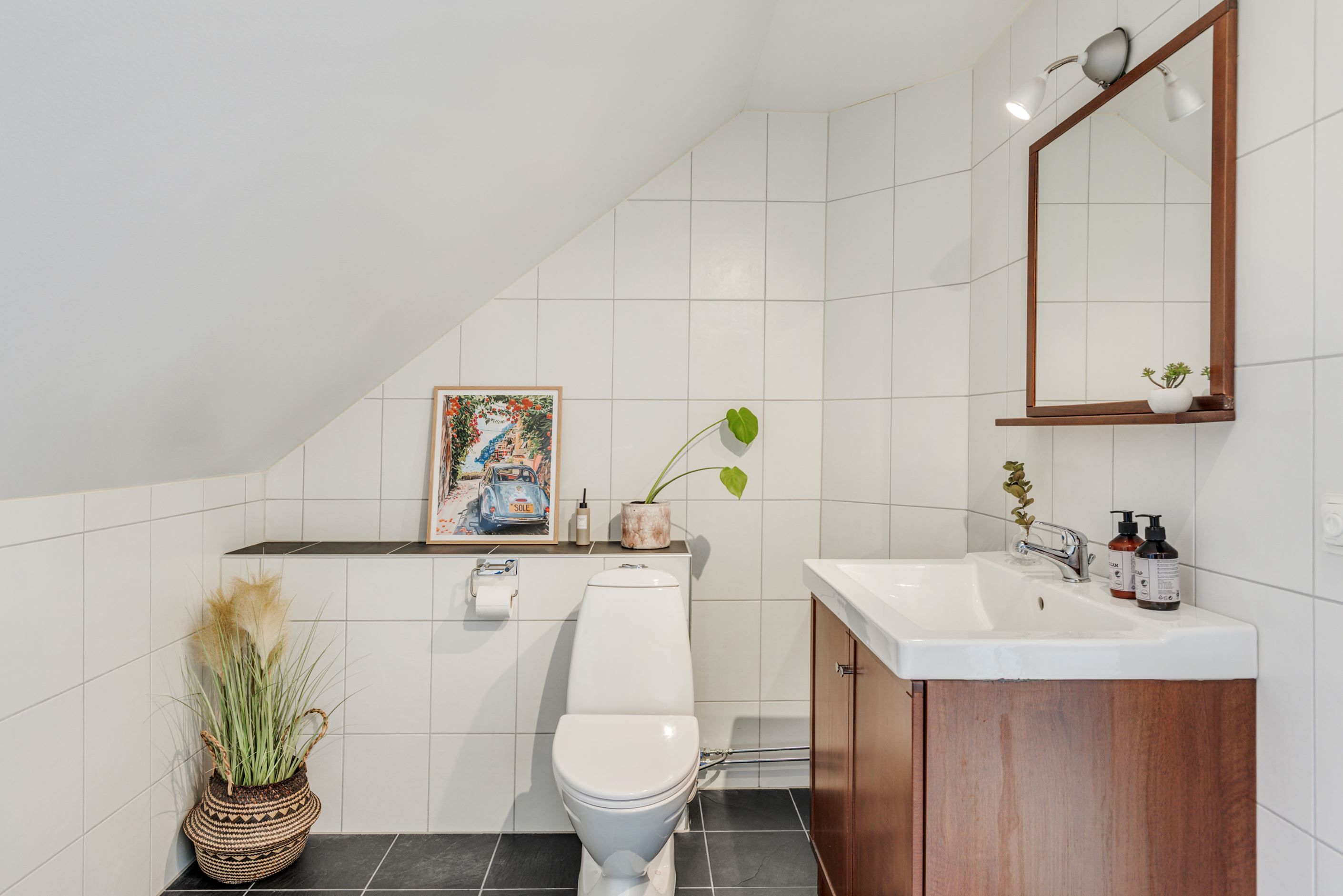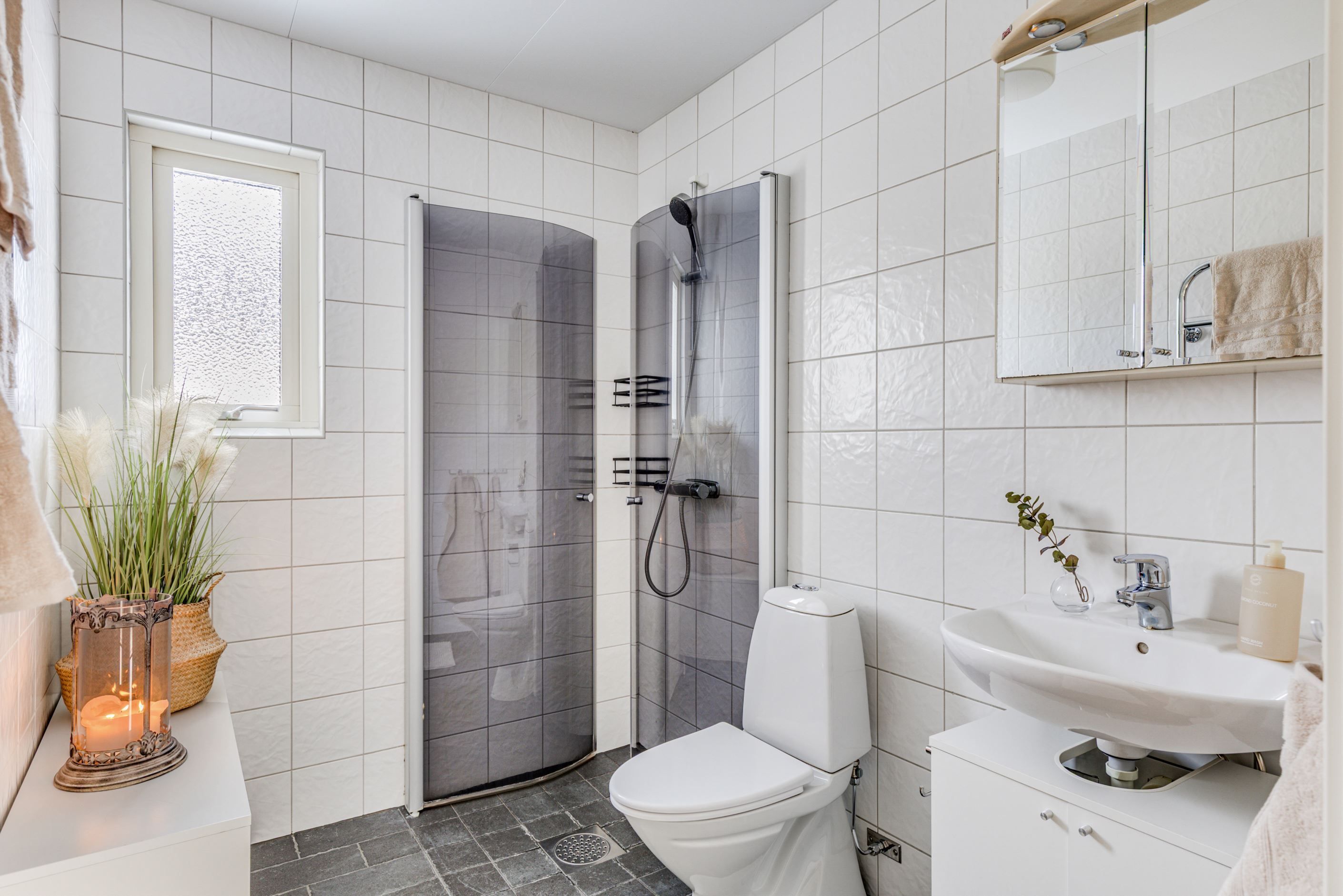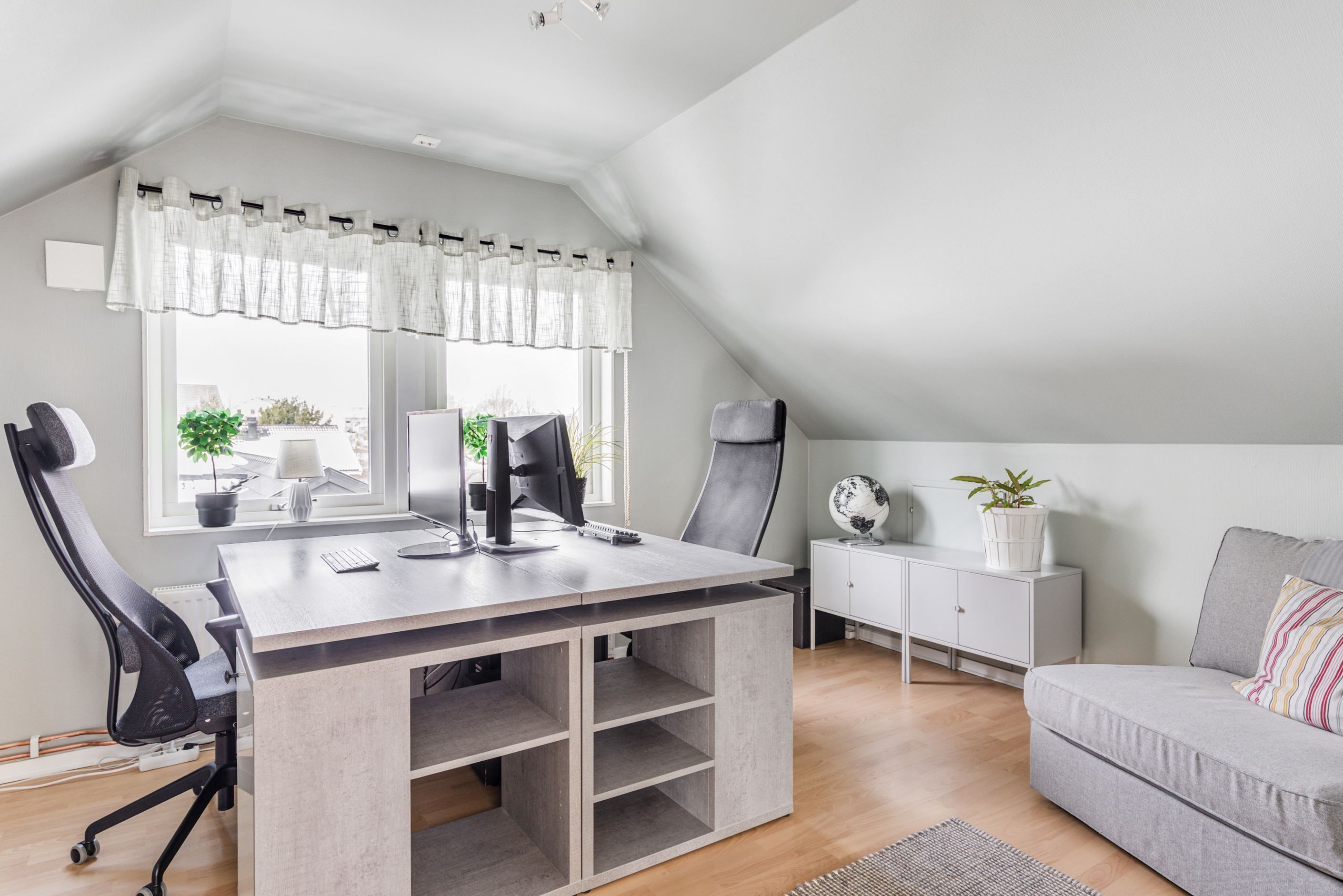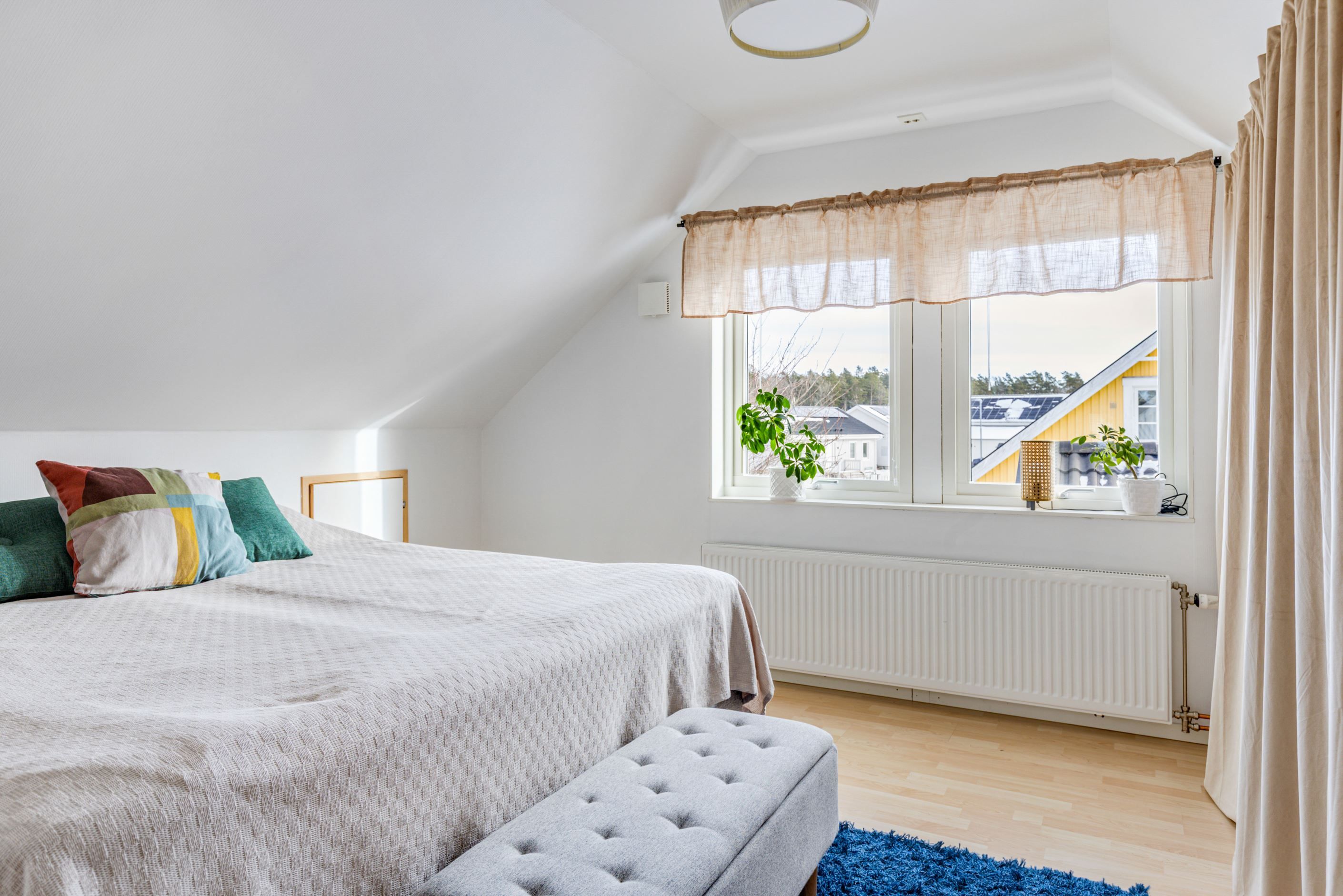 Entréplanet har en genomtänkt planlösning med två sovrum, WC/dusch samt en praktisk tvättstuga med goda arbetsytor och smart förvaring. På övre plan finns ytterligare två sovrum, ett rymligt allrum – perfekt som TV-rum, hemmakontor eller lekyta – samt ett stort badrum.
