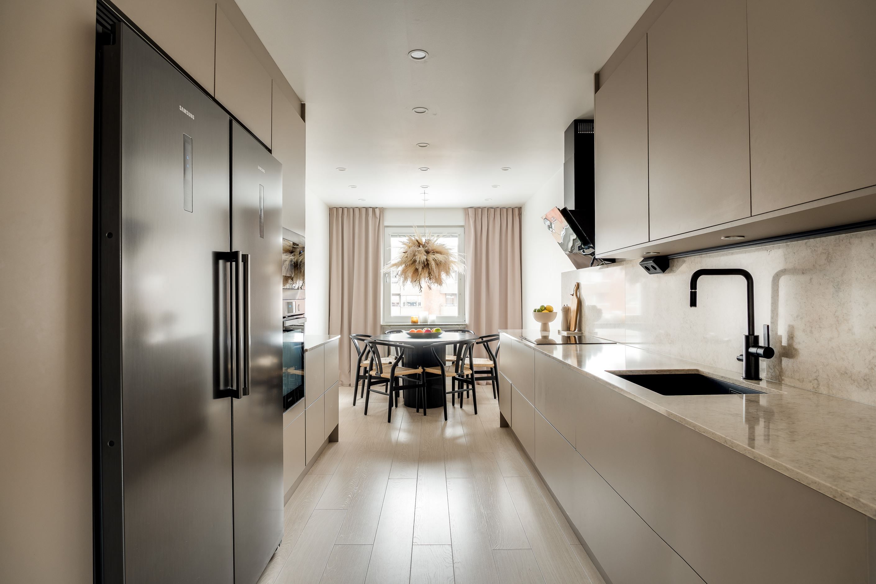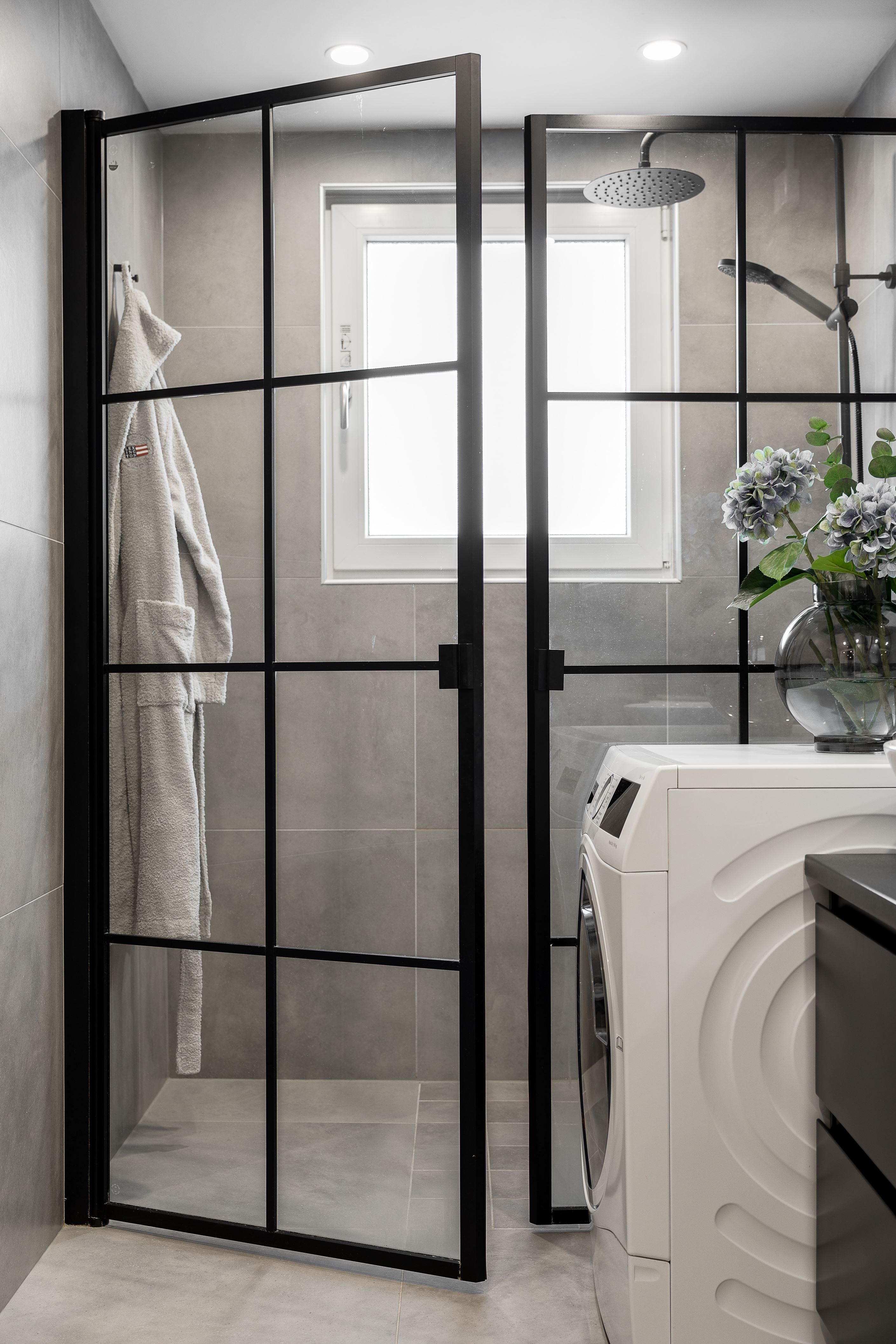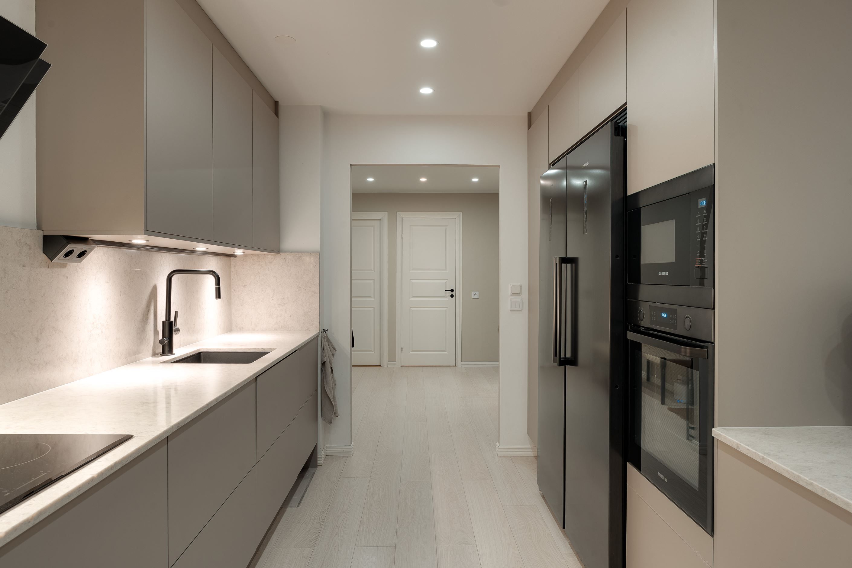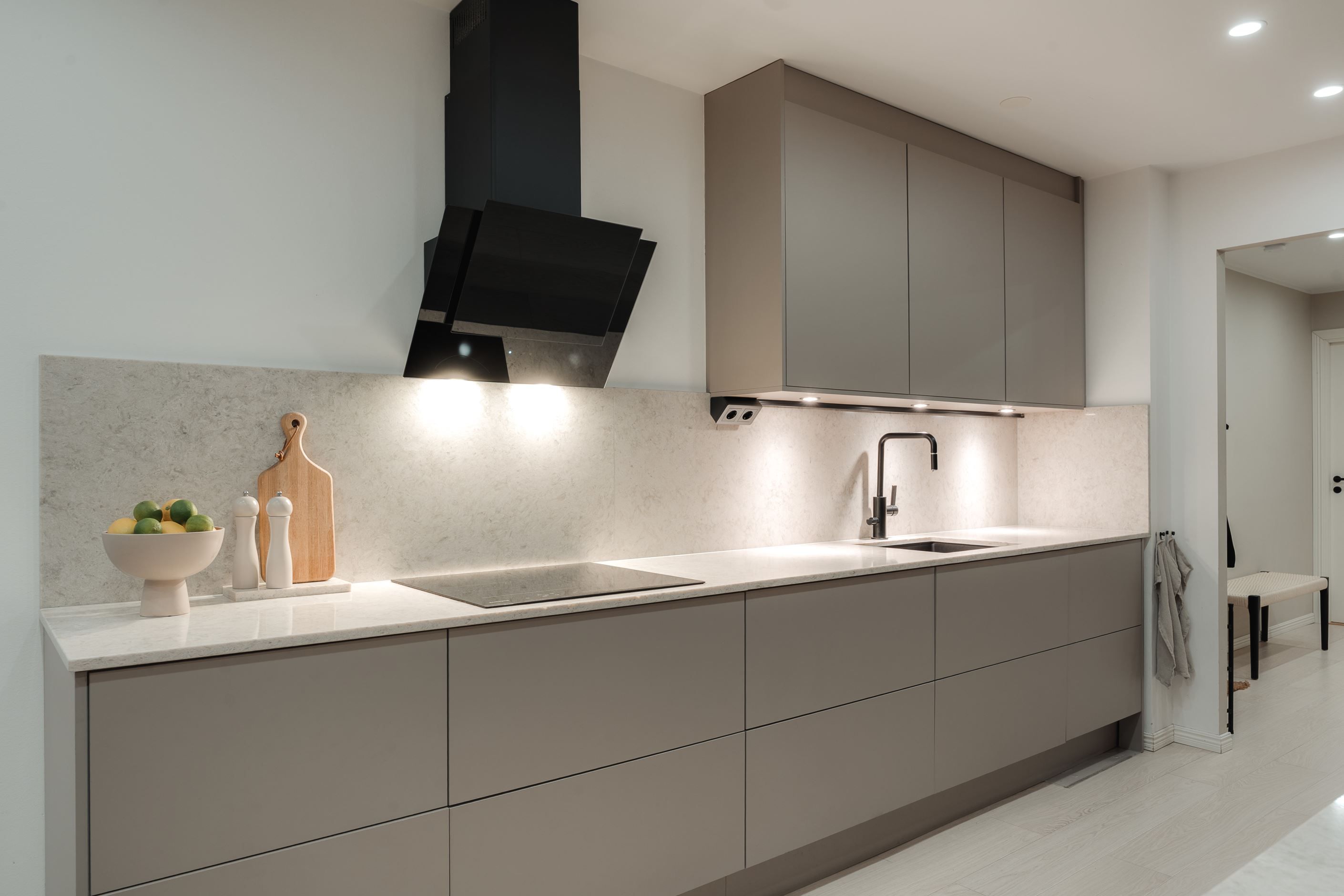 Exklusiva materialval möter genomtänkt design: ett stilrent kök med bänkskiva och stänkskydd i kompositsten, enhetliga enstaviga golv, garderober och ett renoverat, helkaklat duschrum med tvättmaskin.