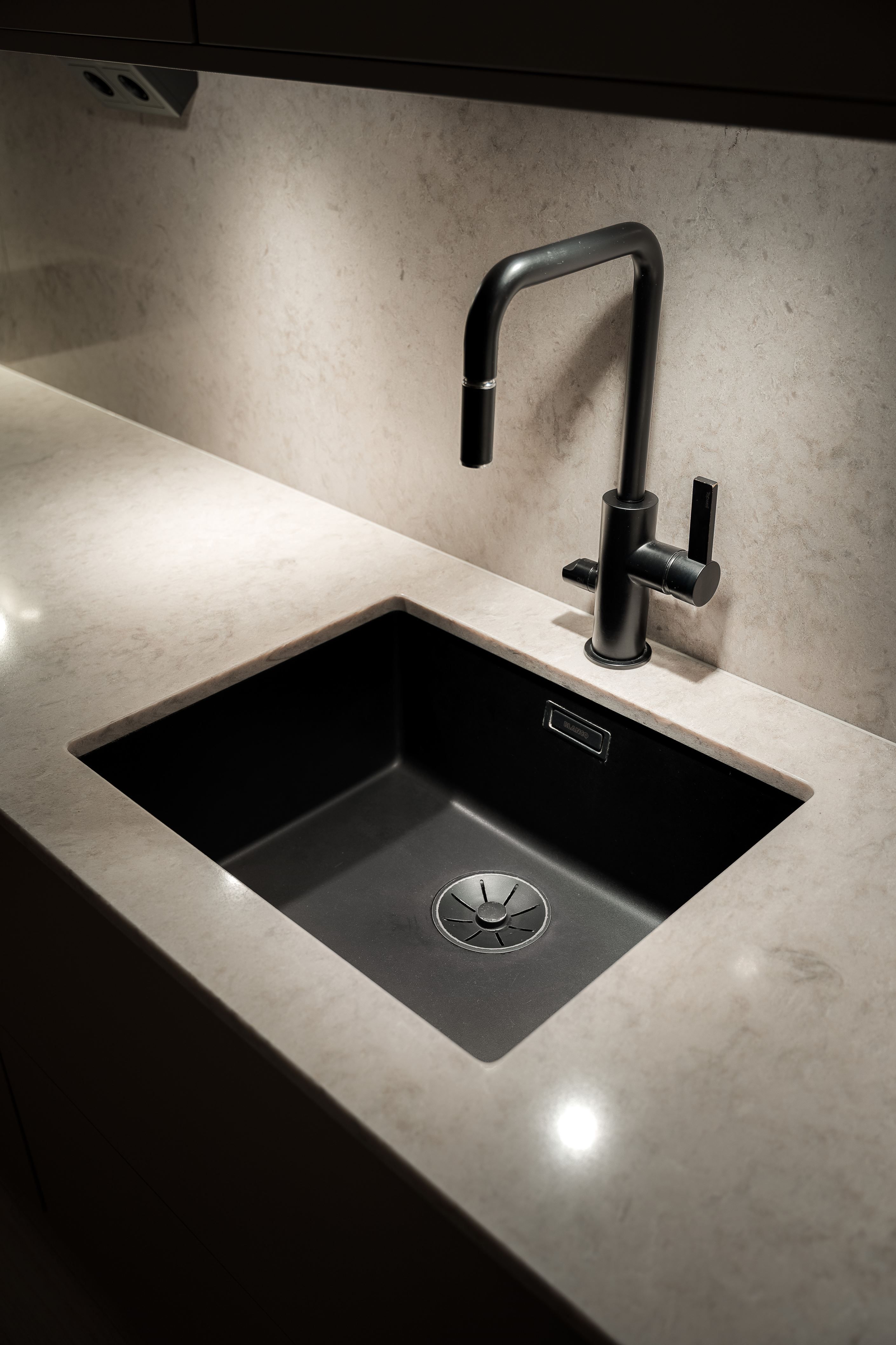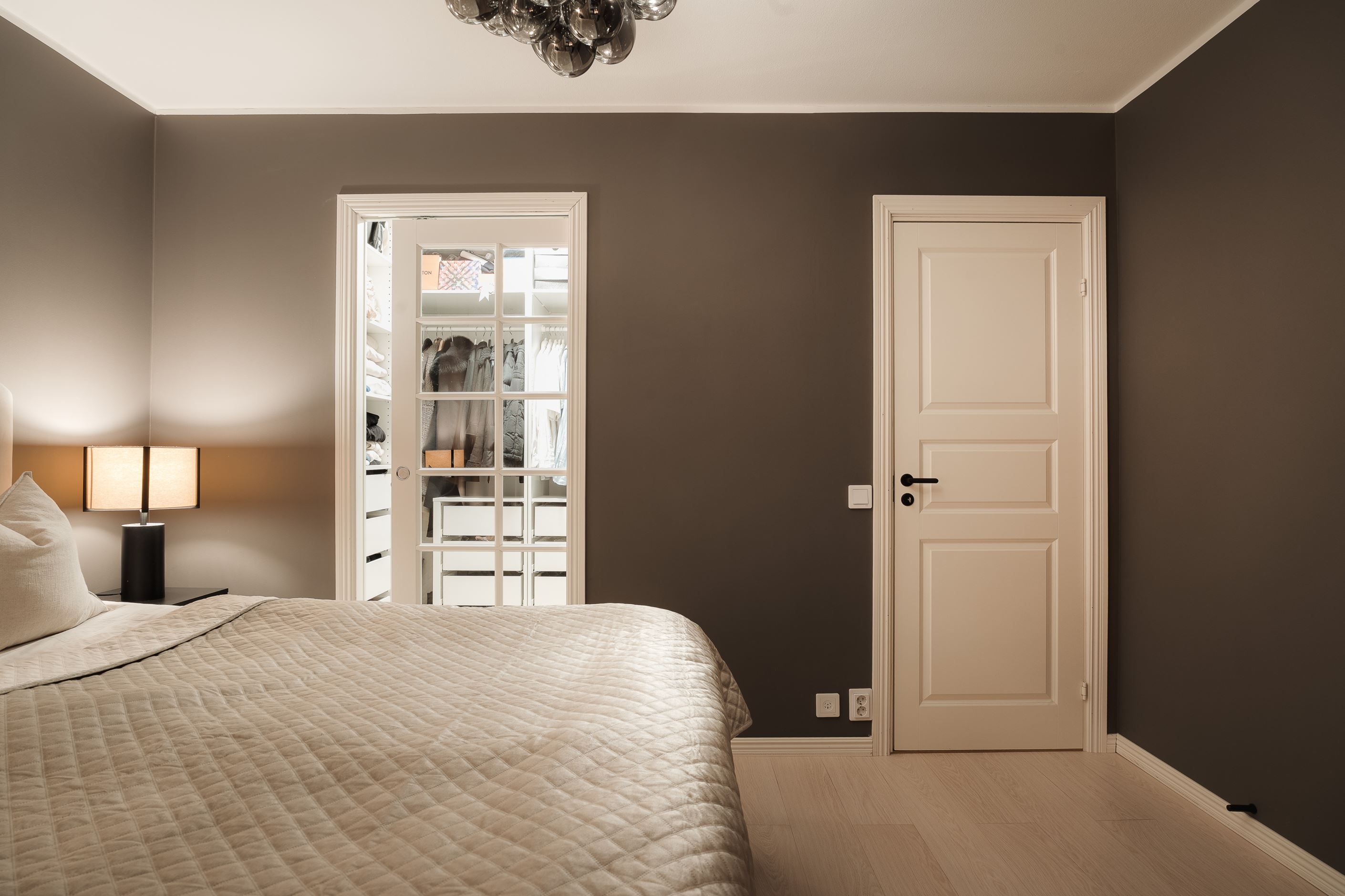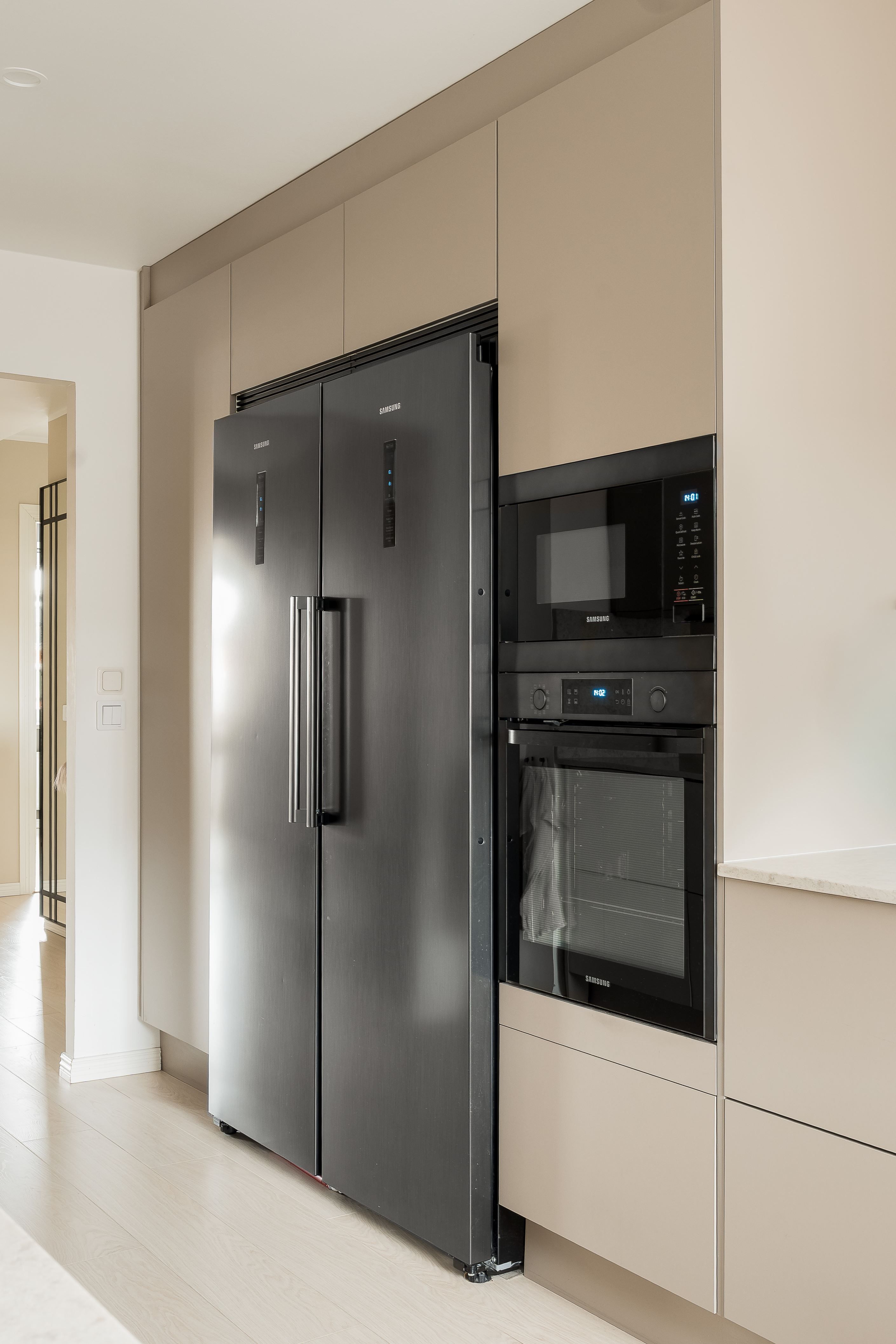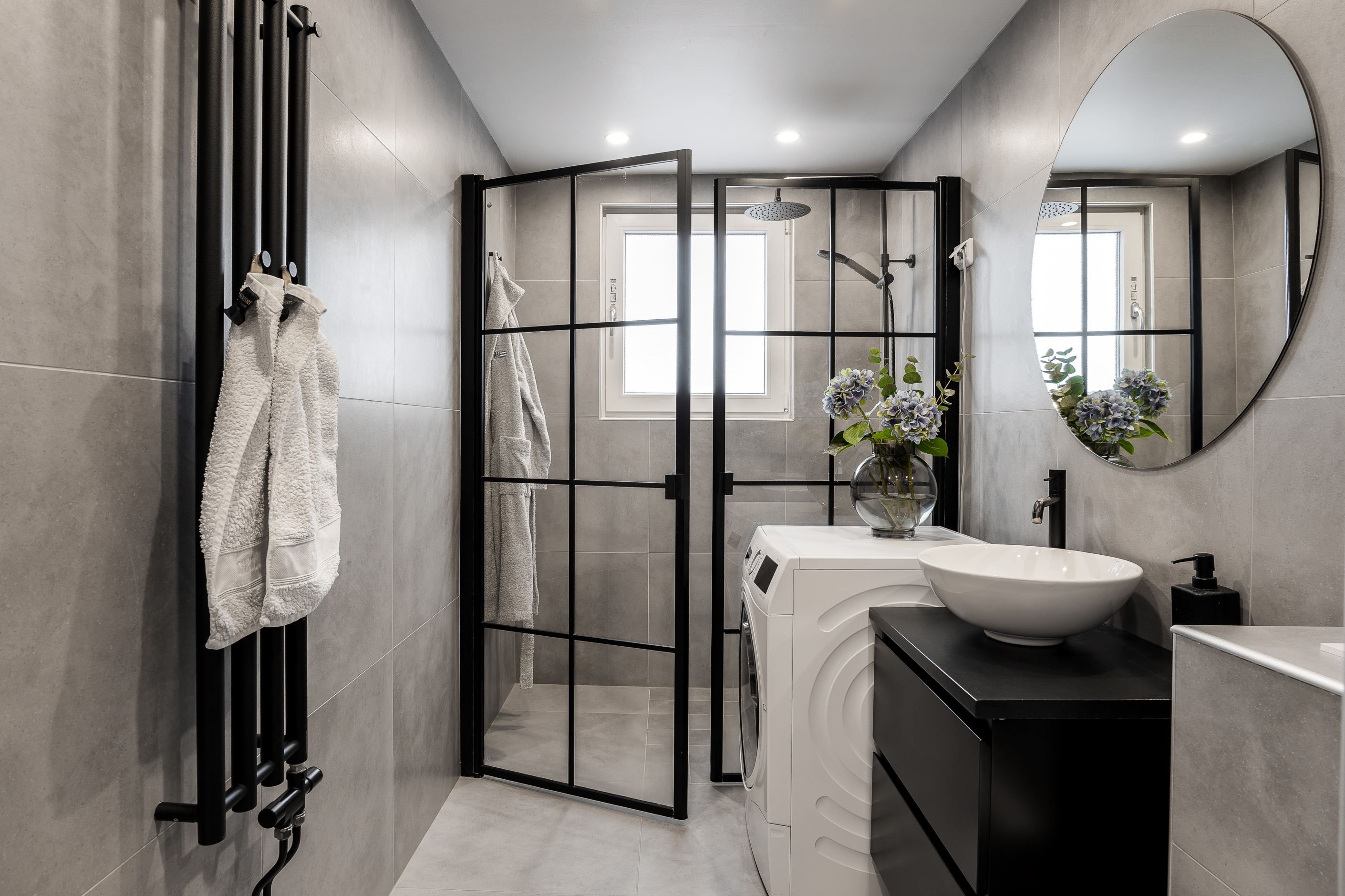 Exklusiva materialval möter genomtänkt design: ett stilrent kök med bänkskiva och stänkskydd i kompositsten, enhetliga enstaviga golv, garderober och ett renoverat, helkaklat duschrum med tvättmaskin.
