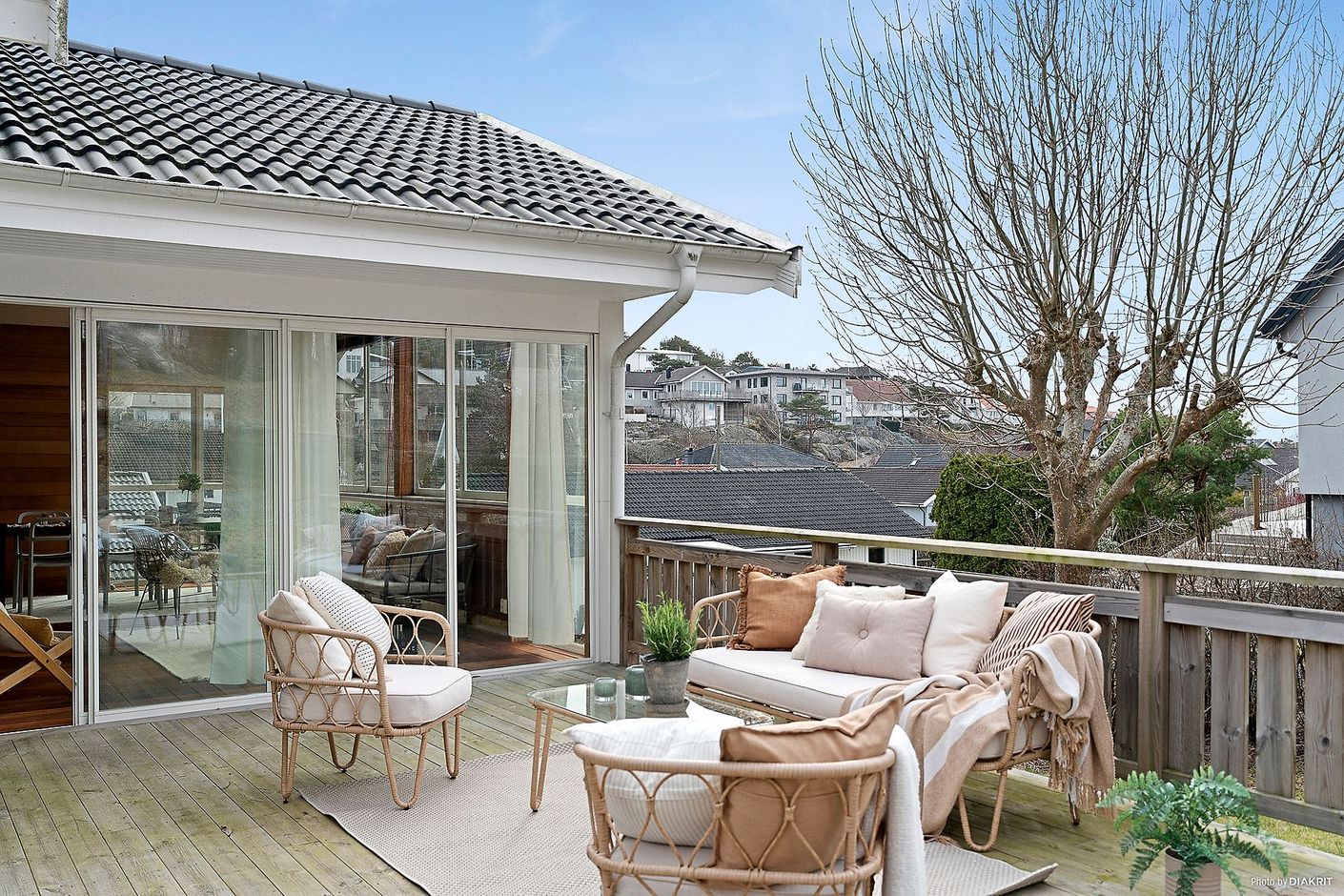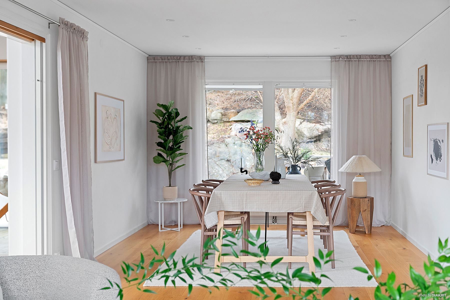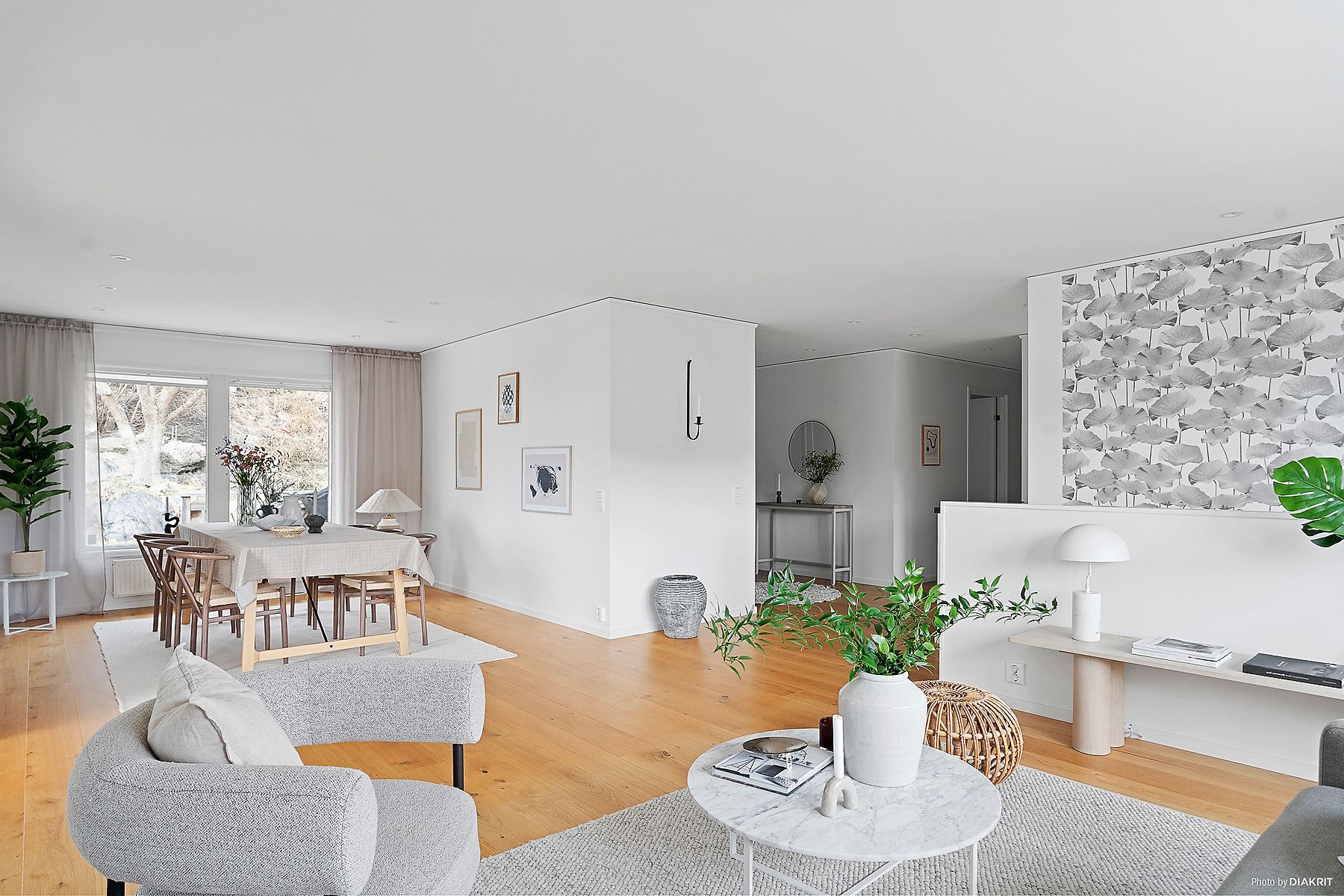 Entréplanet präglas av ljus och rymd med stora fönsterpartier som släpper in rikligt med dagsljus och skapar en härlig kontakt med omgivningen. Här finns generösa sociala ytor där kök och vardagsrum samspelar på ett naturligt sätt – perfekt för både vardagsliv och sociala tillställningar. Från bostaden nås även en härlig altan samt ett inglasat uterum som förlänger säsongen och erbjuder en fantastisk plats att njuta av utsikten året runt.