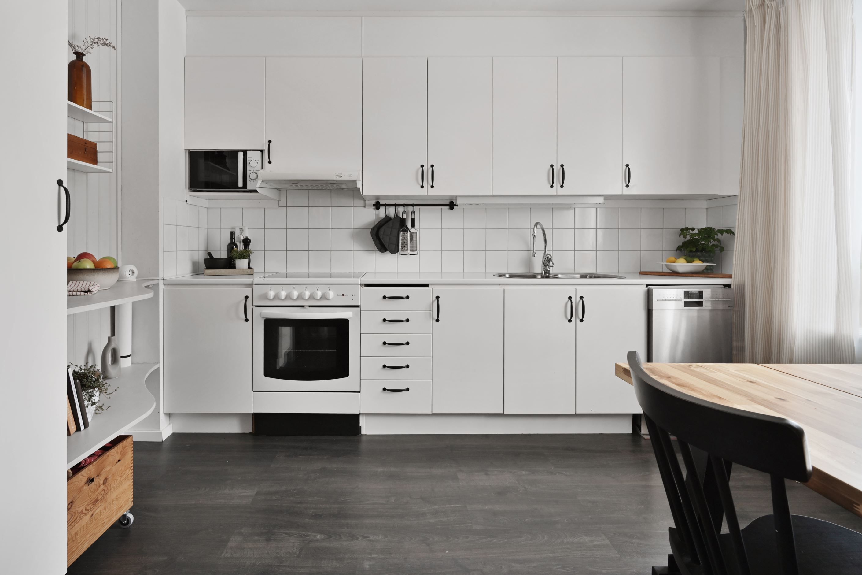 Köket är modernt och praktiskt utformat med goda arbetsytor och generöst med förvaring, utrustat med fullstor kyl och frys, spis med ugn, fläkt samt diskmaskin. Här finns dessutom plats för matbord, vilket gör köket till en naturlig plats för både vardagsmiddagar och sociala stunder.