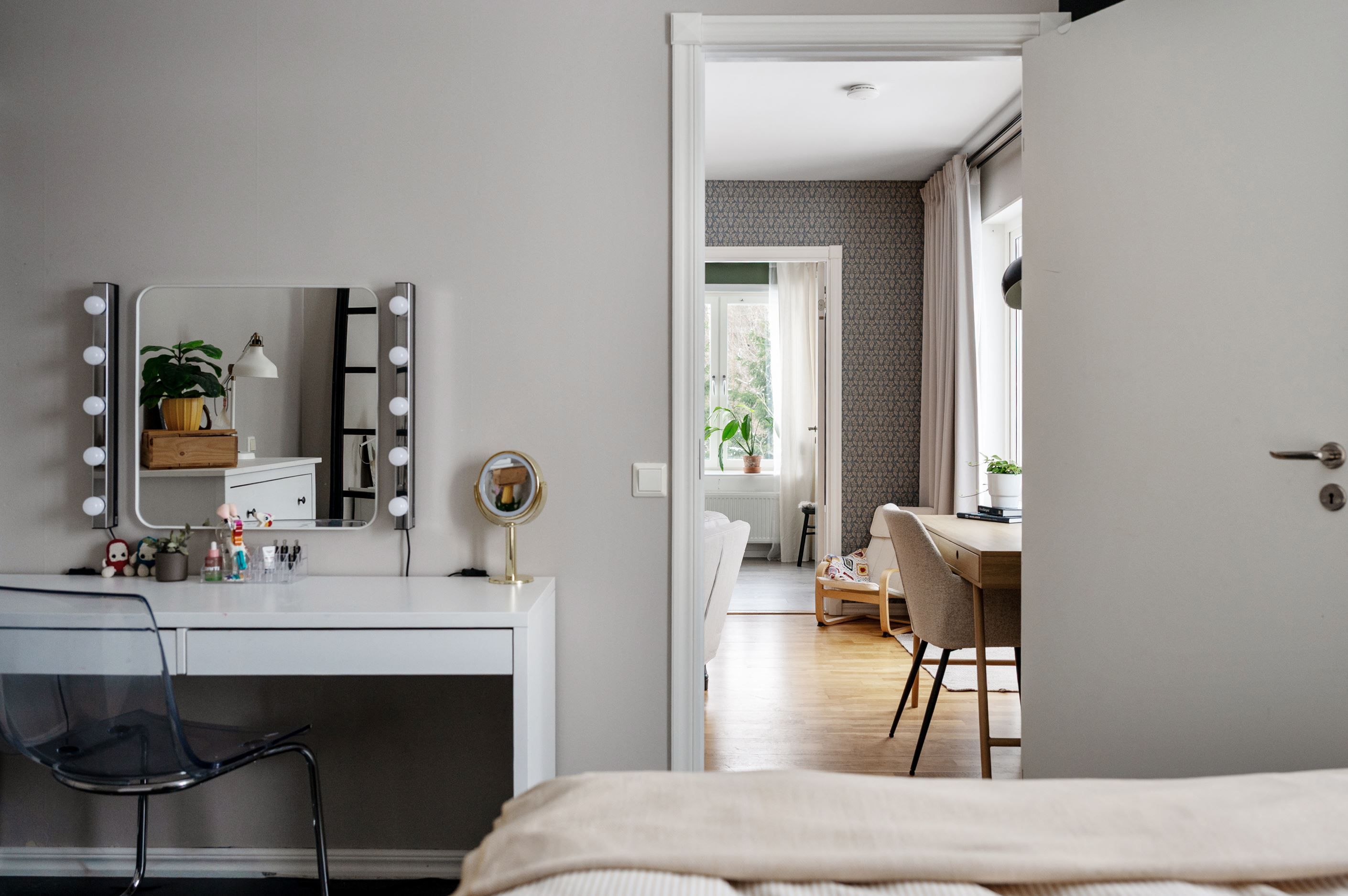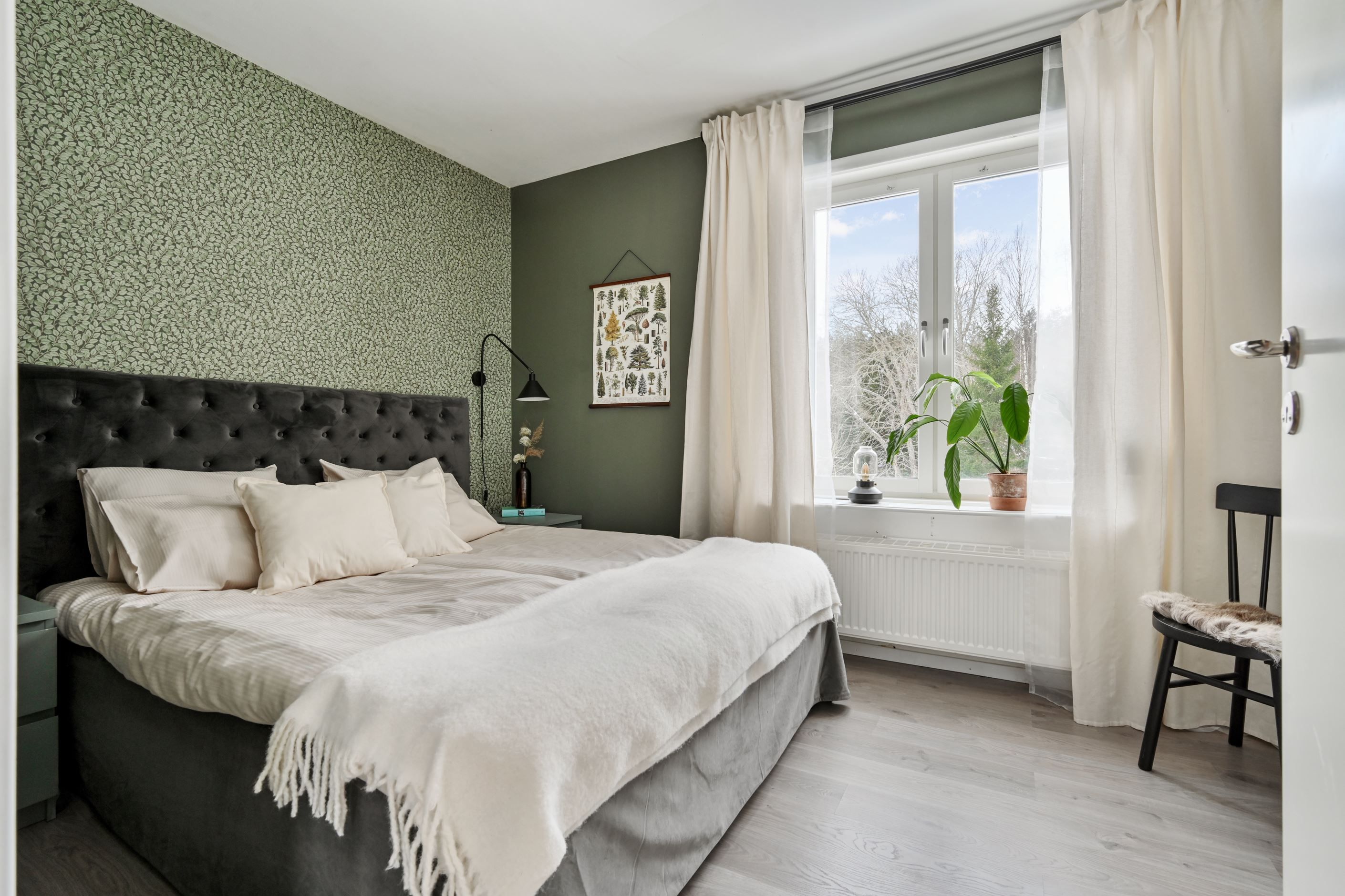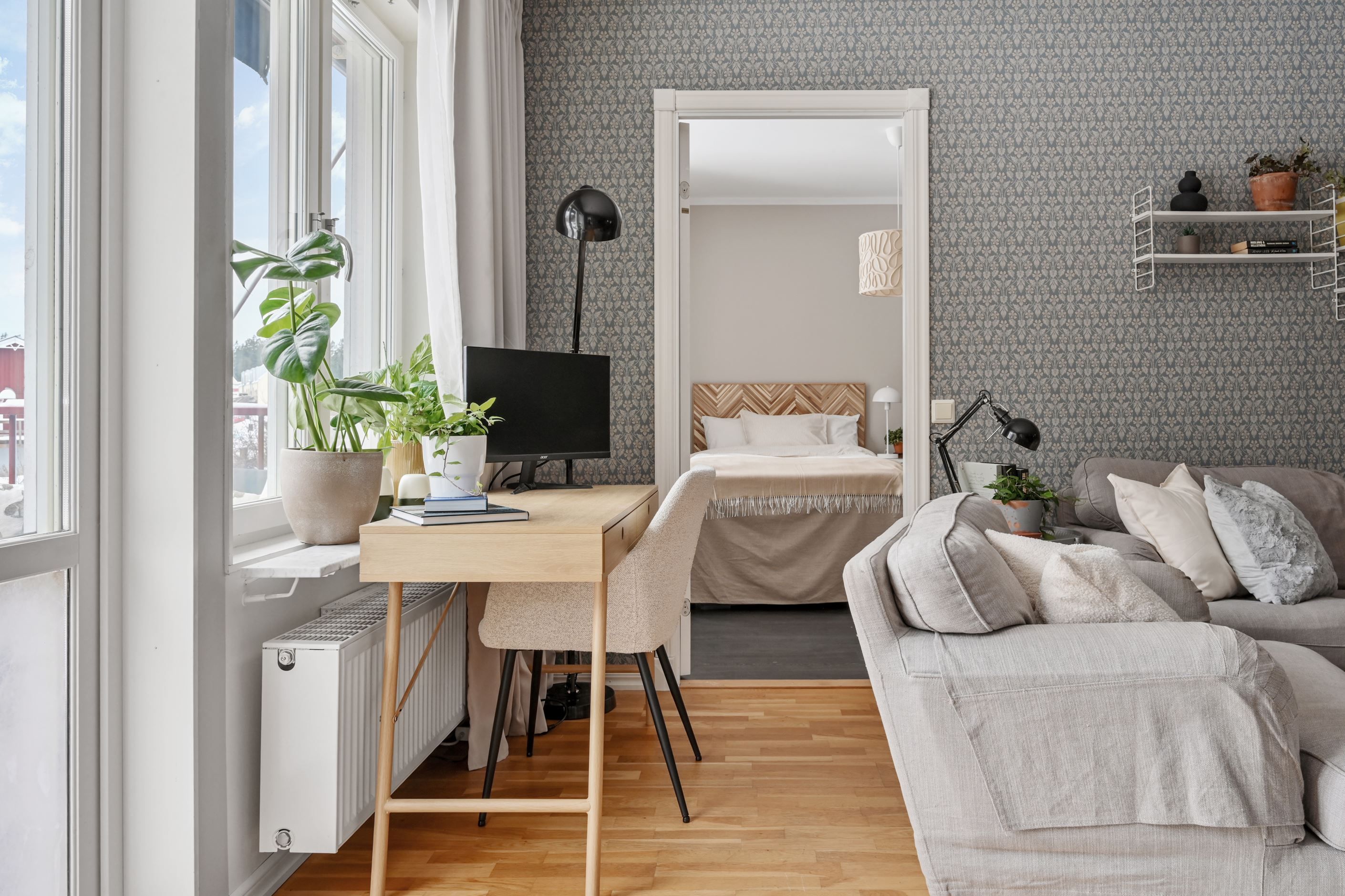 Från vardagsrummet nås bostadens två sovrum som erbjuder flexibla ytor för såväl barnrum, gästrum som hemmakontor.