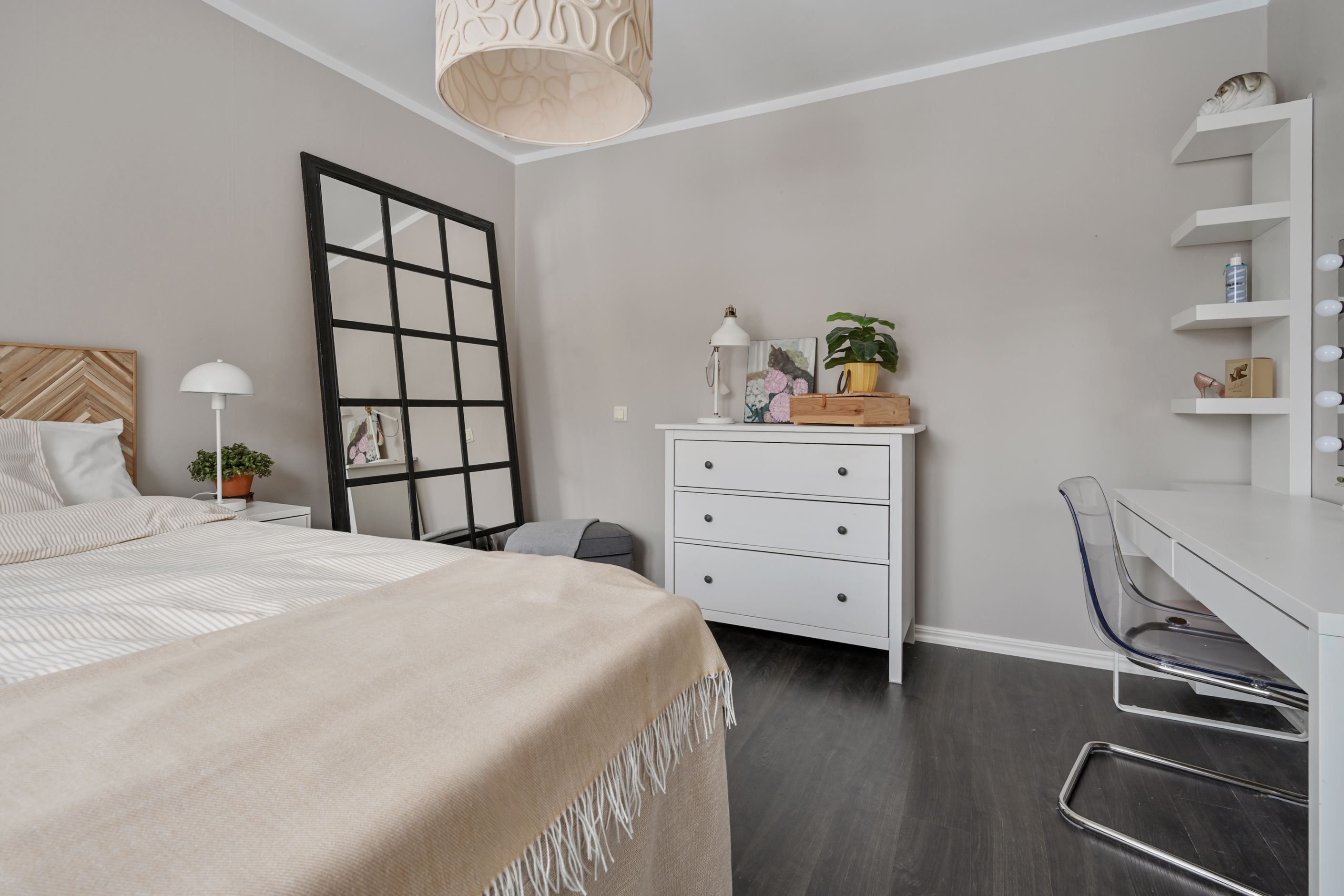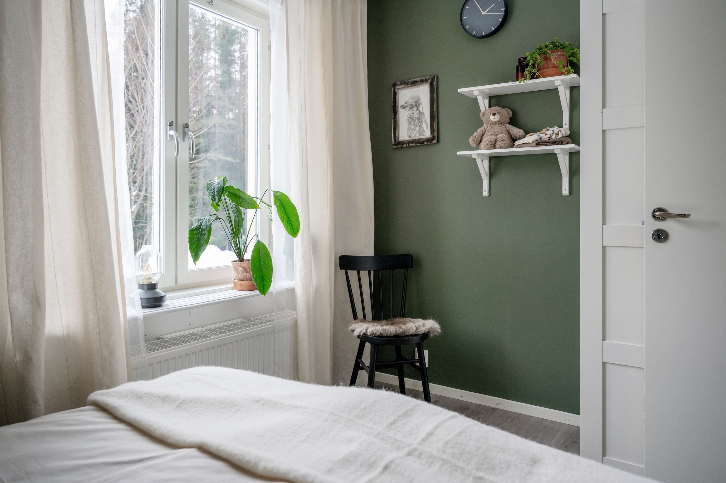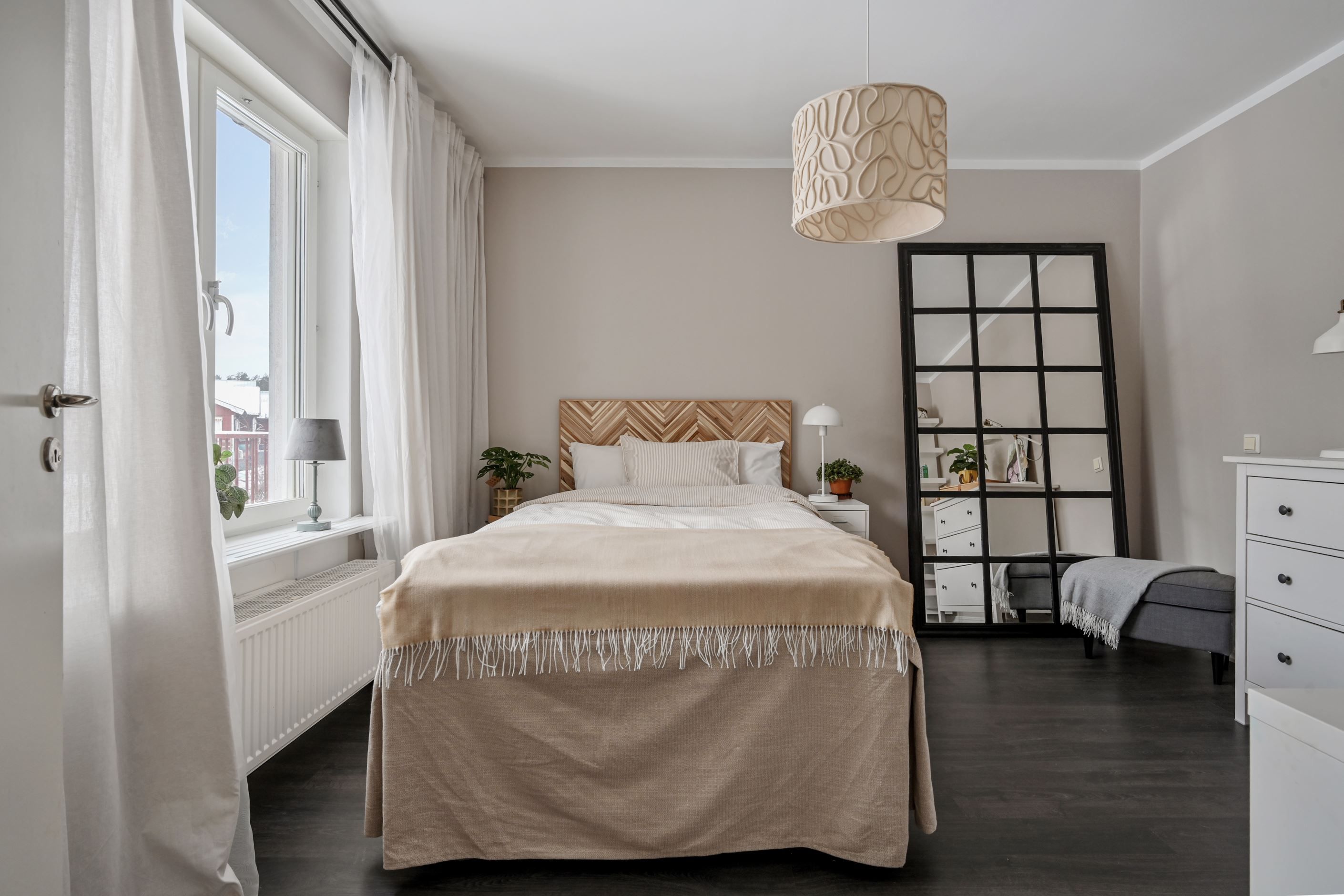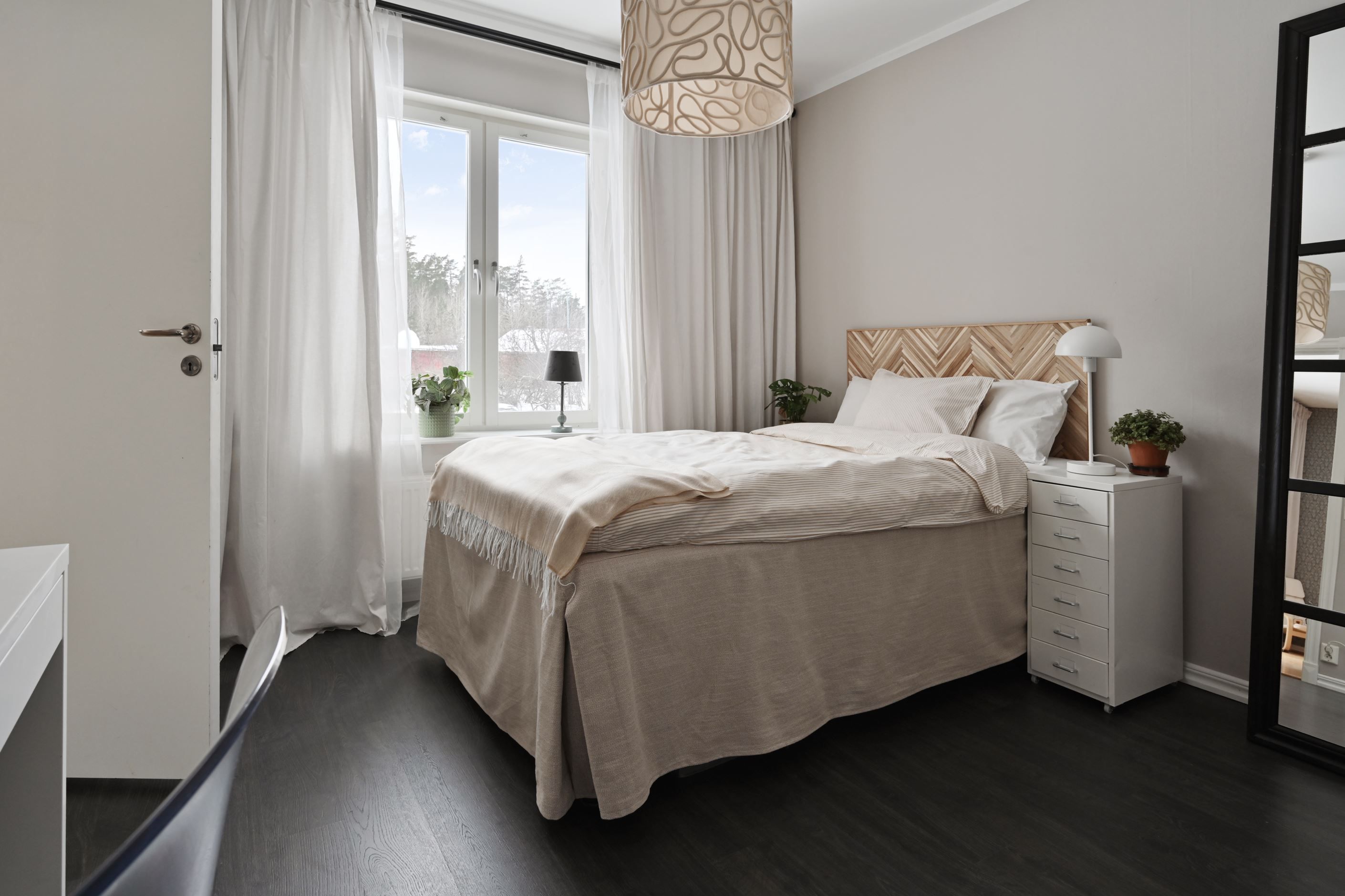 Från vardagsrummet nås bostadens två sovrum som erbjuder flexibla ytor för såväl barnrum, gästrum som hemmakontor.