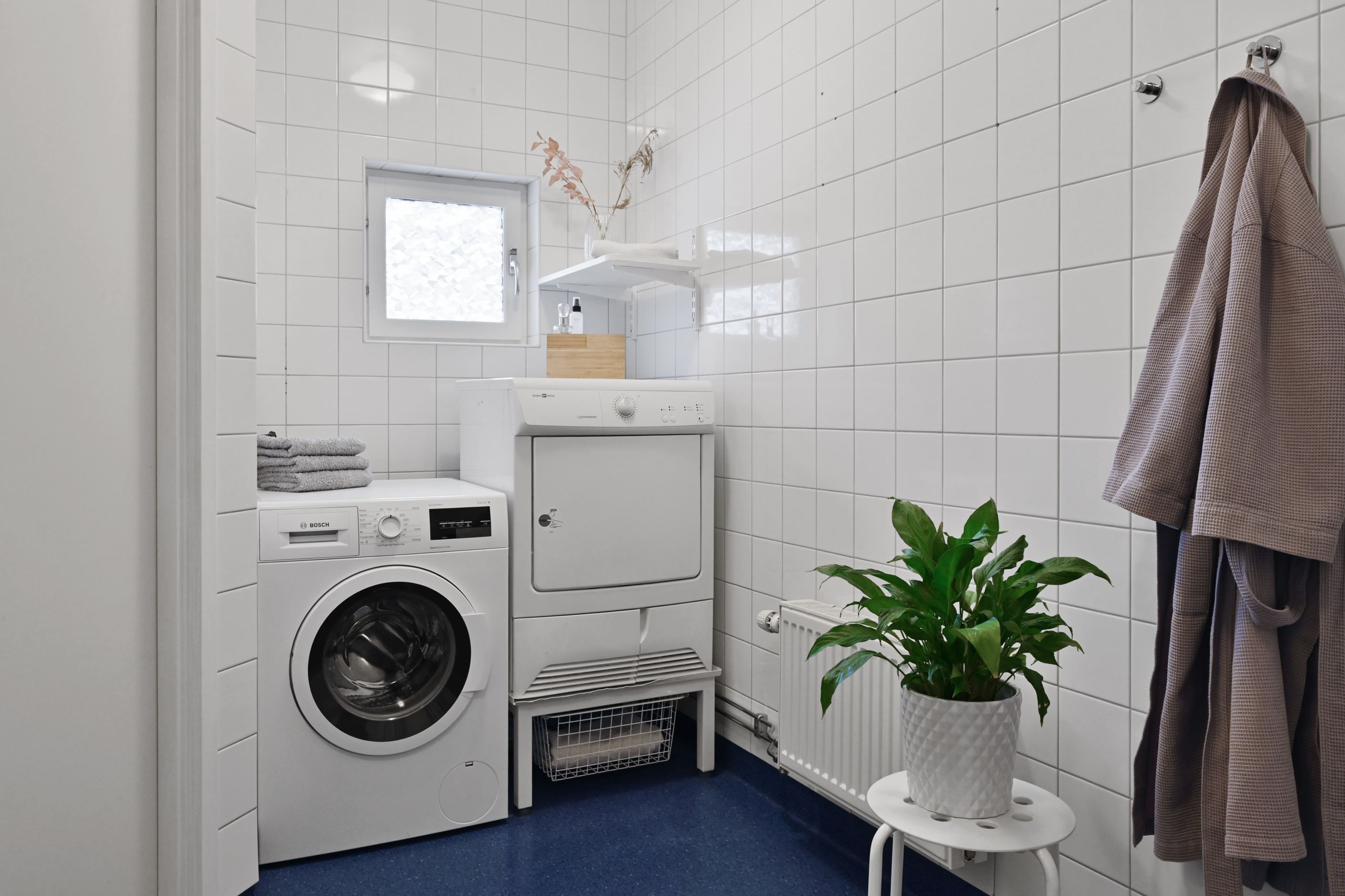 Badrummet är väl tilltaget och funktionellt med duschhörna, wc, handfat och spegelskåp samt en egen tvätthörna med både tvättmaskin och torktumlare, vilket ger en bekväm vardag utan behov av gemensam tvättstuga.
