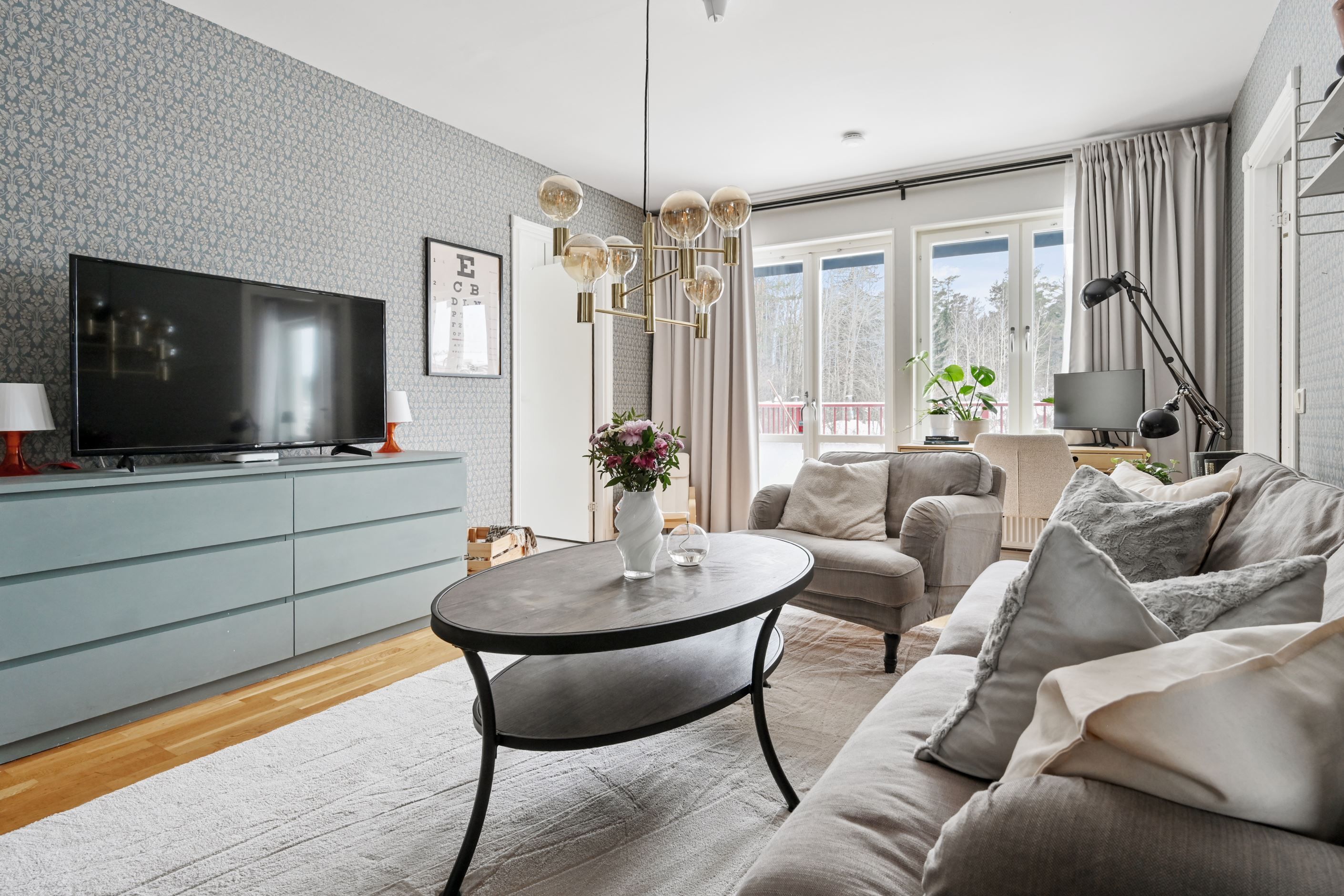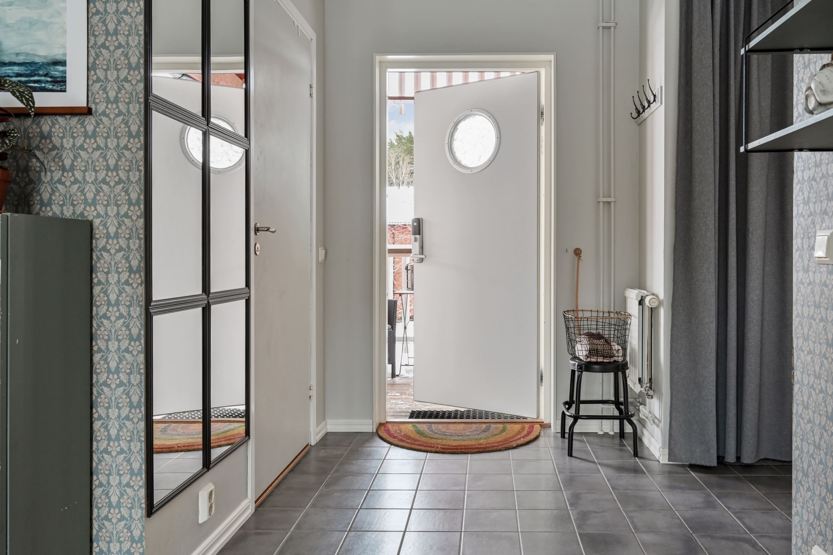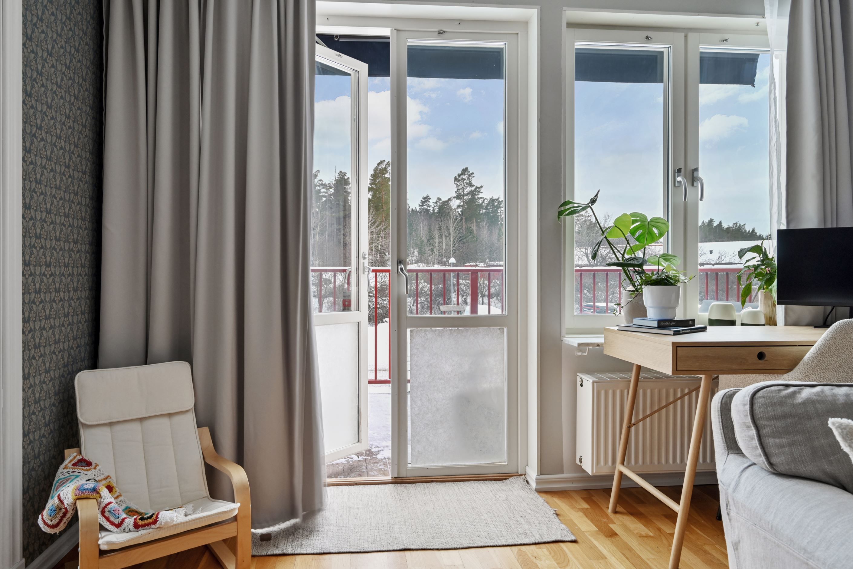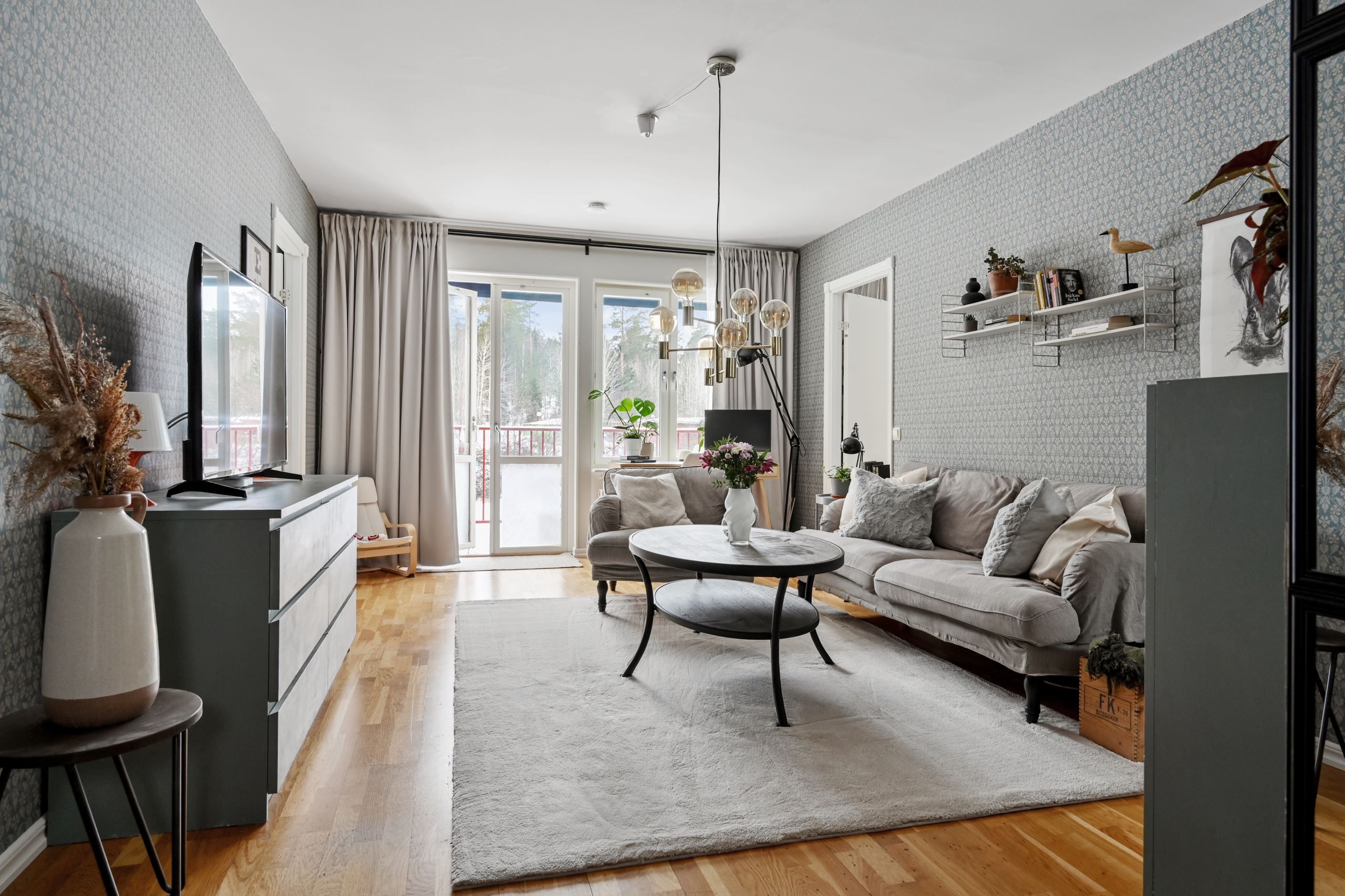 Väl innanför ytterdörren möts man av en rymlig hall med slitstarkt klinkergolv och gott om plats för avhängning. Planlösningen är genomtänkt och inbjudande med ett ljust vardagsrum som naturlig samlingspunkt. Härifrån nås balkongen. De stora fönsterpartierna ger ett fint ljusinsläpp och skapar en luftig och trivsam känsla.