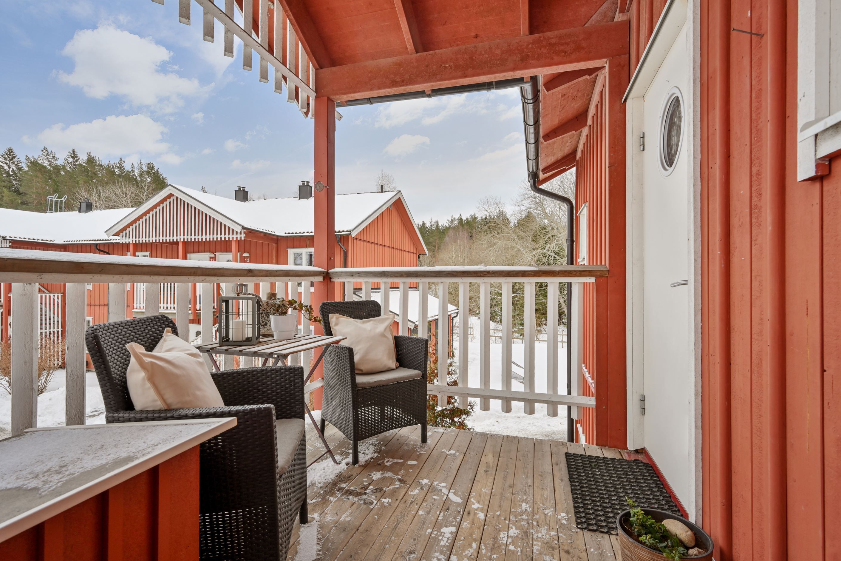 Vid husets entré finns ytterligare en uteplats som ger extra möjligheter att njuta av solen och den gröna omgivningen.