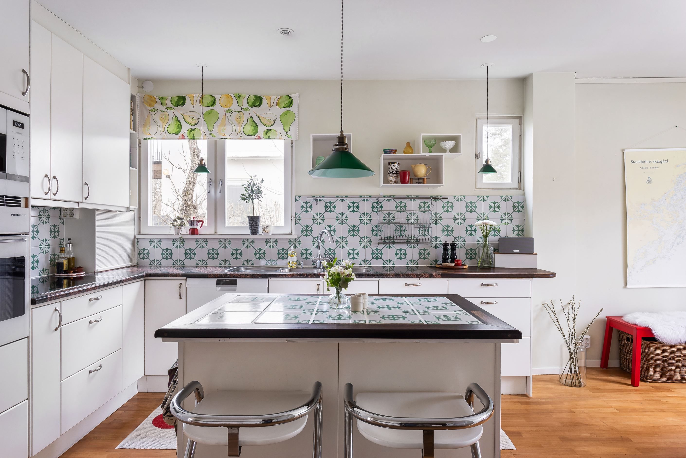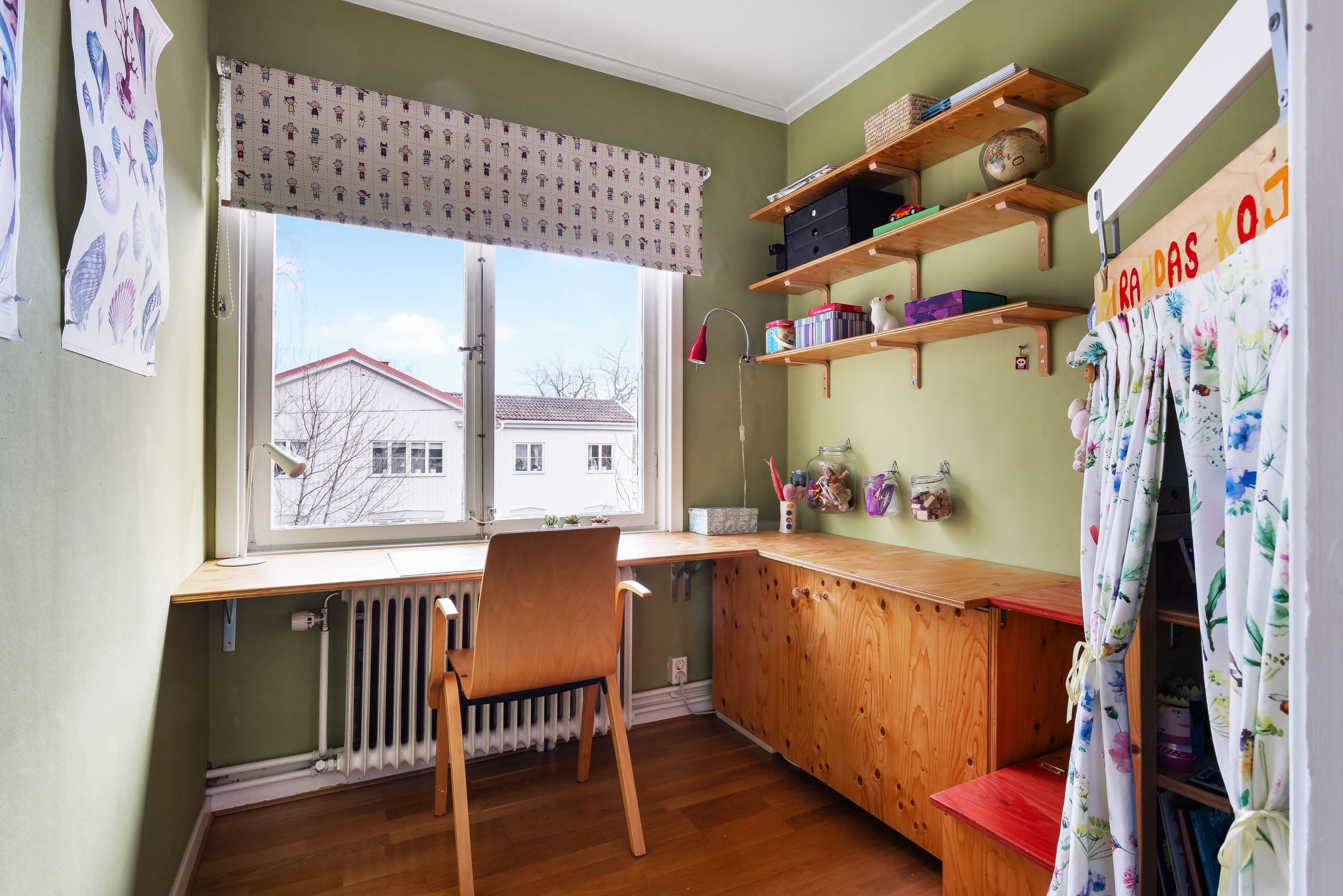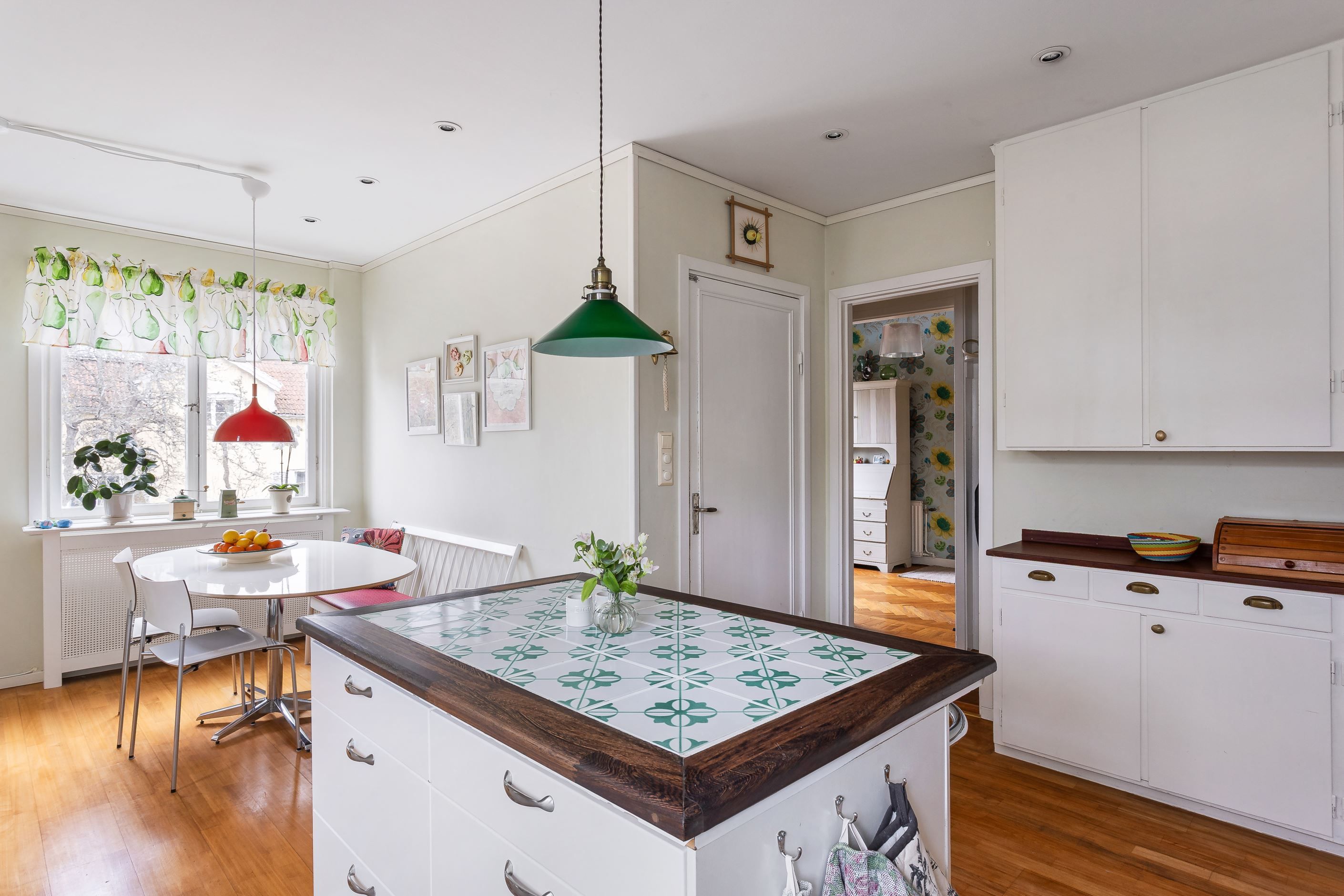 På entréplanet ryms vidare ett kök med gott om förvaring och bra arbetsytor. Vita snickerier möter arbetsbänkarna i granit och trä. Köksö håller med extra förvaring samt arbetsyta. Plats för matbord invid fönster. Fönster i två väderstreck. Trägolv.