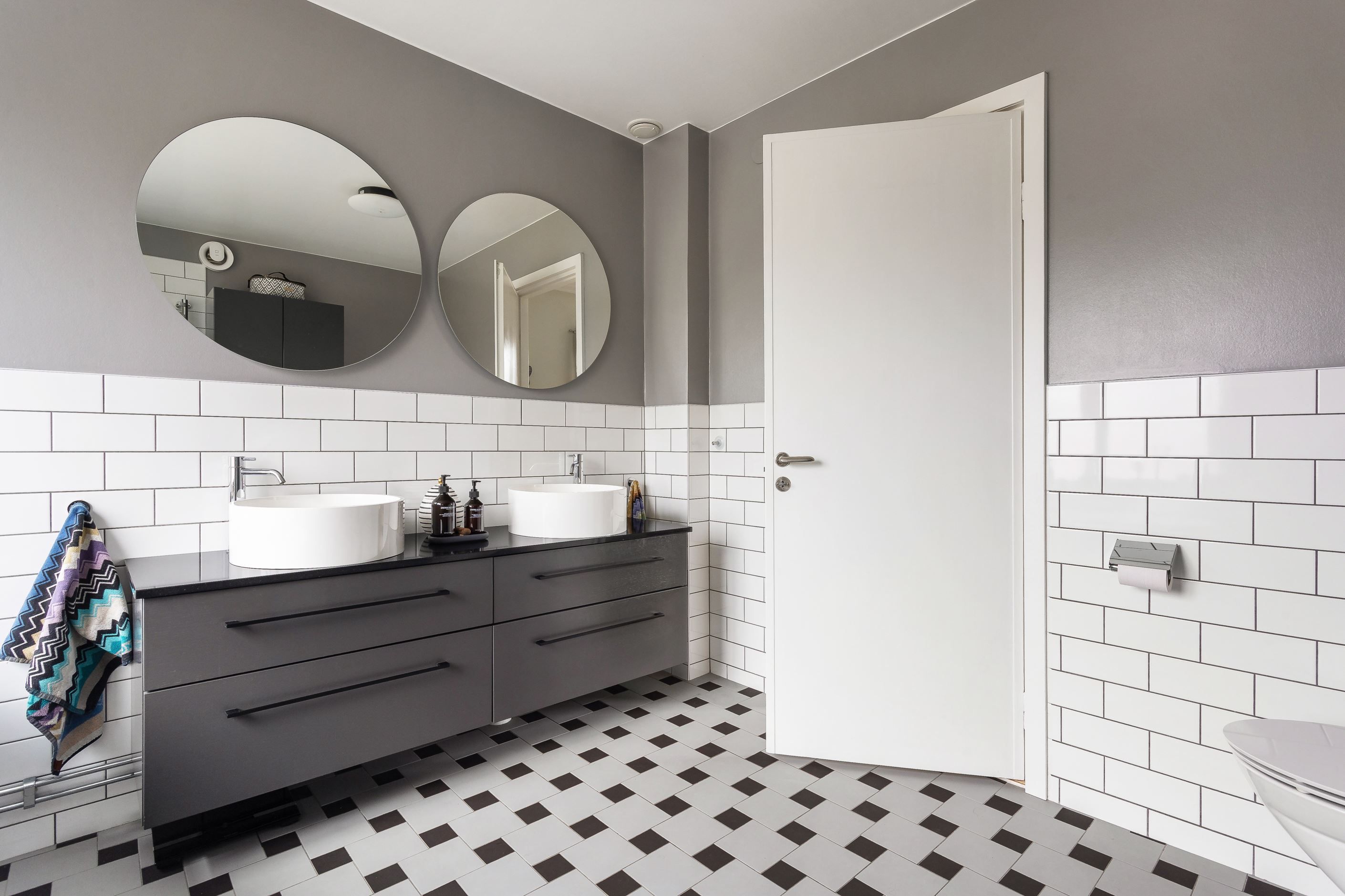 Ett kaklat badrum från 2021 med dubbla handfat i kommod, badkar och dusch bakom glasade väggar samt fönster för dagsljus och vädring.