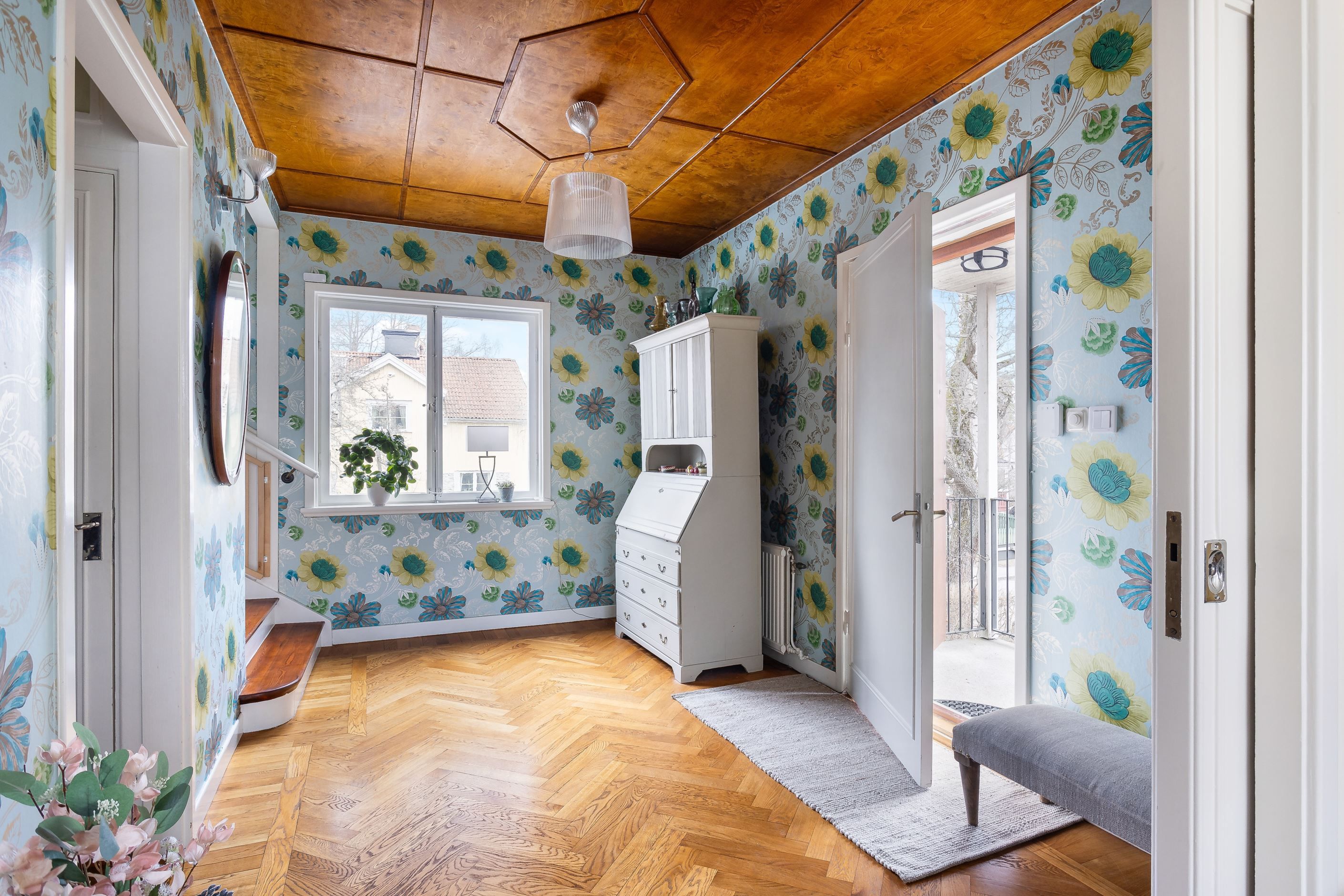 Därtill en möblerbar hall med förvaringsyta för ytterkläder. Stavlagda ekgolv och en vacker takdekoration.