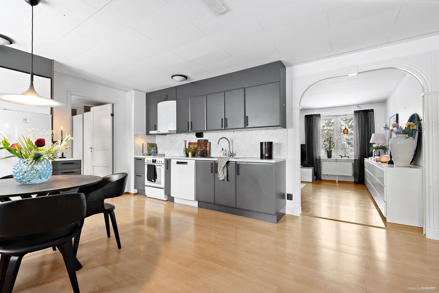 Välkommen till denna ljusa och trevliga lägenhet, perfekt för dig som söker ett bekvämt och stilrent boende. Belägen på entréplan erbjuder lägenheten en praktisk och funktionell planlösning. På övre plan finner du ett välutrustat kök med nya luckor från 2021 och en rymlig matplats, idealisk för både vardagsmåltider och middagar. Från köket leder en balkong ut över en lummig innergård, vilket ger en rofylld utsikt och skön plats för avkoppling.