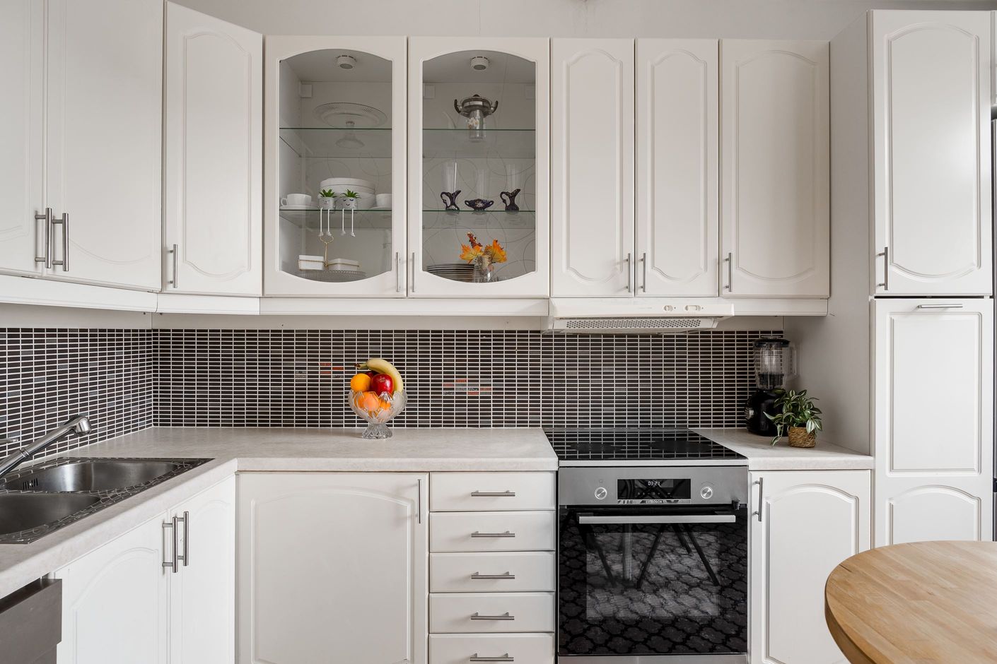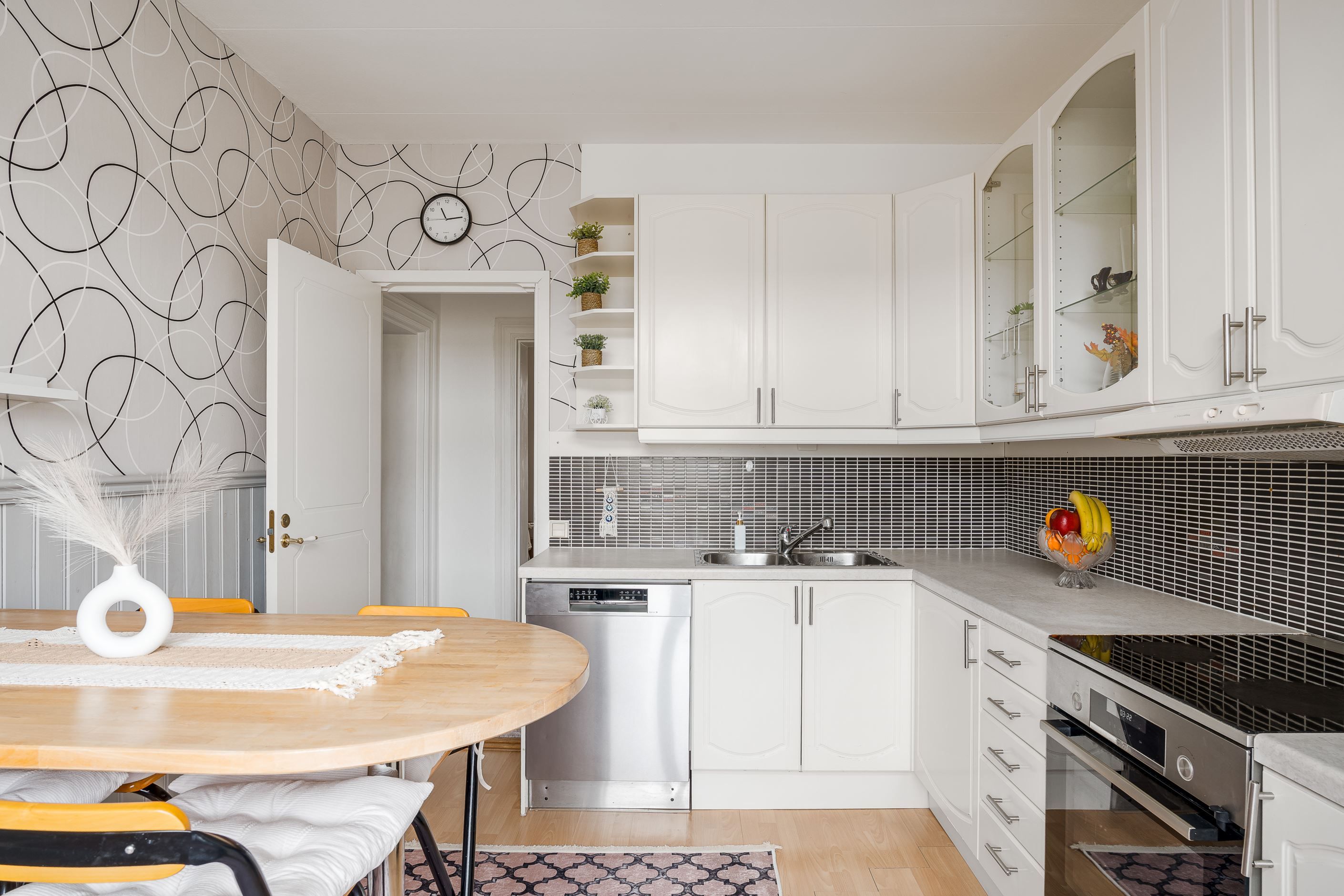 Lägenheten har en genomgående planlösning med fint ljusinsläpp från stora fönsterpartier. I vardagsrummet finns gott om plats för både soffgrupp och mediemöbel, och de ljusa väggarna tillsammans med det vackra trägolvet skapar en varm och inbjudande känsla. Köket är funktionellt och erbjuder bra arbetsytor samt förvaring i klassiska skåp. Här finns plats för matbord vid fönstret, vilket ger en naturlig samlingspunkt i hemmet.