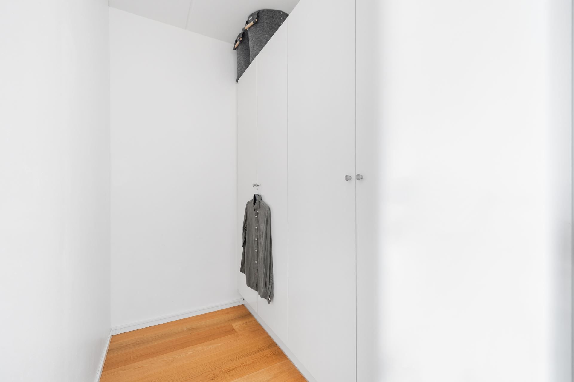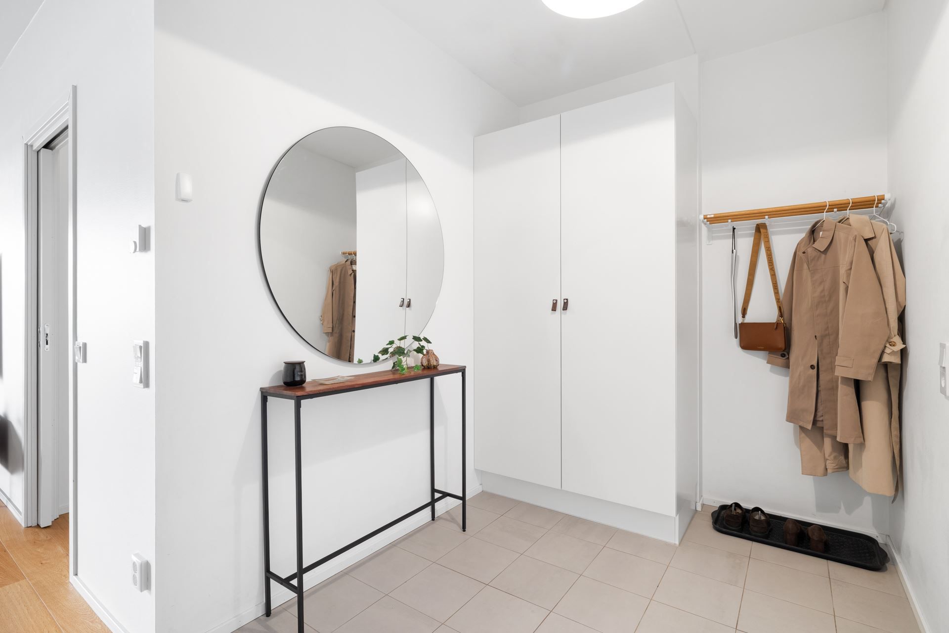 Invändigt präglas bostaden av enstavsparkett i samtliga rum, med behaglig golvvärme som enkelt kan regleras efter önskad temperatur. Hallen erbjuder gott om förvaring i form av både avhängningsyta och garderober.