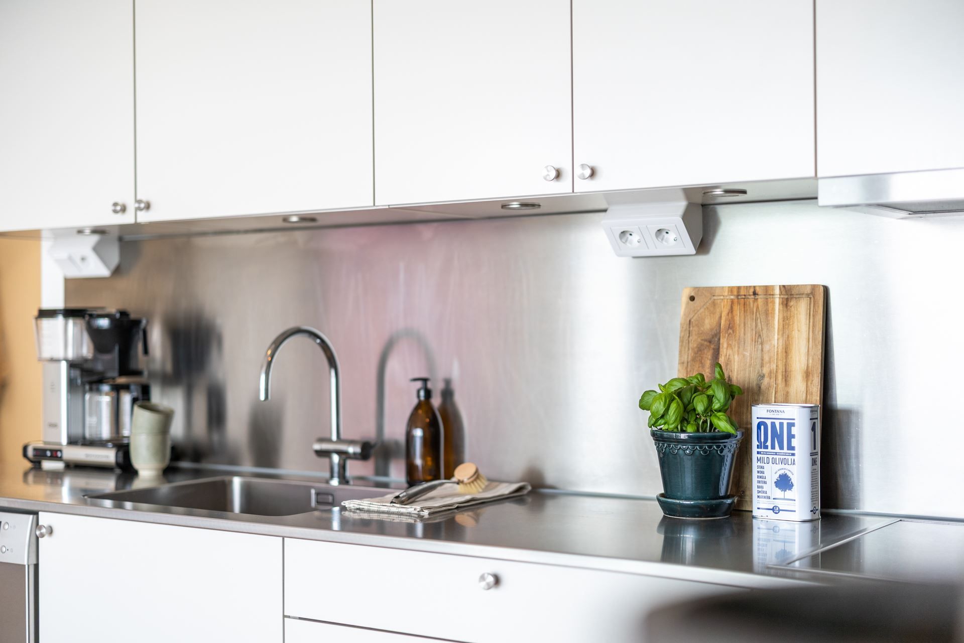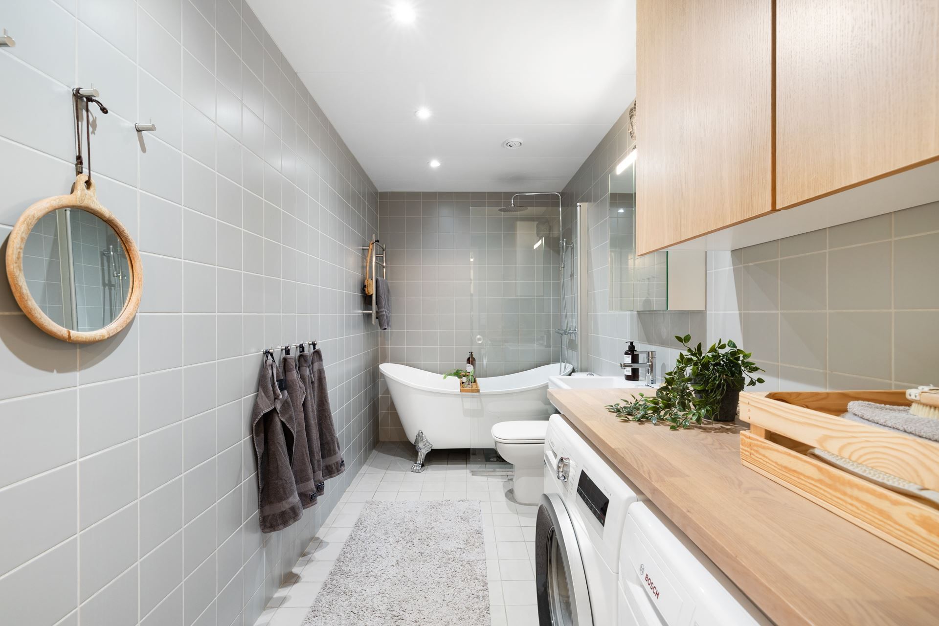 Badrummet är välutrustat med både tvättmaskin och torktumlare samt erbjuder bra arbetsytor och förvaring.