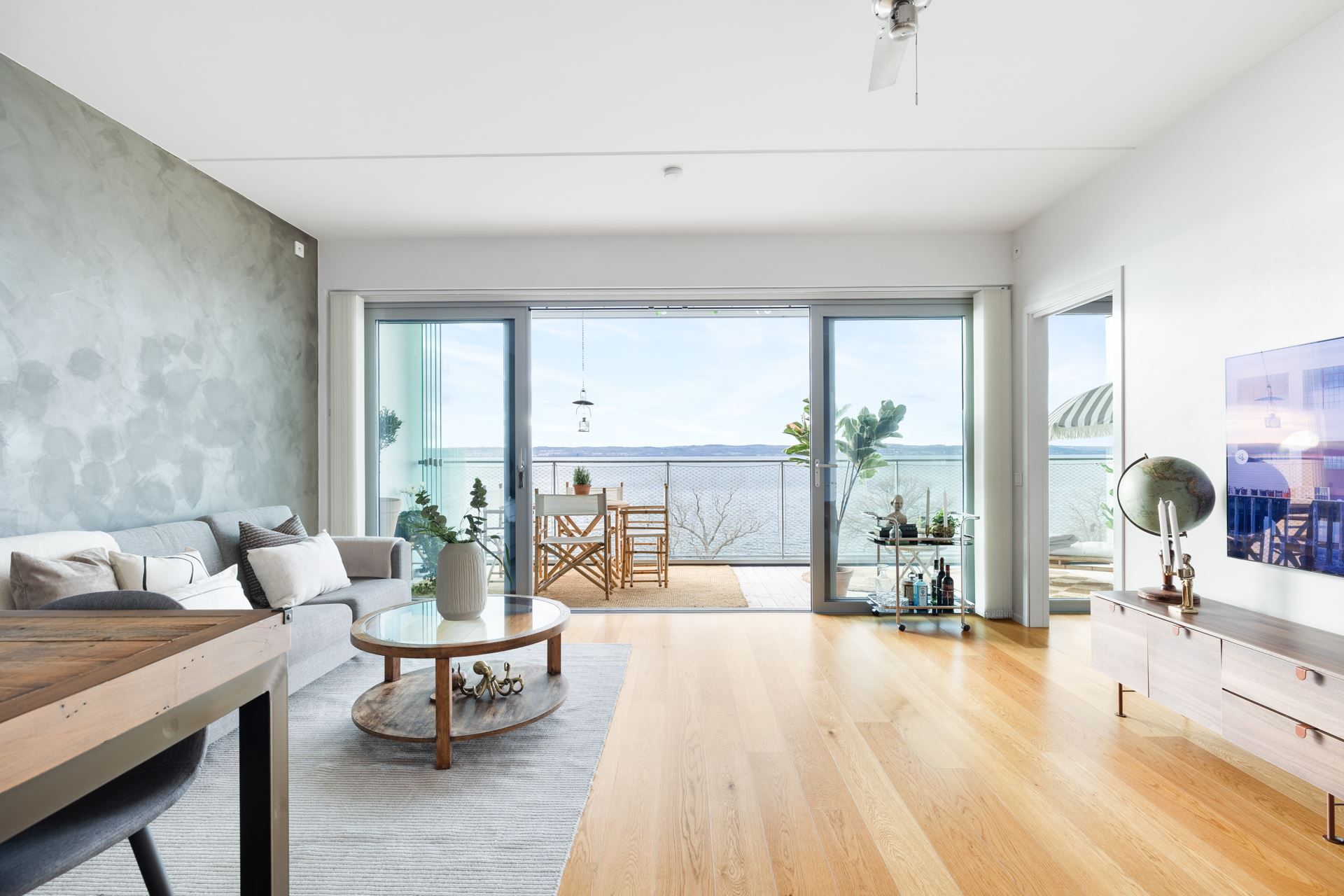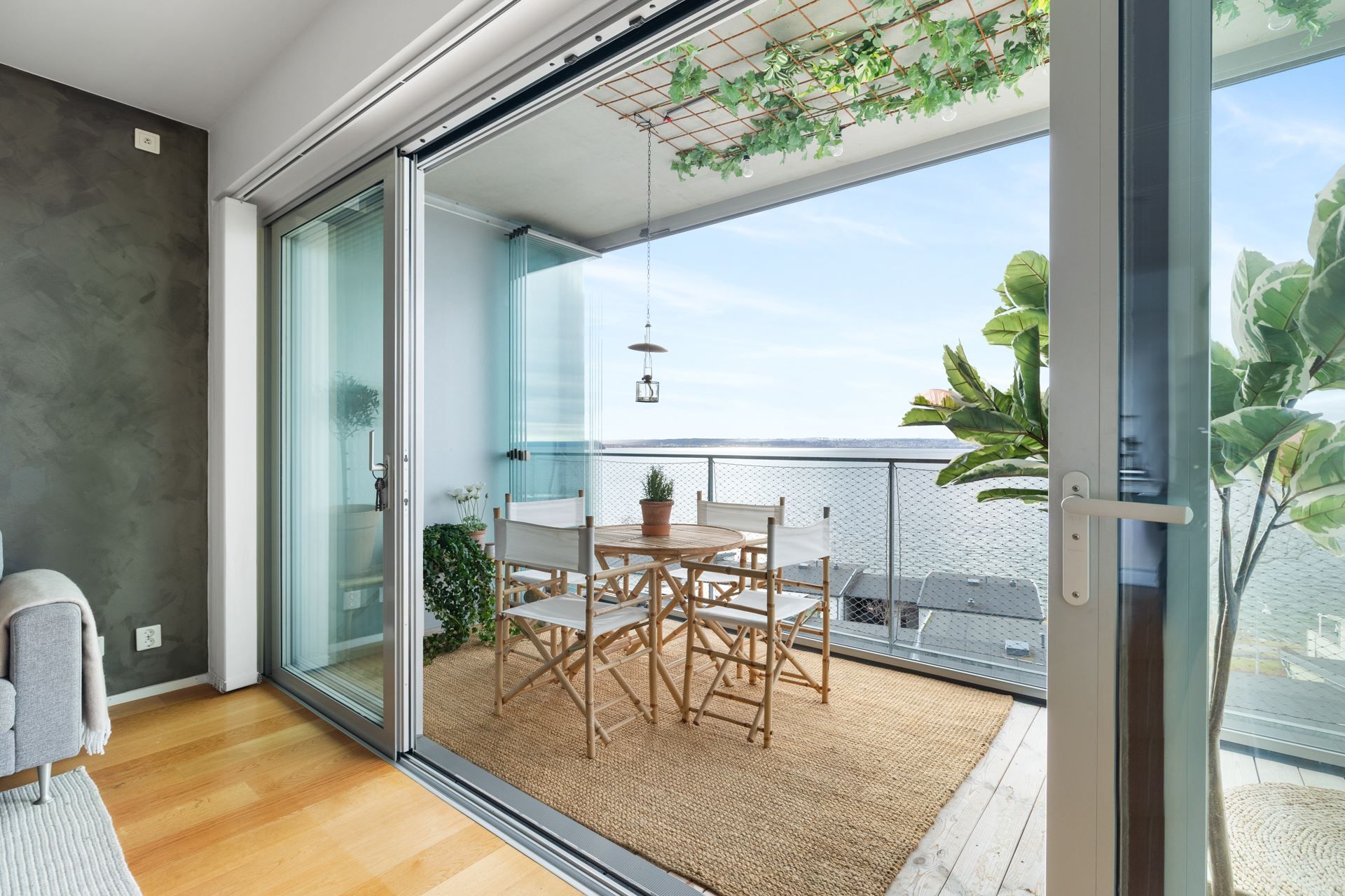 Vardagsrummet och köket ligger i en öppen planlösning där den fria utsikten över Vättern står i centrum. Det stora skjutdörrspartiet, som sträcker sig nästan från golv till tak, ger ett fantastiskt ljusinsläpp och skapar en härlig känsla av att sudda ut gränsen mellan inne och ute. Härifrån nås den rymliga balkongen om ca 15 kvadratmeter, där du erbjuds en obruten och hänförande utsikt över sjön som du kan nyttja från tidig vår till höst. Här finns gott om plats för både loungemöbler och matgrupp – en perfekt plats att njuta av såväl morgonkaffet som kvällens solnedgång.