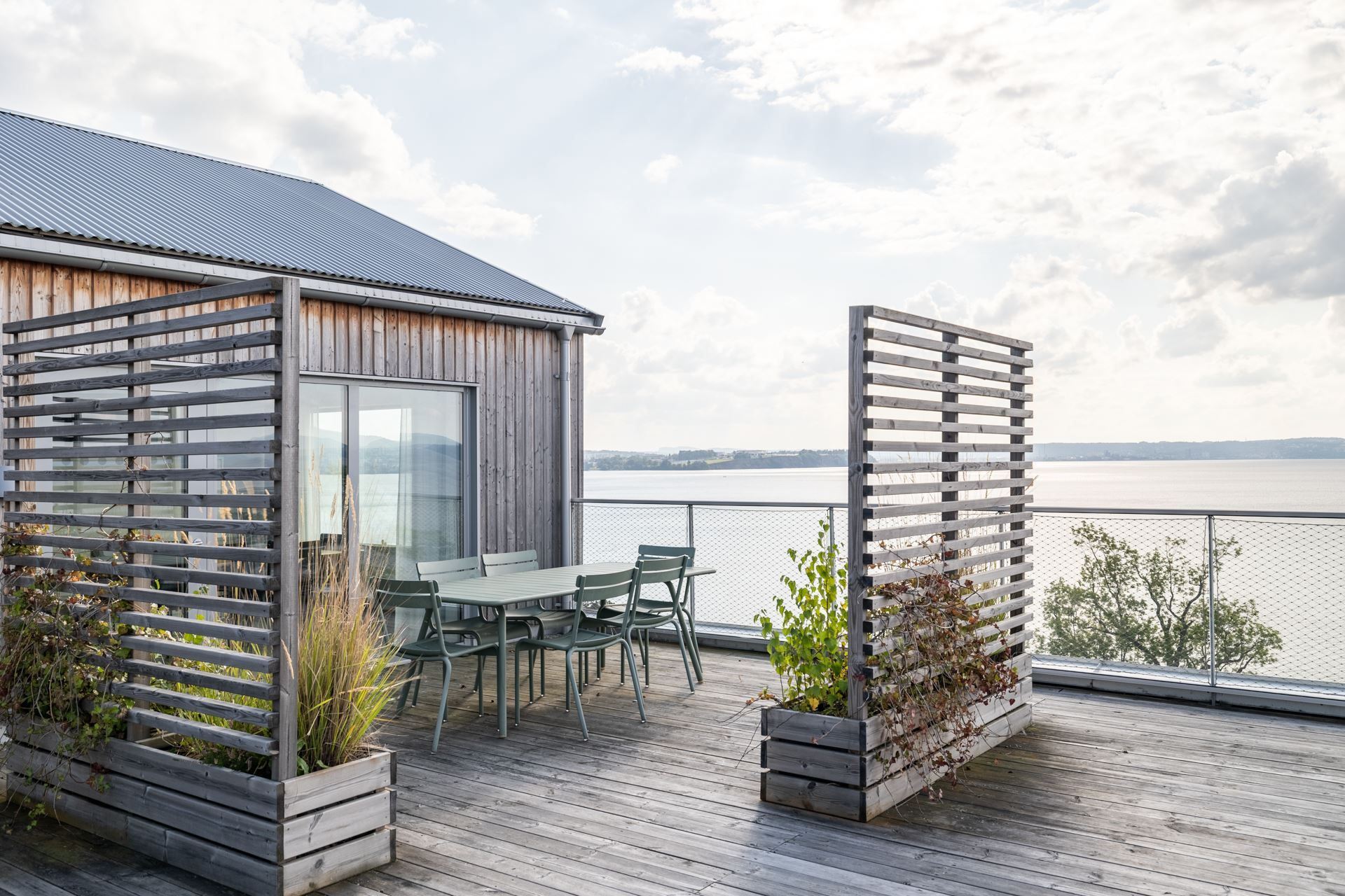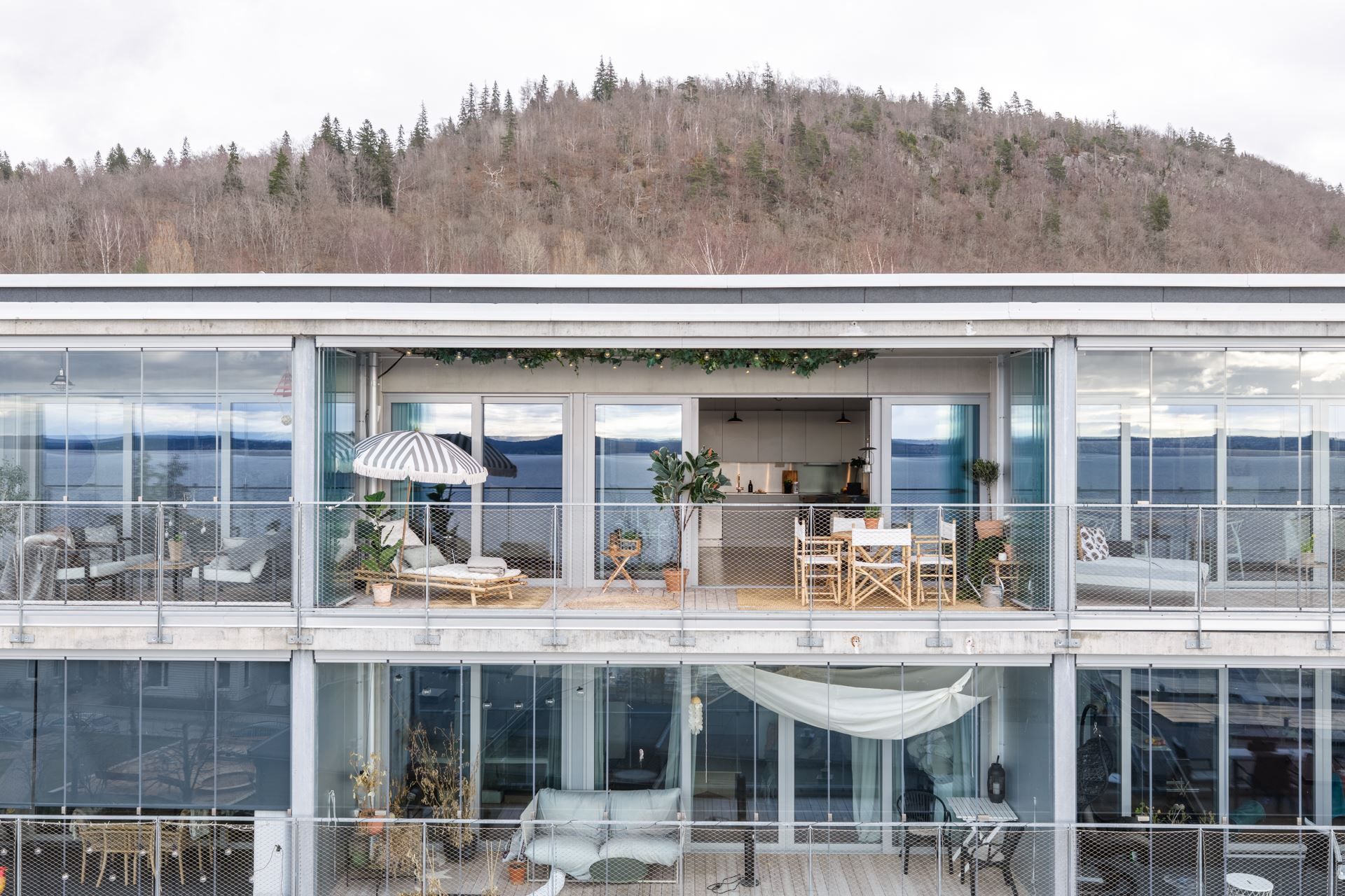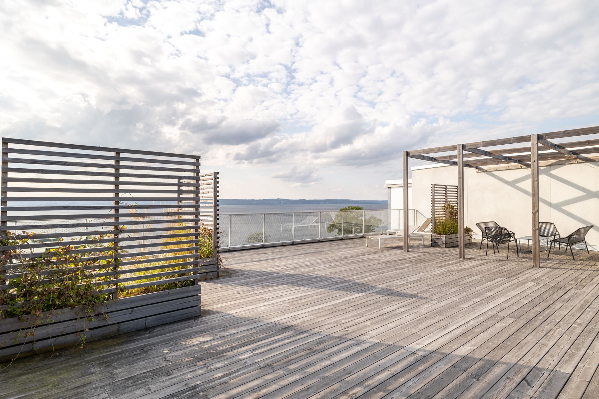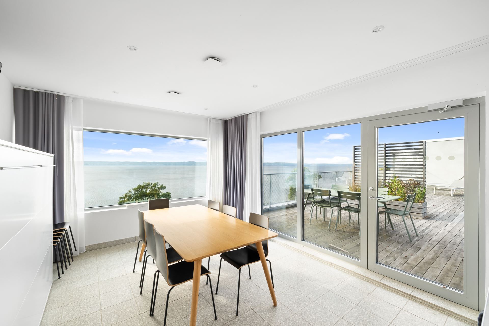 Här bor du högst upp i huset med en magisk utsikt över Vättern – tänk att få avsluta dagen med att njuta av den vackra solnedgången från din egen balkong.