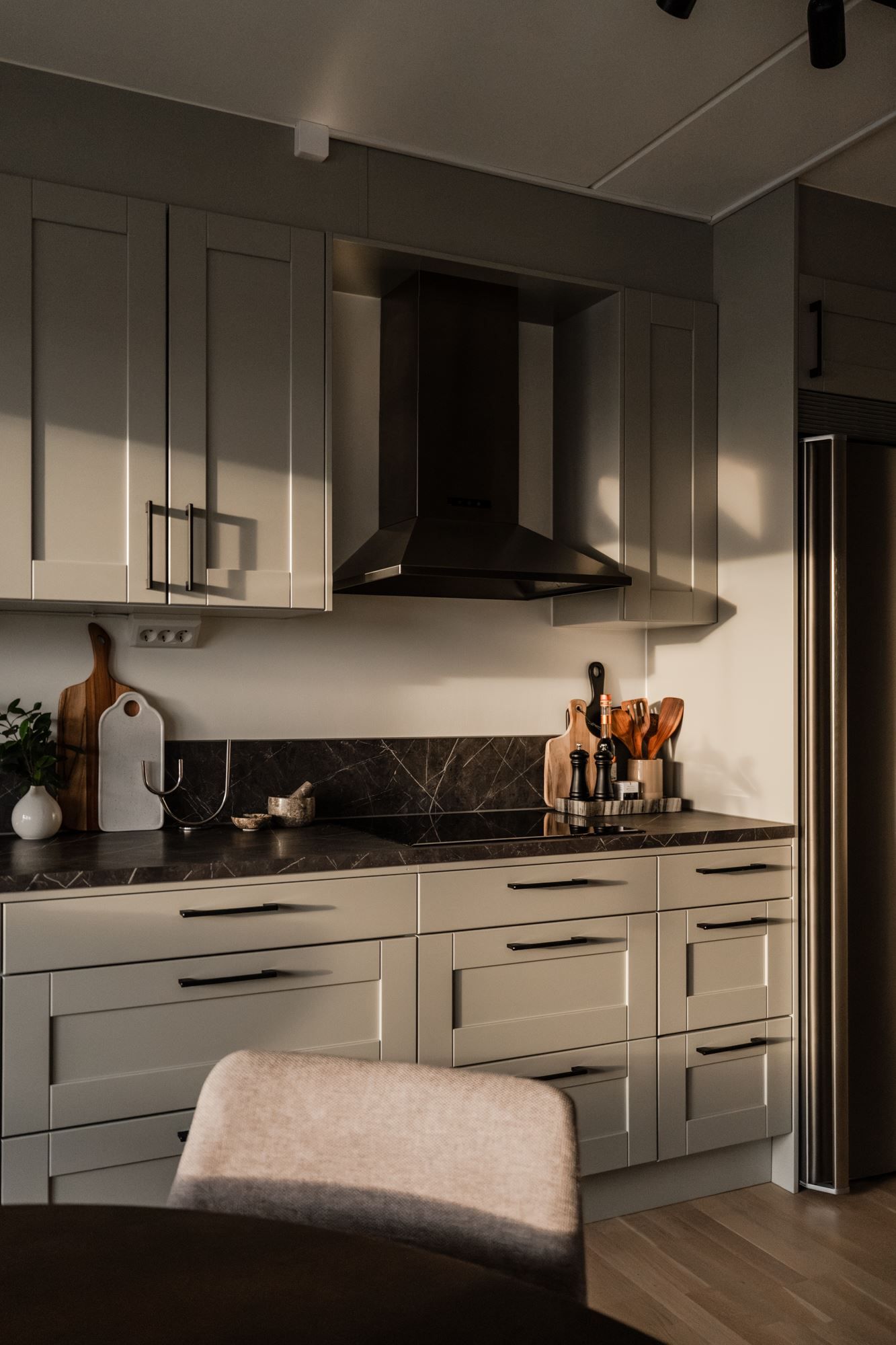 Köket kommer från Vedum och är utfört med sandfärgade skåpsluckor som ger ett harmoniskt och modernt intryck. Här finns goda arbetsytor och genomgående utrustning från Husqvarna, vilket skapar en funktionell och stilren helhet.