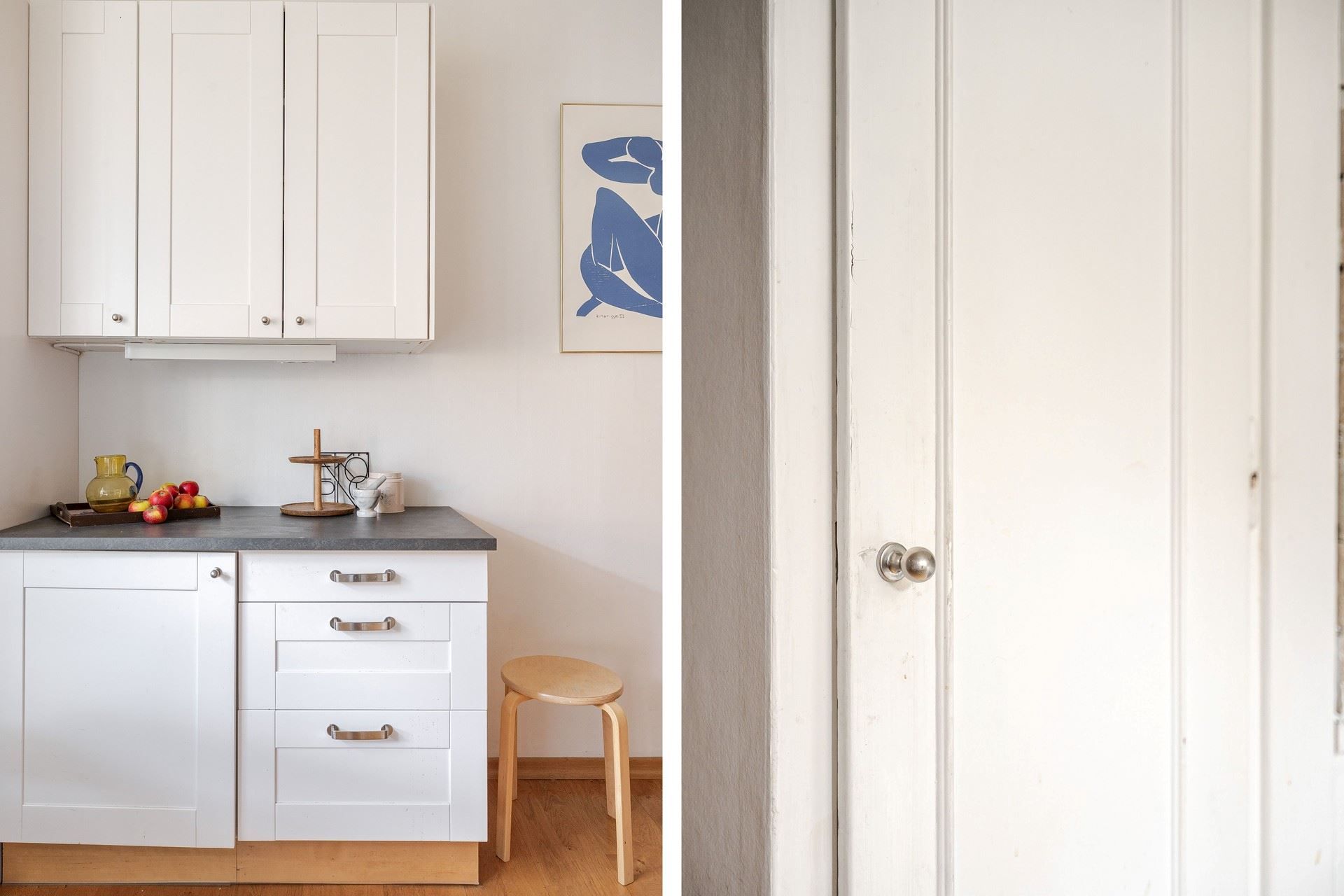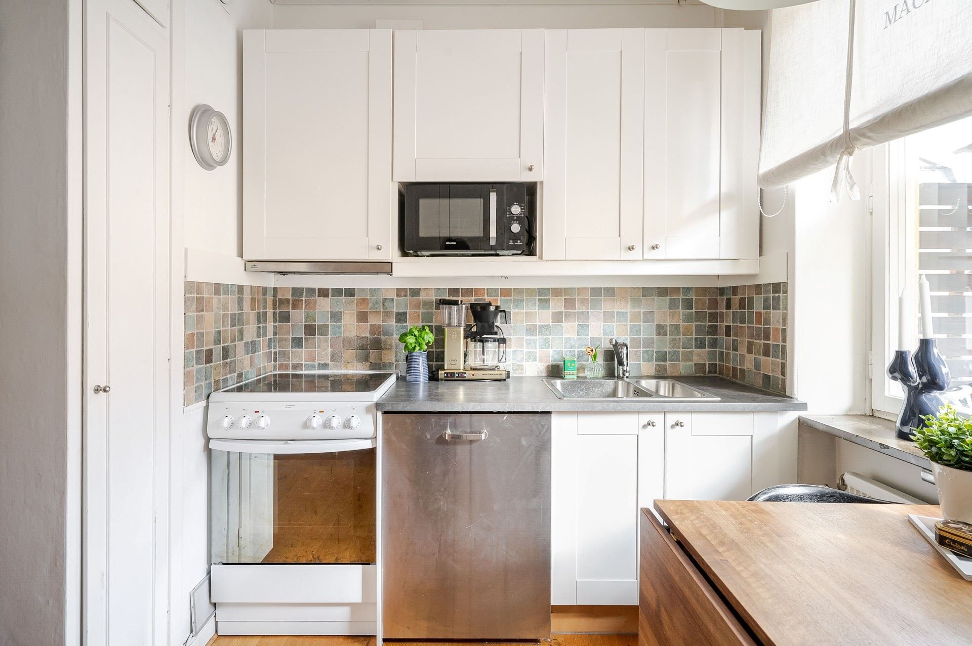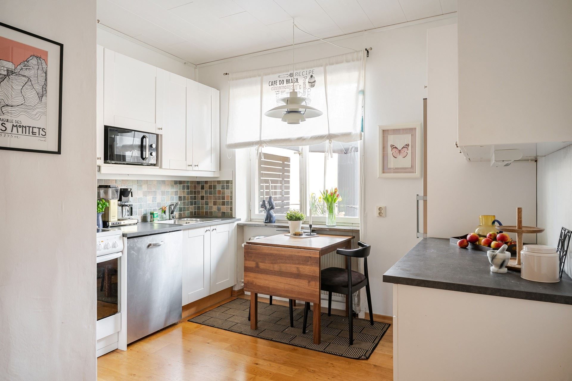 Köket är ombonat och välplanerat med ett större fönster som släpper in fint ljus. Här finns plats för matbord och goda förvaringsmöjligheter bakom vita luckor, tillsammans med generösa arbetsytor som underlättar i vardagen.