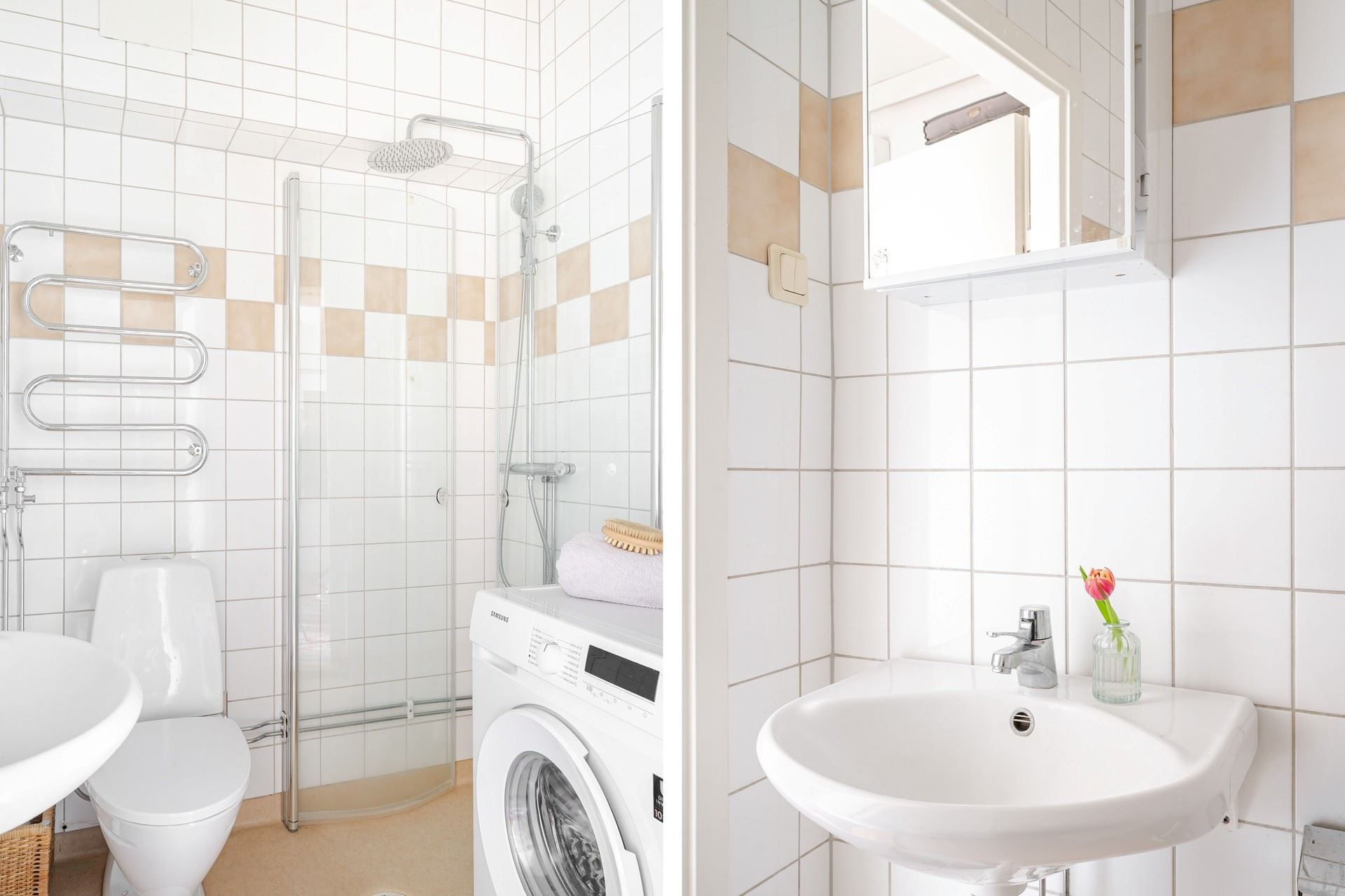 Badrummet är helkaklat och stilrent. Här finns dusch med glasväggar, handfat med kommod och spegelskåp samt egen tvättmaskin för extra bekvämlighet.