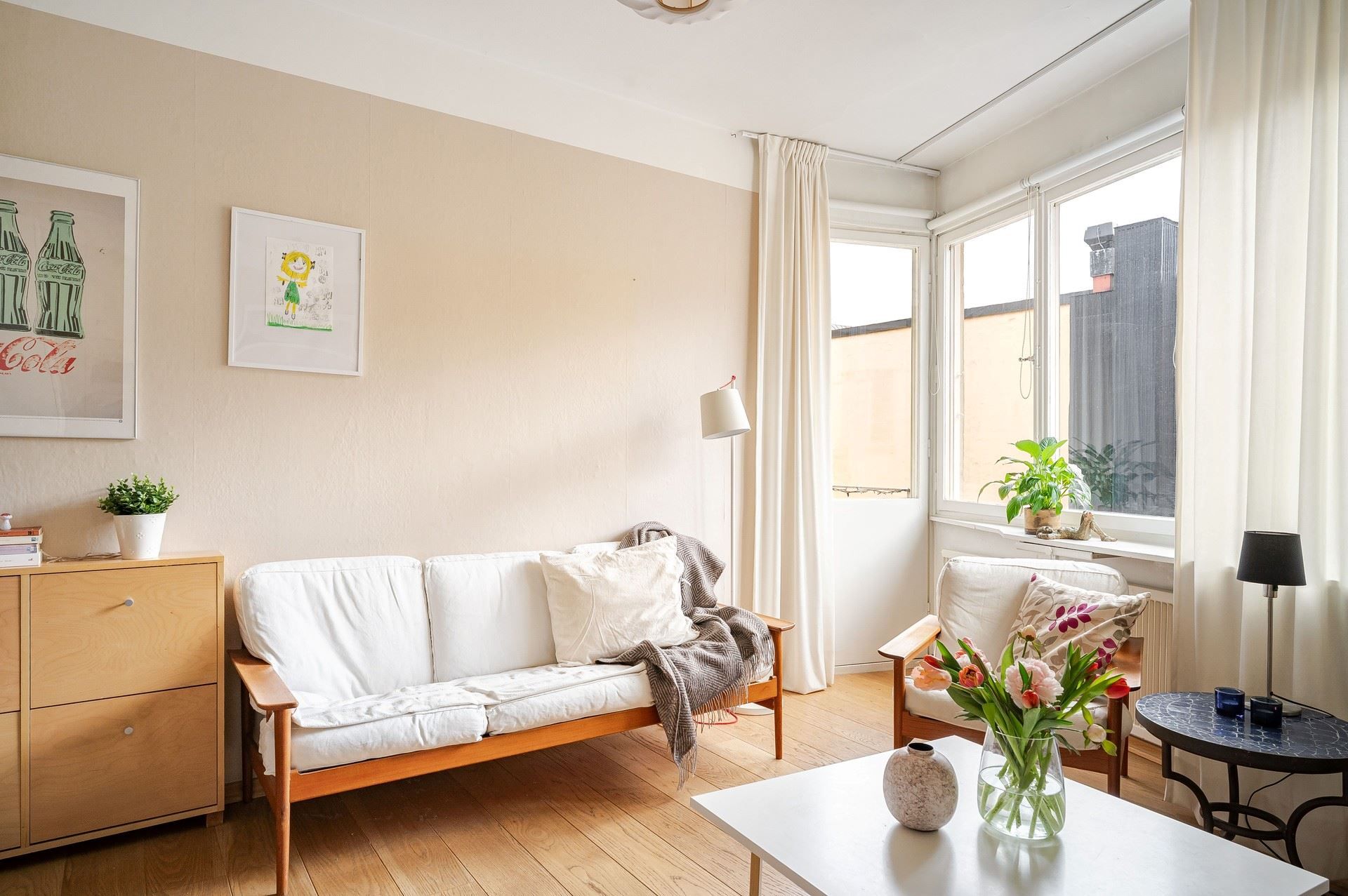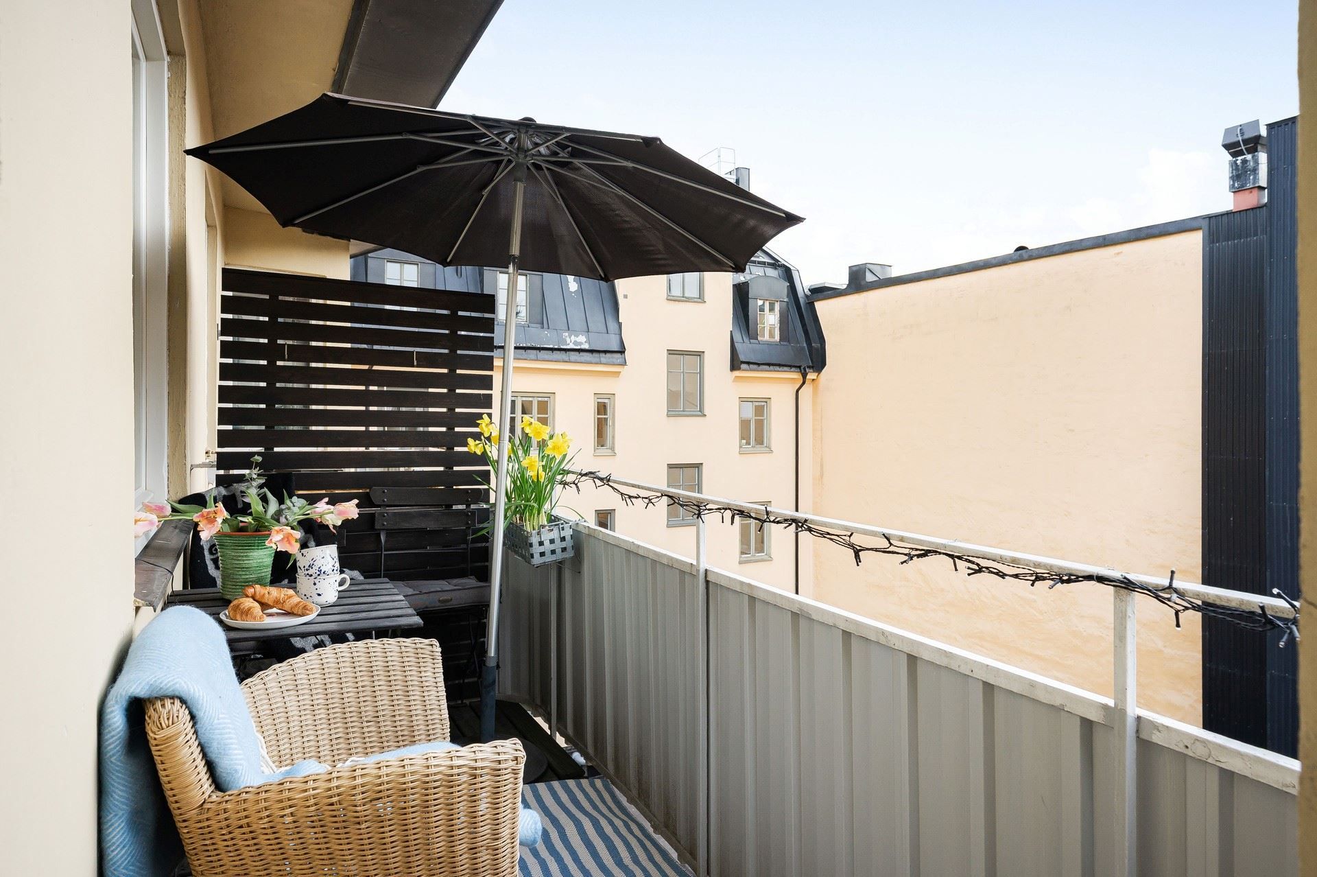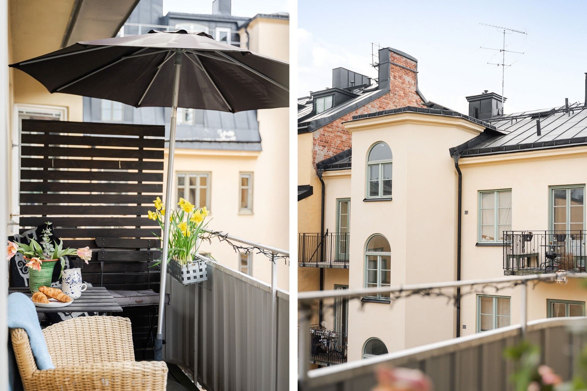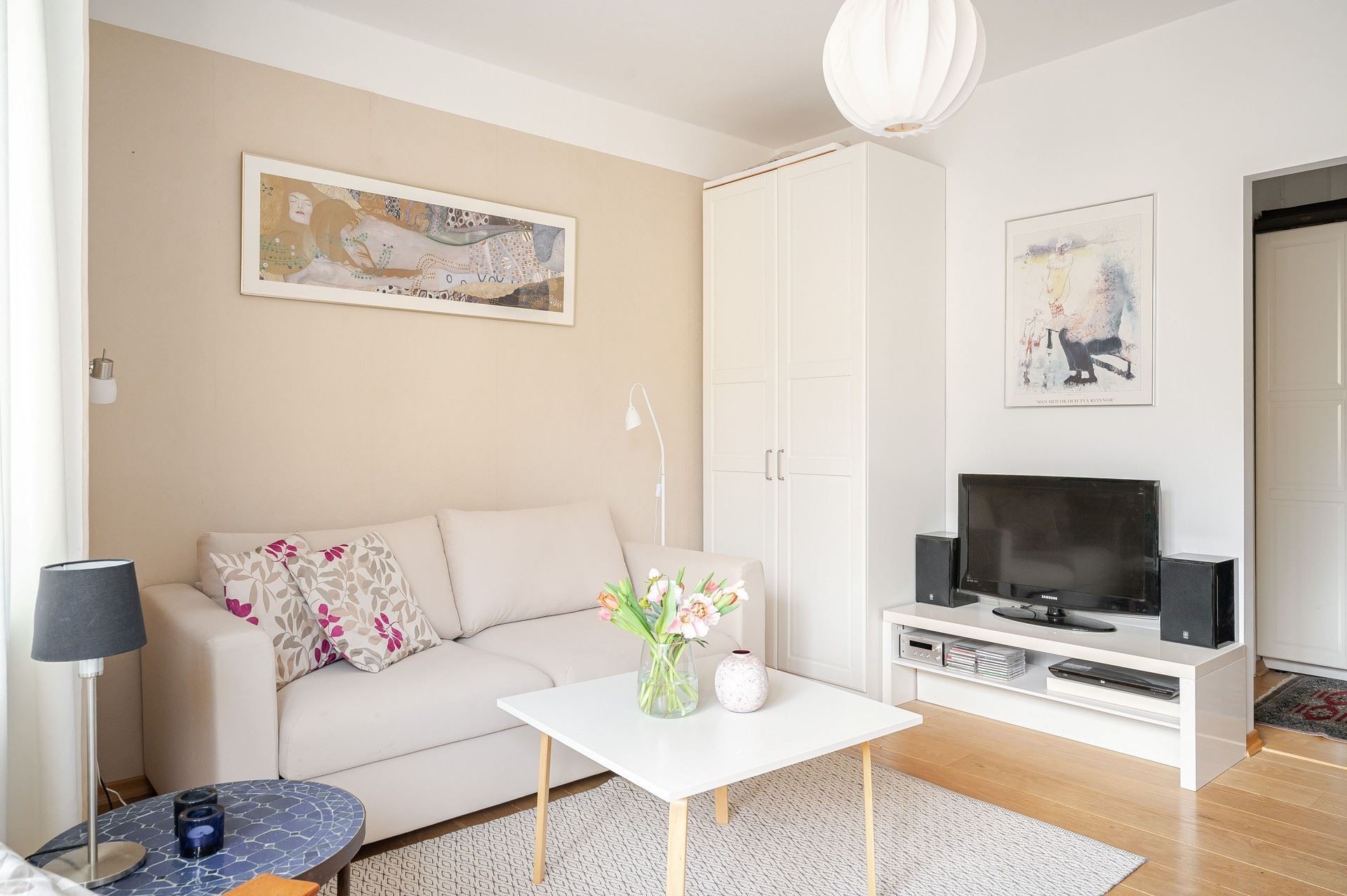 Vardagsrum och sovrum är generöst tilltaget och rymmer både soffa och säng. De stora fönsterpartierna i mysigt söderläge ger ett härligt ljusflöde och leder vidare ut till balkongen, som även den ligger i söderläge. Här kan du njuta av soliga dagar och långa stunder utomhus, med plats för utemöbler. För större sällskap finns dessutom föreningens trevliga takterrass med gott om utrymme och en fantastisk utsikt.