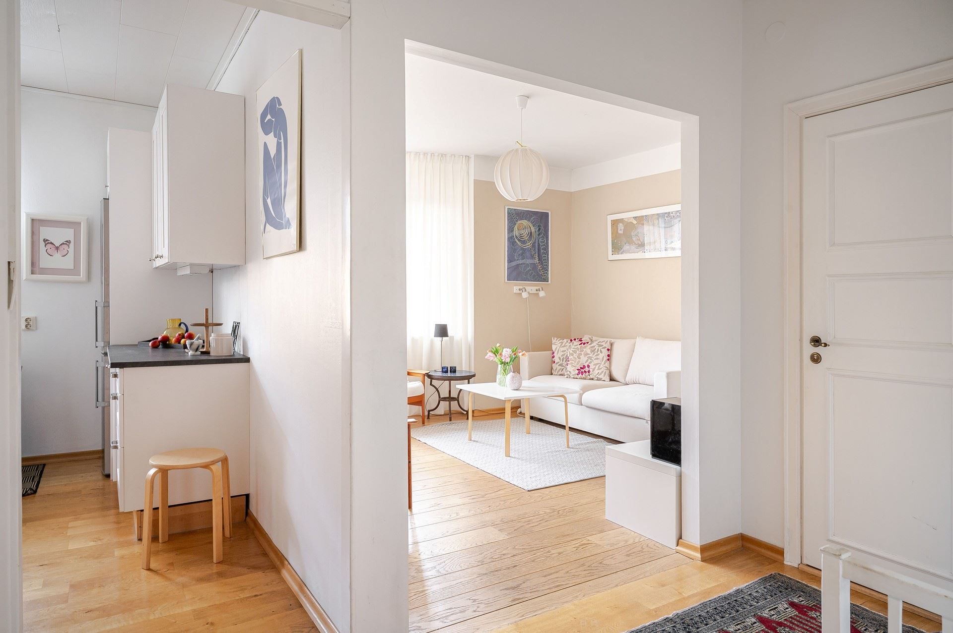 Du tar smidigt hissen upp till våning 4 utan att passera en enda trappa. Väl inne möts du av ett fantastiskt ljusinsläpp från flera fönster som skapar en luftig och trivsam känsla. Hallen erbjuder plats för avhängning och här finns även goda möjligheter att installera flera garderober. Från hallen når du bostadens samtliga rum.
