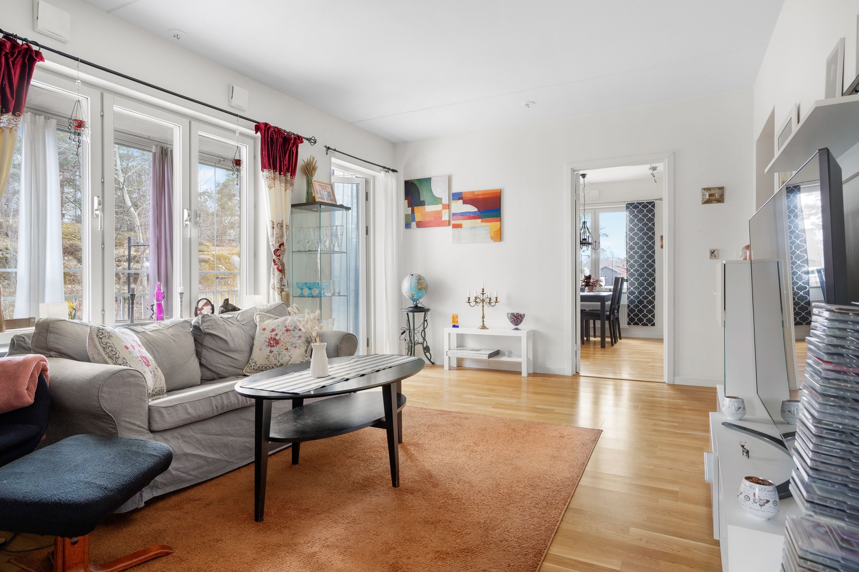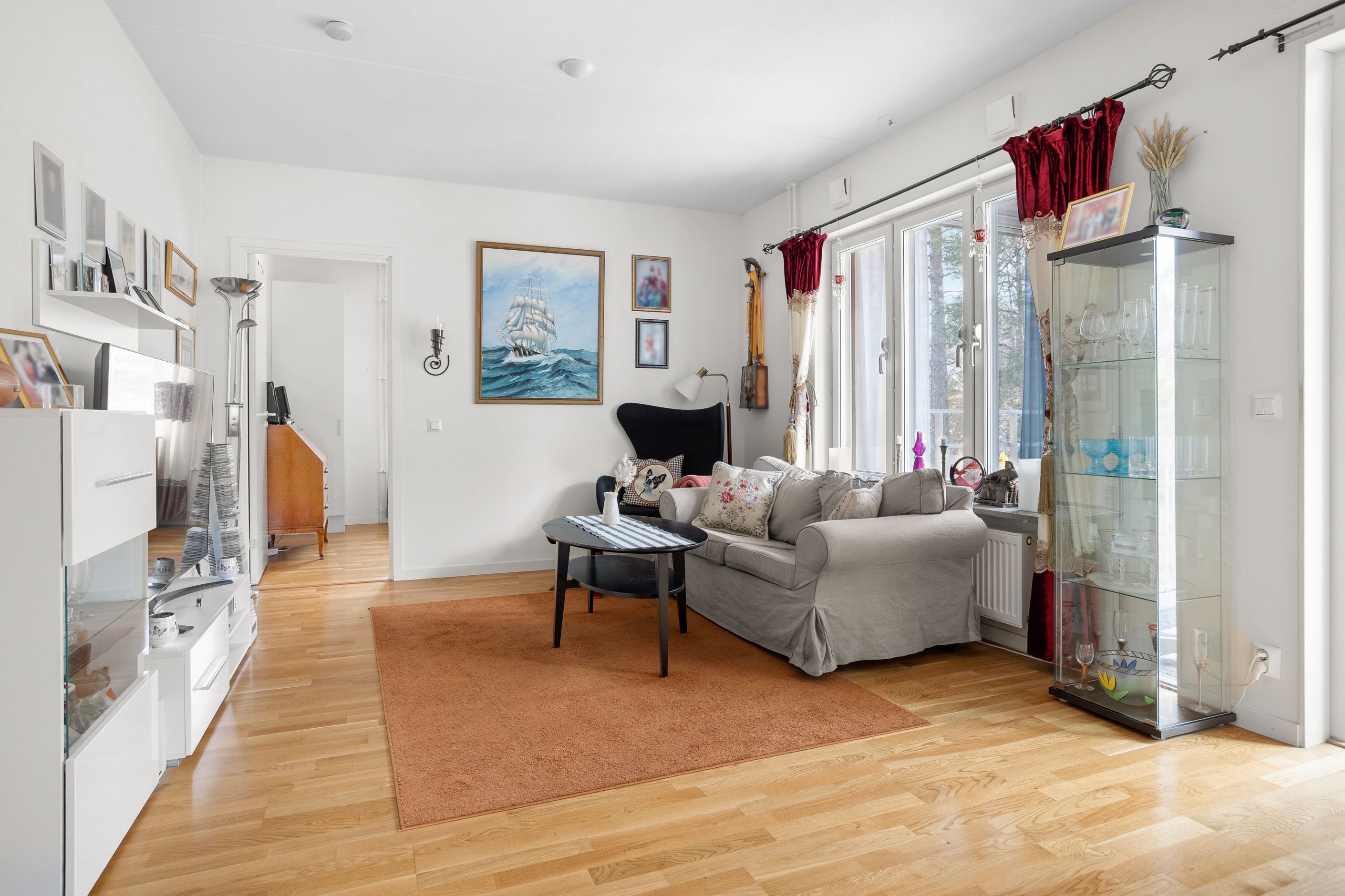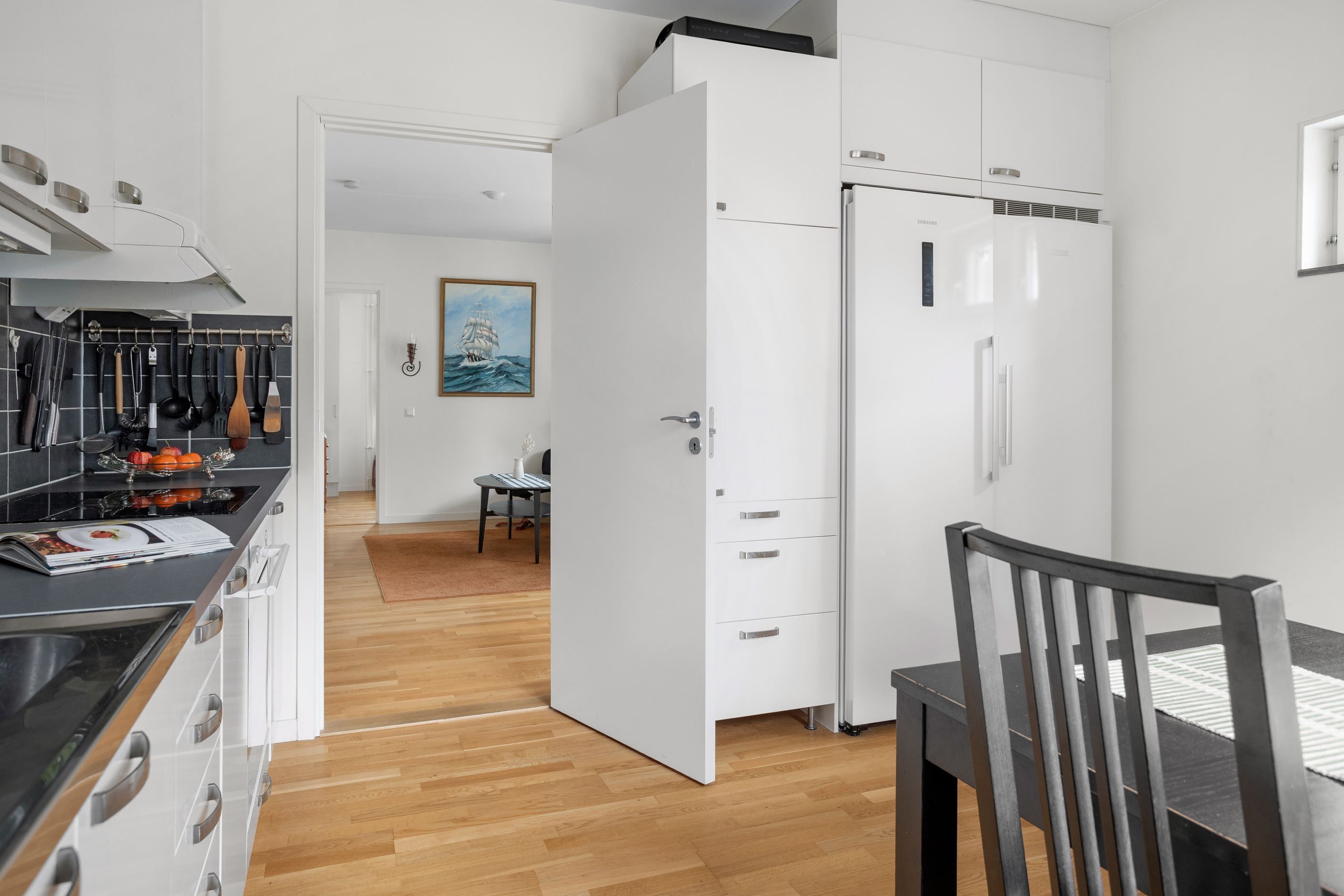 Välplanerad trea med bra rumsindelning mellan kök och vardagsrum. Från vardagsrummet nås en rymlig balkong i soligt läge.