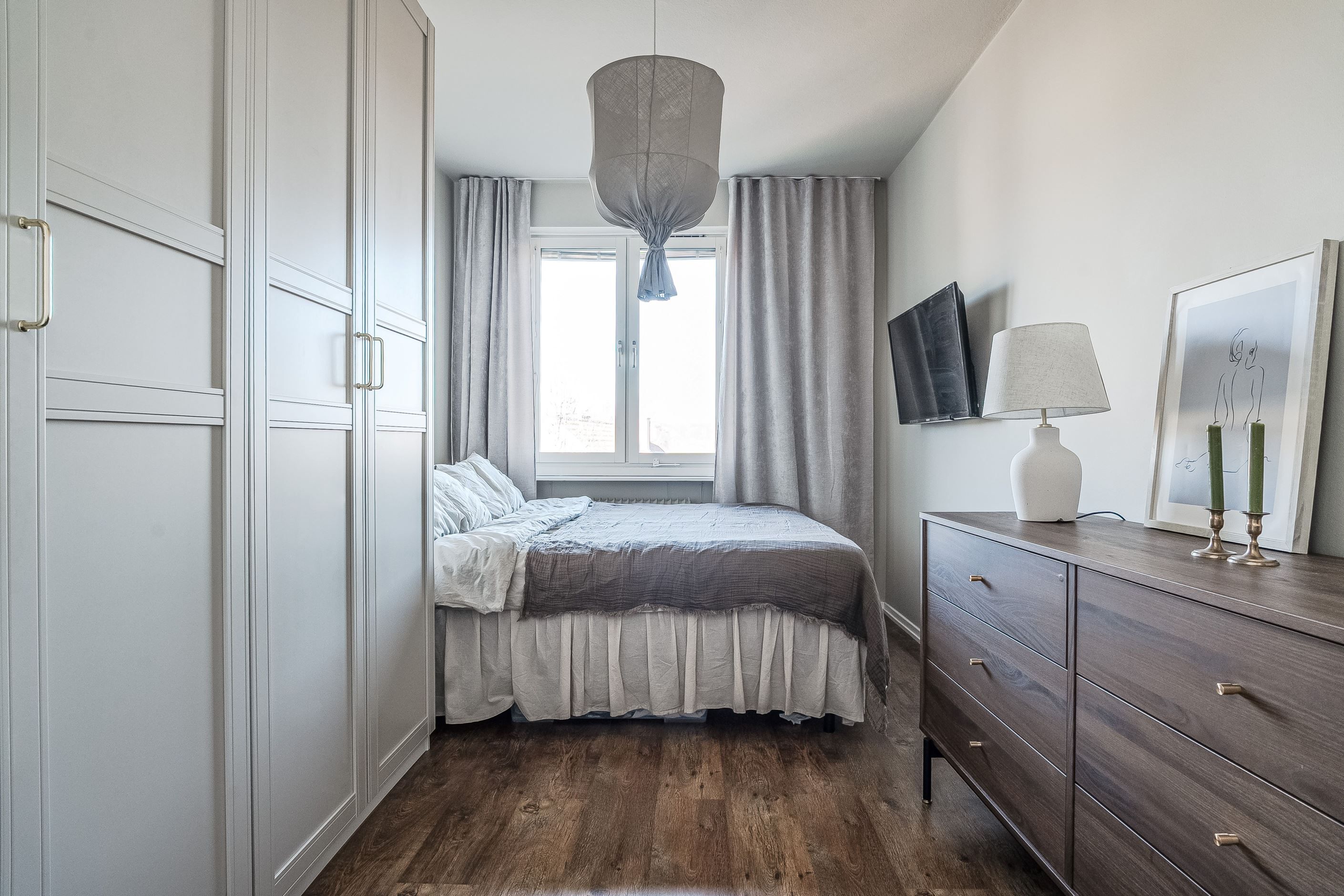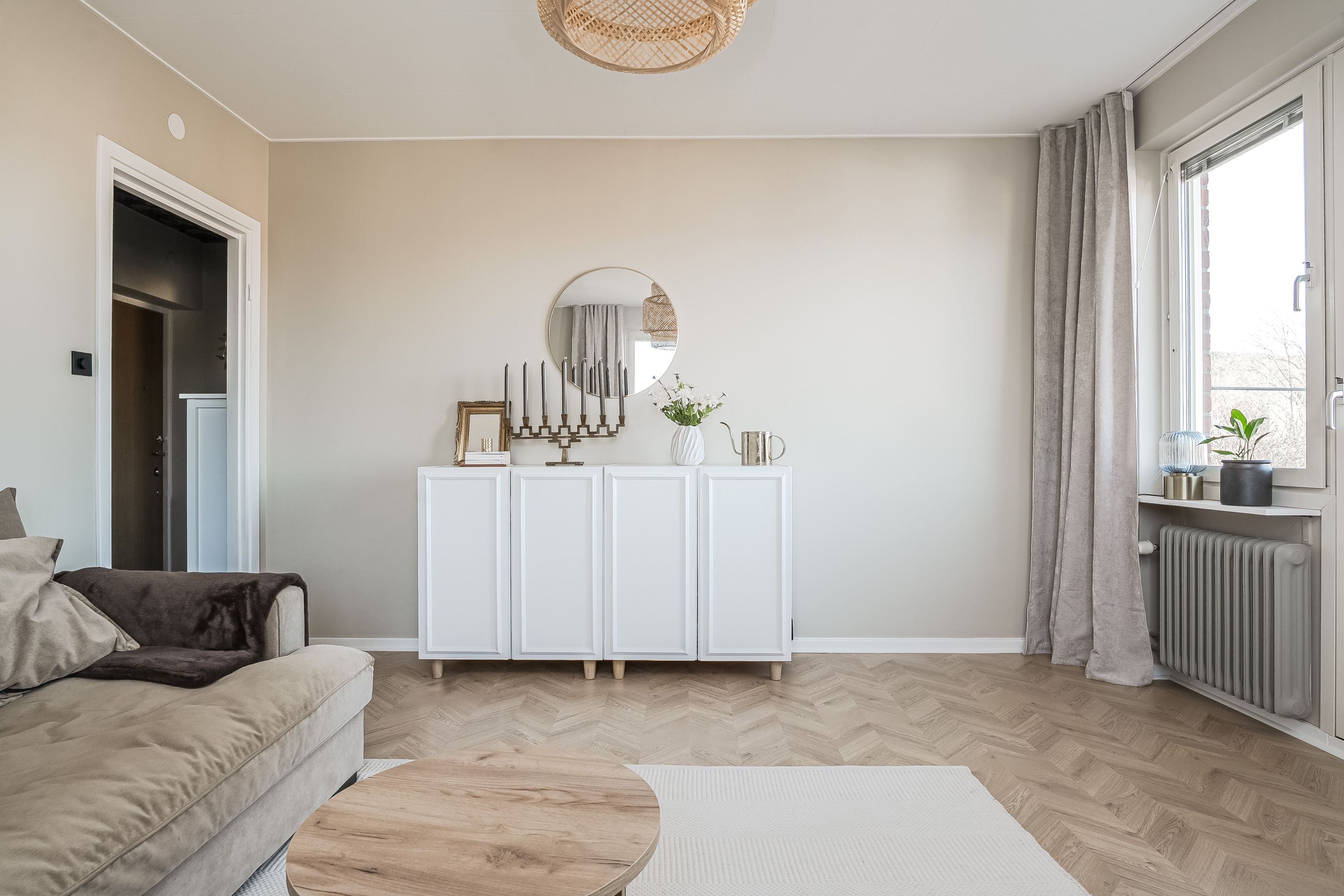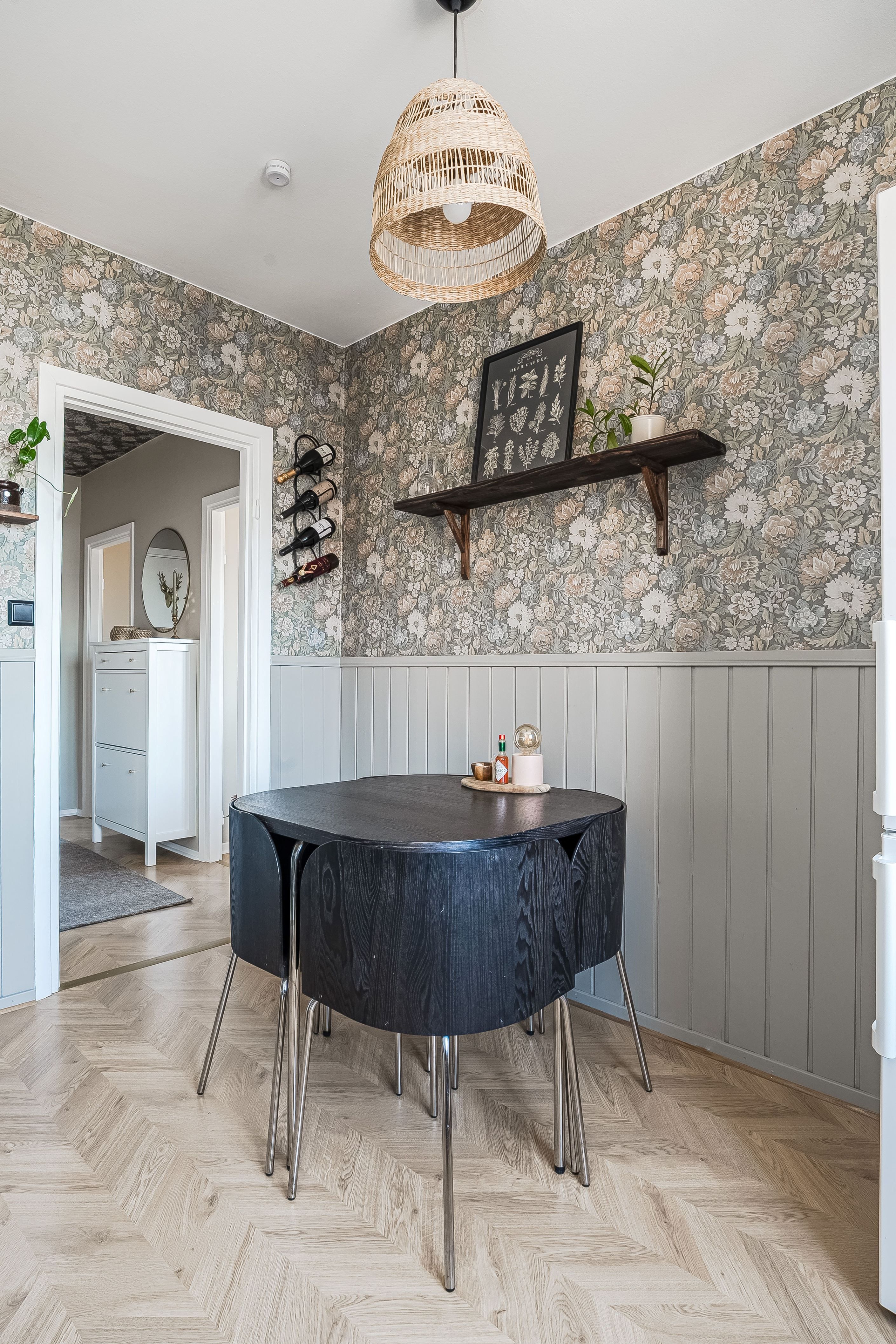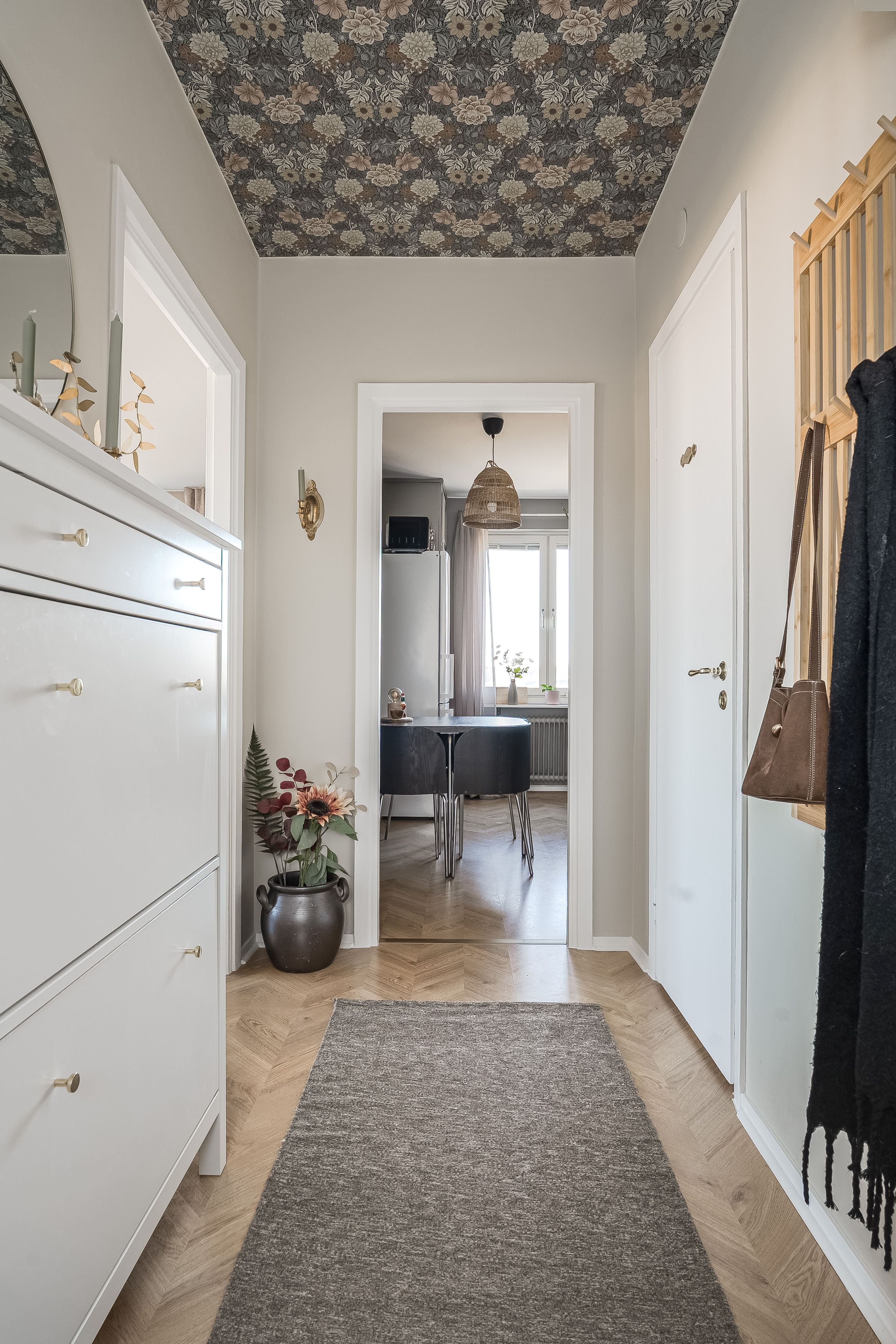 Planlösningen är väl genomtänkt med en praktisk klädkammare i hallen som erbjuder gott om förvaring och bidrar till ett stilrent intryck i resten av hemmet.