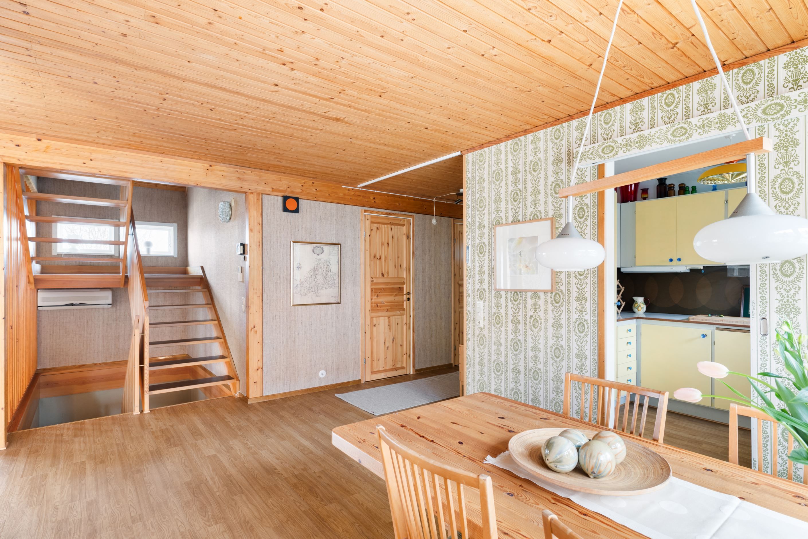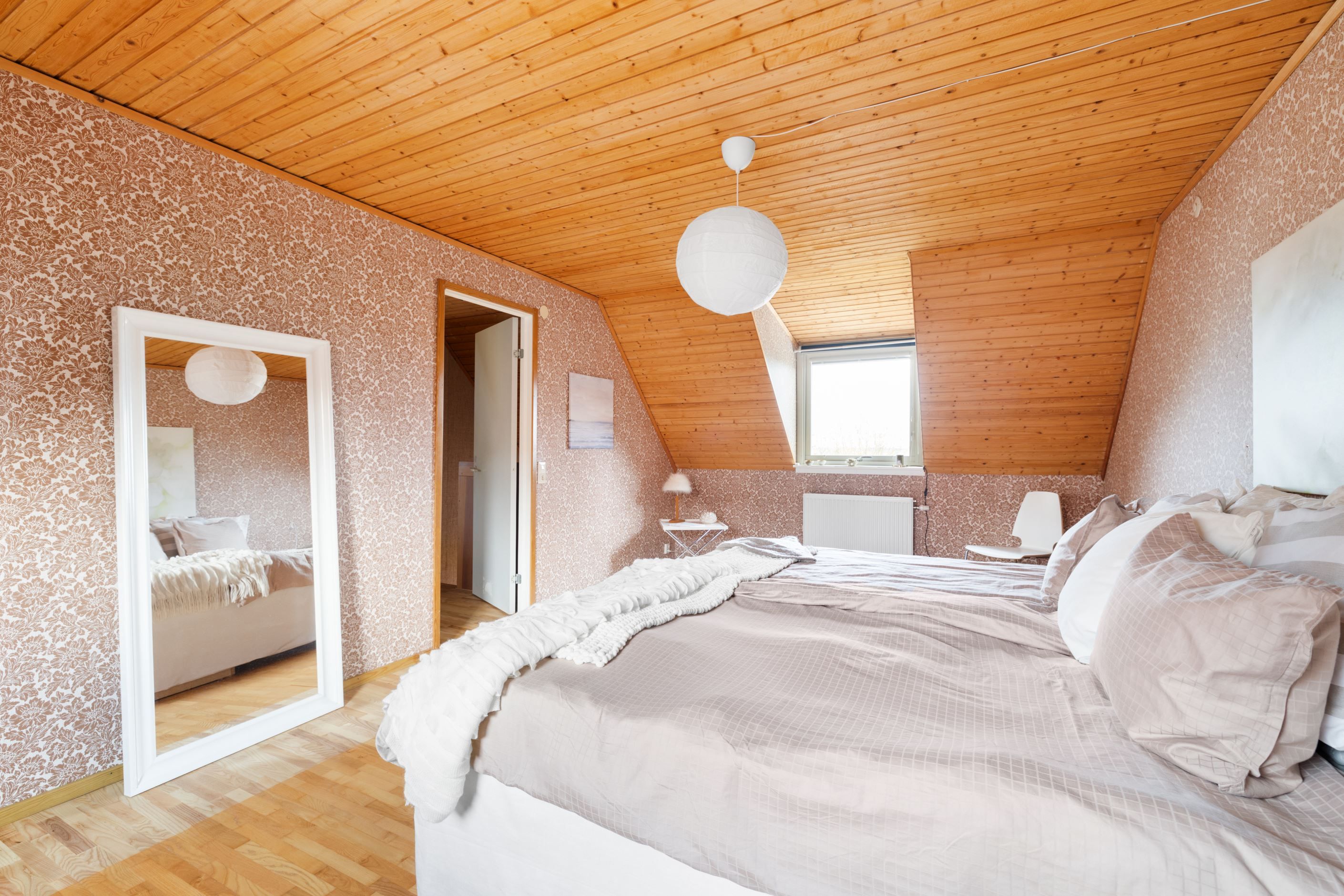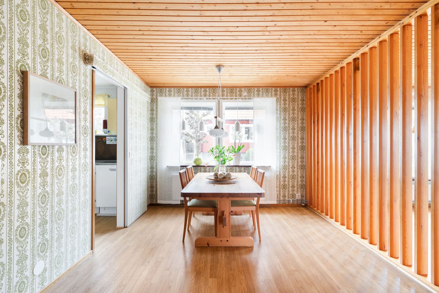 Redan vid första steget in möts du av en atmosfär som är svår att återskapa – mönstrade tapeter, varma toner och vackra parkettgolv samspelar och skapar en genuin och inbjudande känsla. Det är som att kliva in i en tidskapsel, där varje detalj bär på sin egen historia och charm.