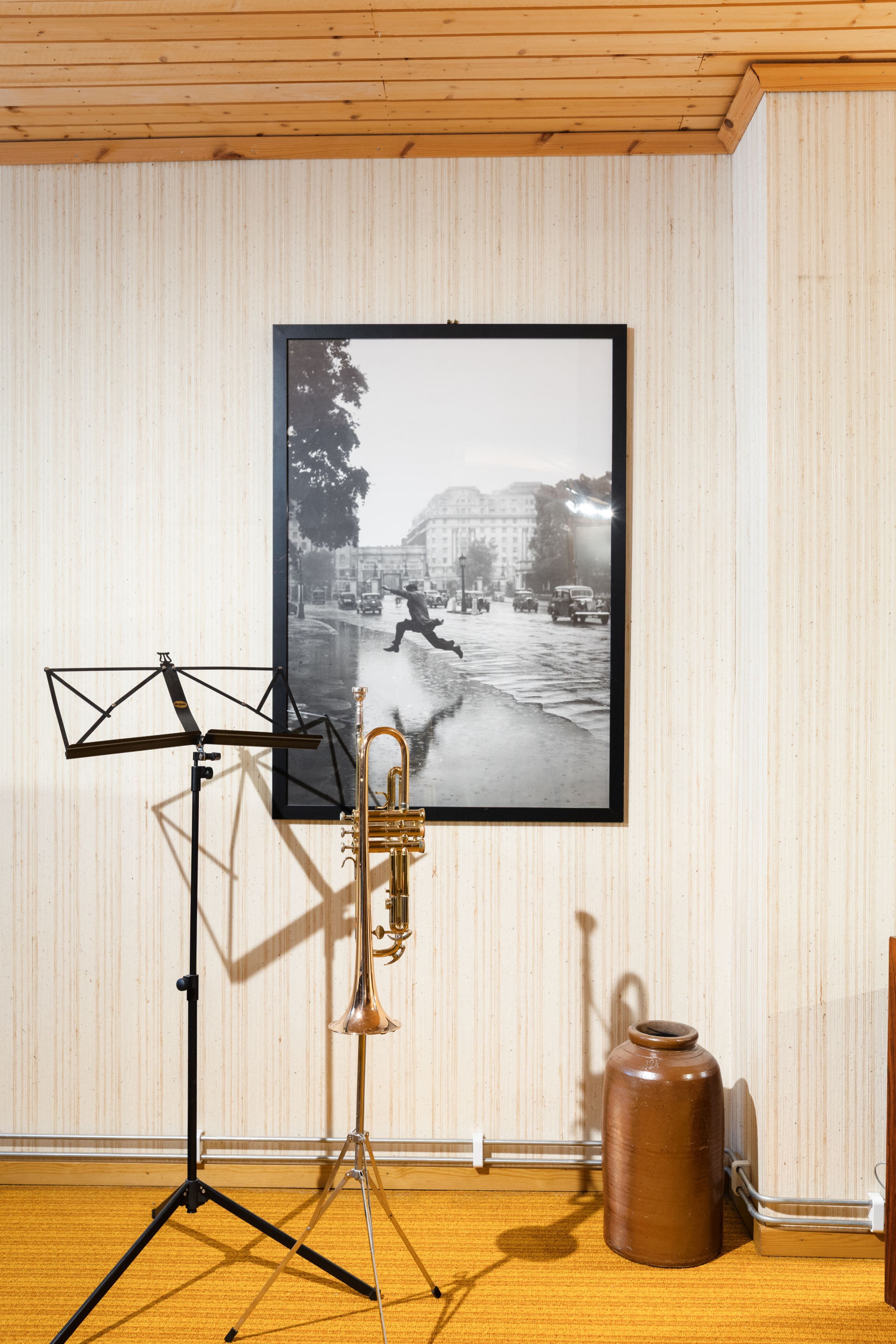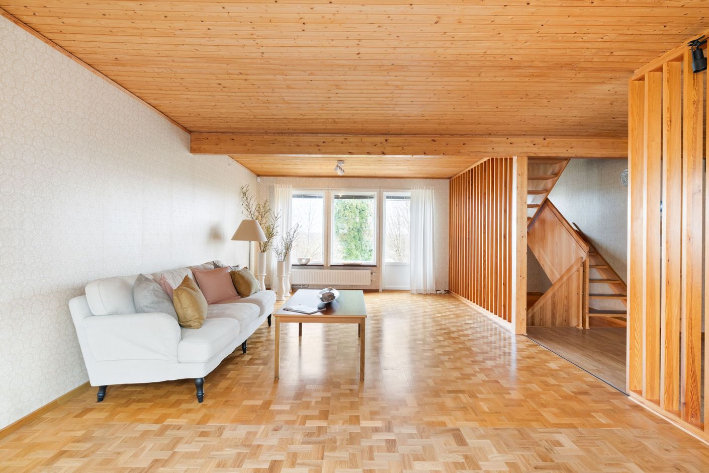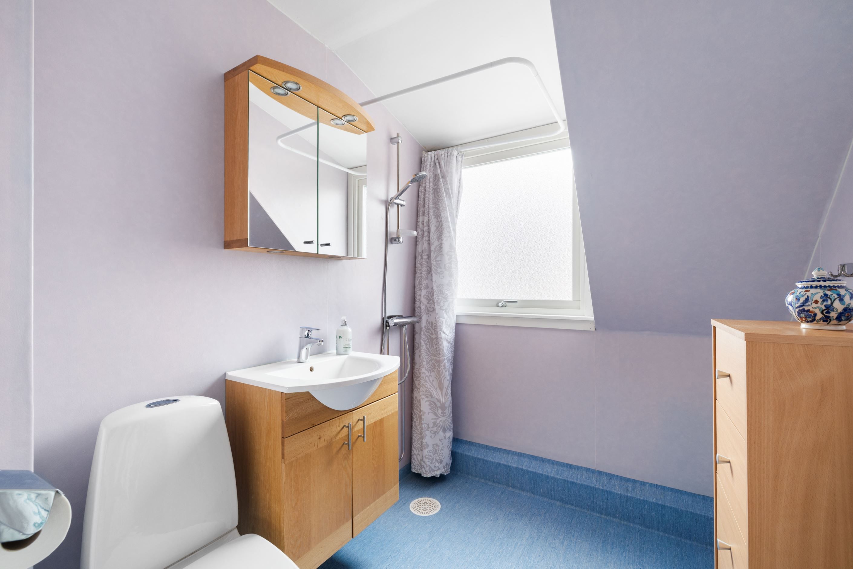Bostaden är fördelad över tre plan där entréplanet bjuder in till social samvaro. På övre plan finns tre sovrum med möjlighet till ett fjärde, samt ett badrum. Här uppe får du dessutom njuta av en magisk utsikt över takåsarna och ut över staden – en vy som verkligen sätter guldkant på vardagen.