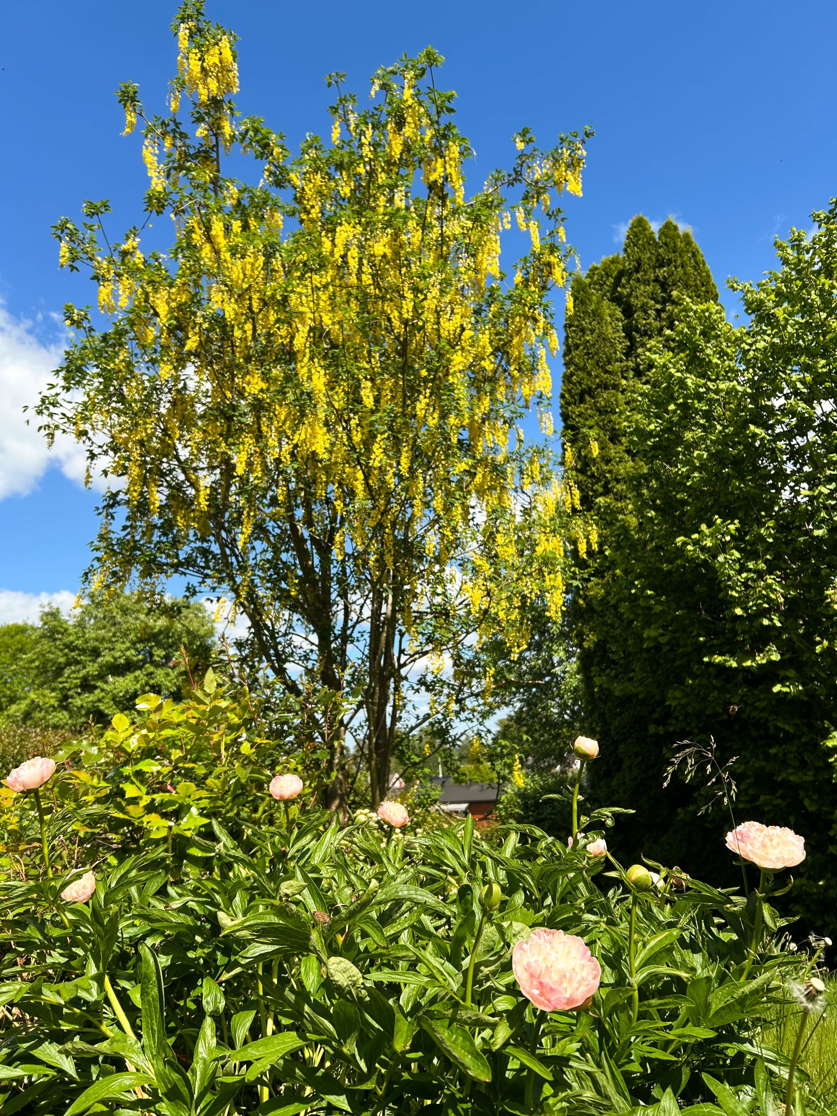 Trädgården är en prunkande oas med en rik växtlighet som blommar från tidig vår till sen höst. Här samsas vackra rosor i både vita och rosa toner med praktfulla pioner, liljor och jättevallmo. Under säsongen avlöser blomningen varandra med bland annat tulpaner, påskliljor och skilla på våren, följt av höstflox och kaprifol som förlänger färgprakten. Buskar och träd som rhododendron och gullregn bidrar till trädgårdens lummiga och inbjudande känsla.