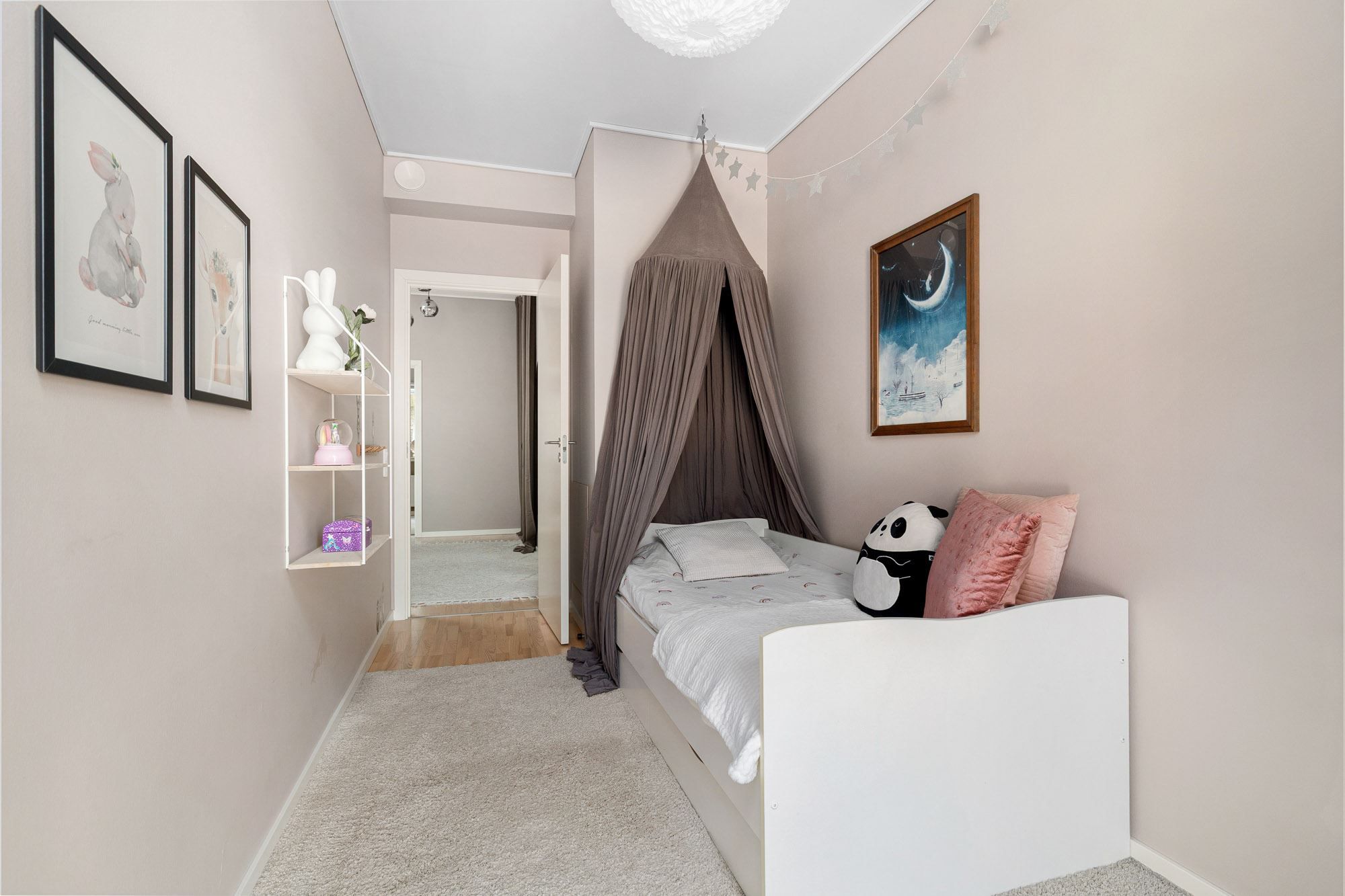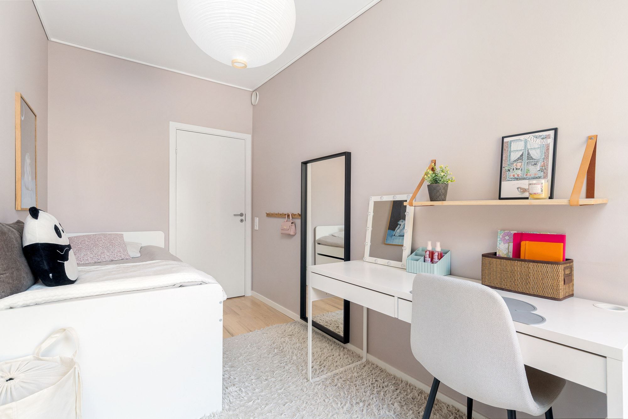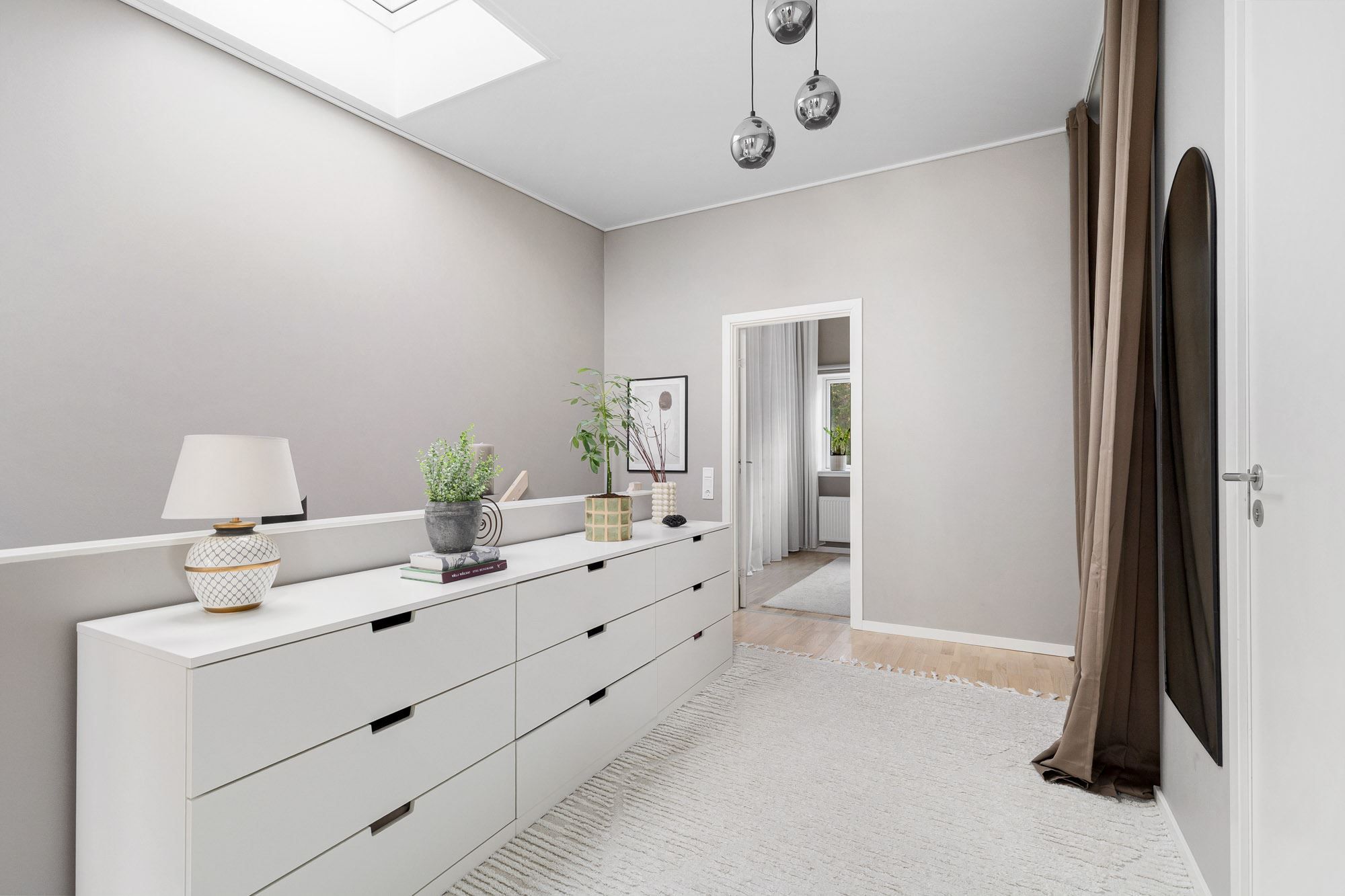 På ovanvåningen finns ett flexibelt allrum som idag används som hemmakontor, men som enkelt kan anpassas efter behov, exempelvis som extra sovrum, lekrum eller tv-rum.