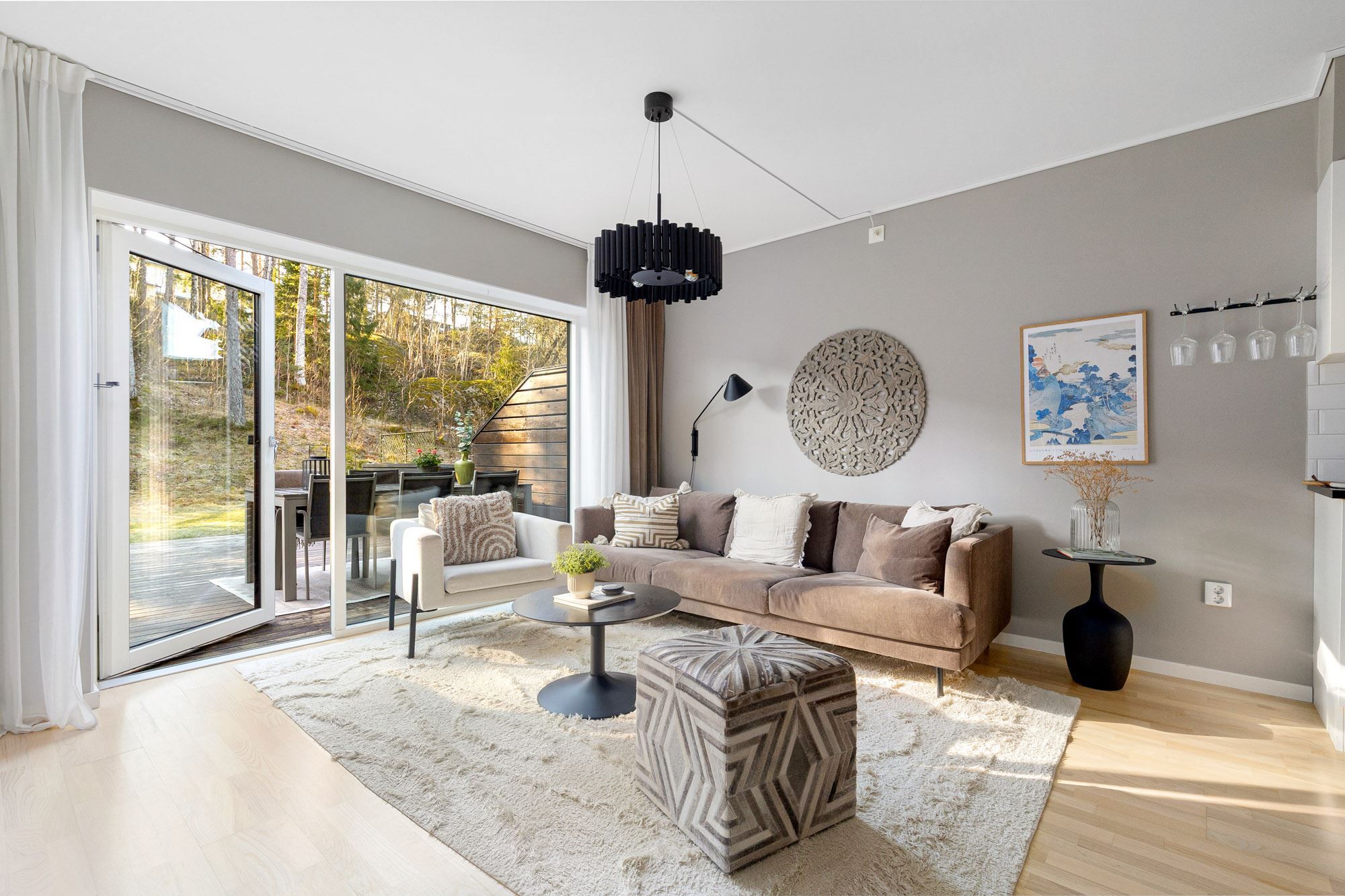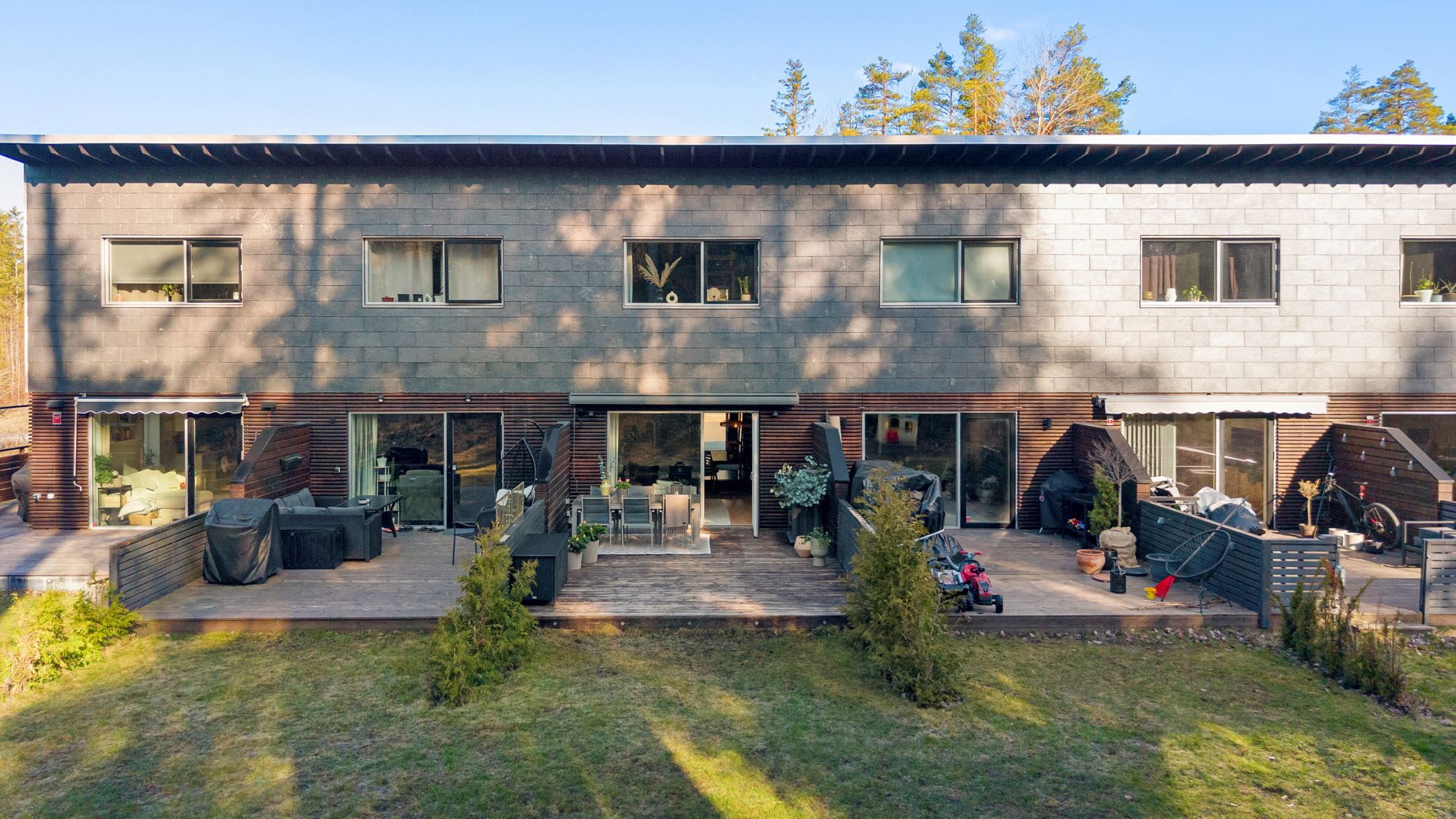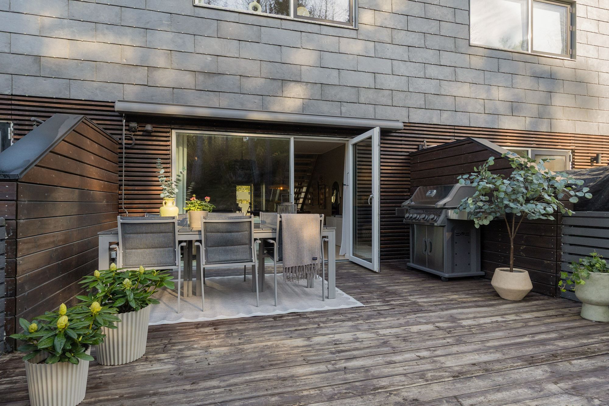 Den fantastiska altanen blir en naturlig samlingspunkt. Här kan du njuta av ett insynsskyddat läge med utsikt mot skogen och en lugn, naturnära känsla. Uteplatsen är dessutom utrustad med en elektrisk markis som ger extra komfort under varma dagar.