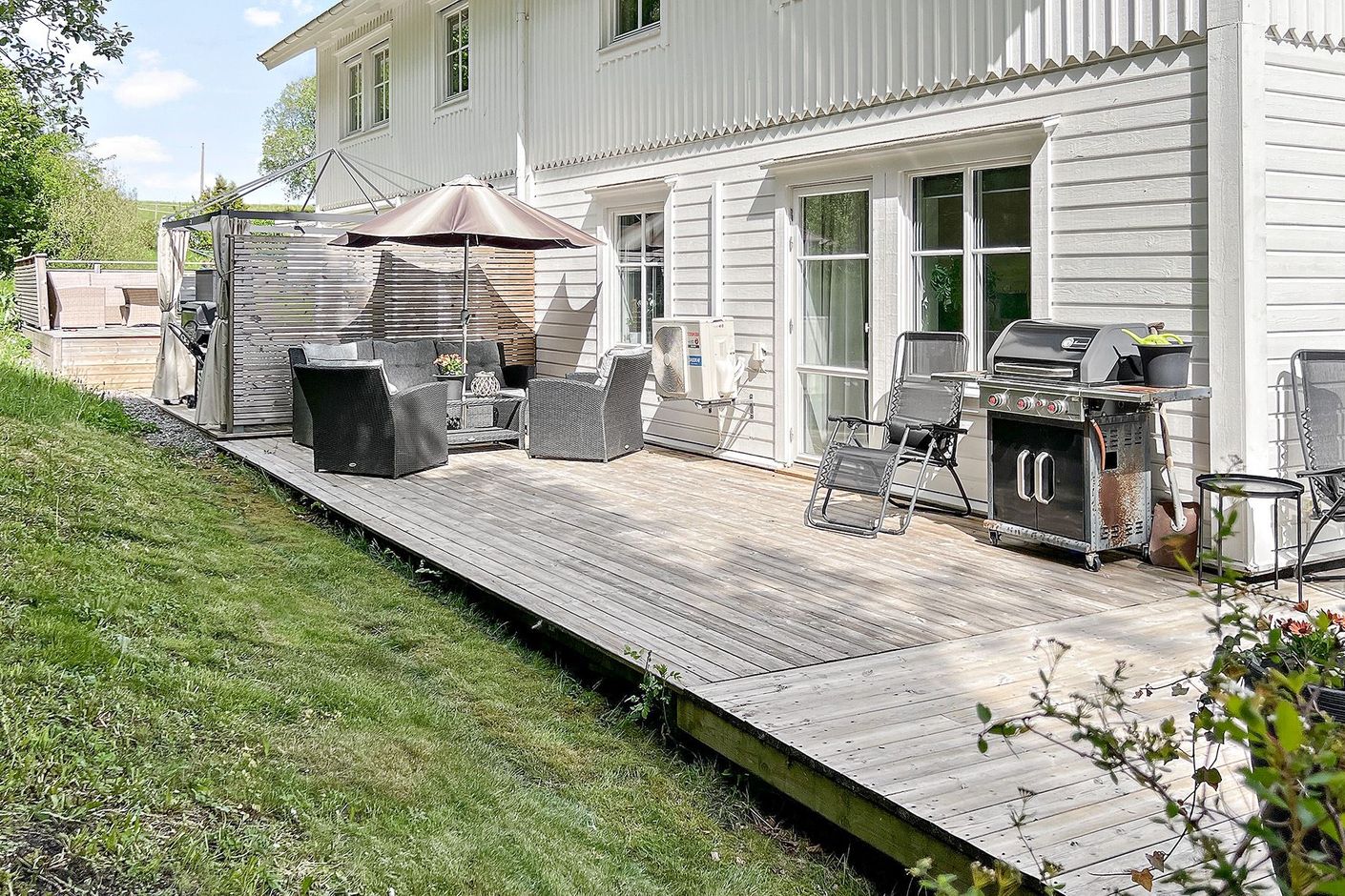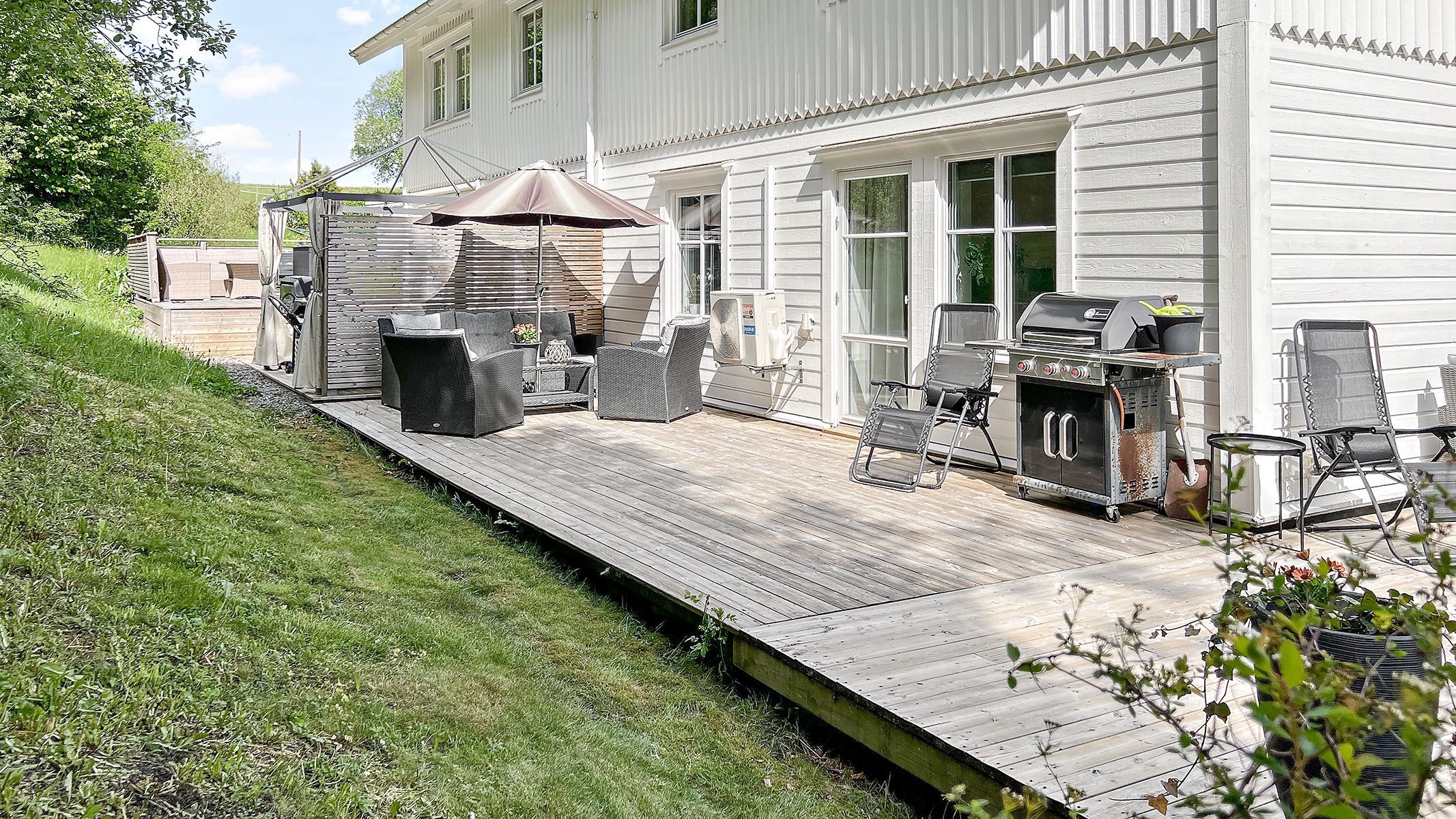 Nu öppnar vi dörren till denna trevliga gaveltrea i ett av Brf Apelvägens bästa lägen. Här finns stora uteplatser i tre vädersträck vilket ger bra med soltimmar under dagen. I anslutning till dessa ligger en liten skogsglänta och en större gräsmatta. Allt detta nås från vardagsrummet. Perfekt för barnen att leka på.