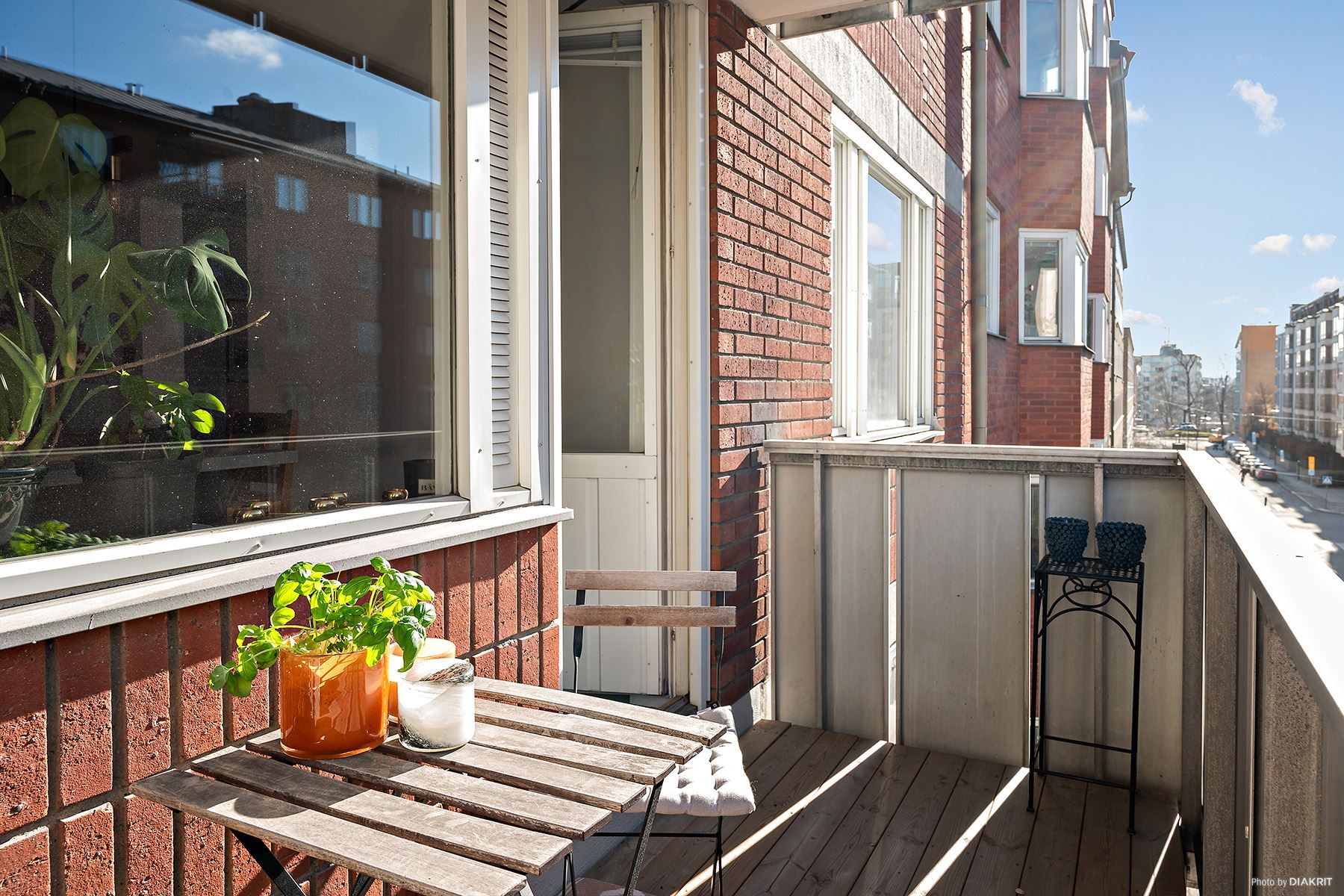 Planlösningen är effektiv och harmonisk, med en tydlig uppdelning mellan sociala ytor och privata rum. Från vardagsrummet nås sovrummet som vetter mot gårdssidan och erbjuder en rogivande miljö. Härifrån leder balkongdörren ut till en rymlig och solig uteplats i sydvästläge – en naturlig förlängning av hemmet under årets varmare månader.