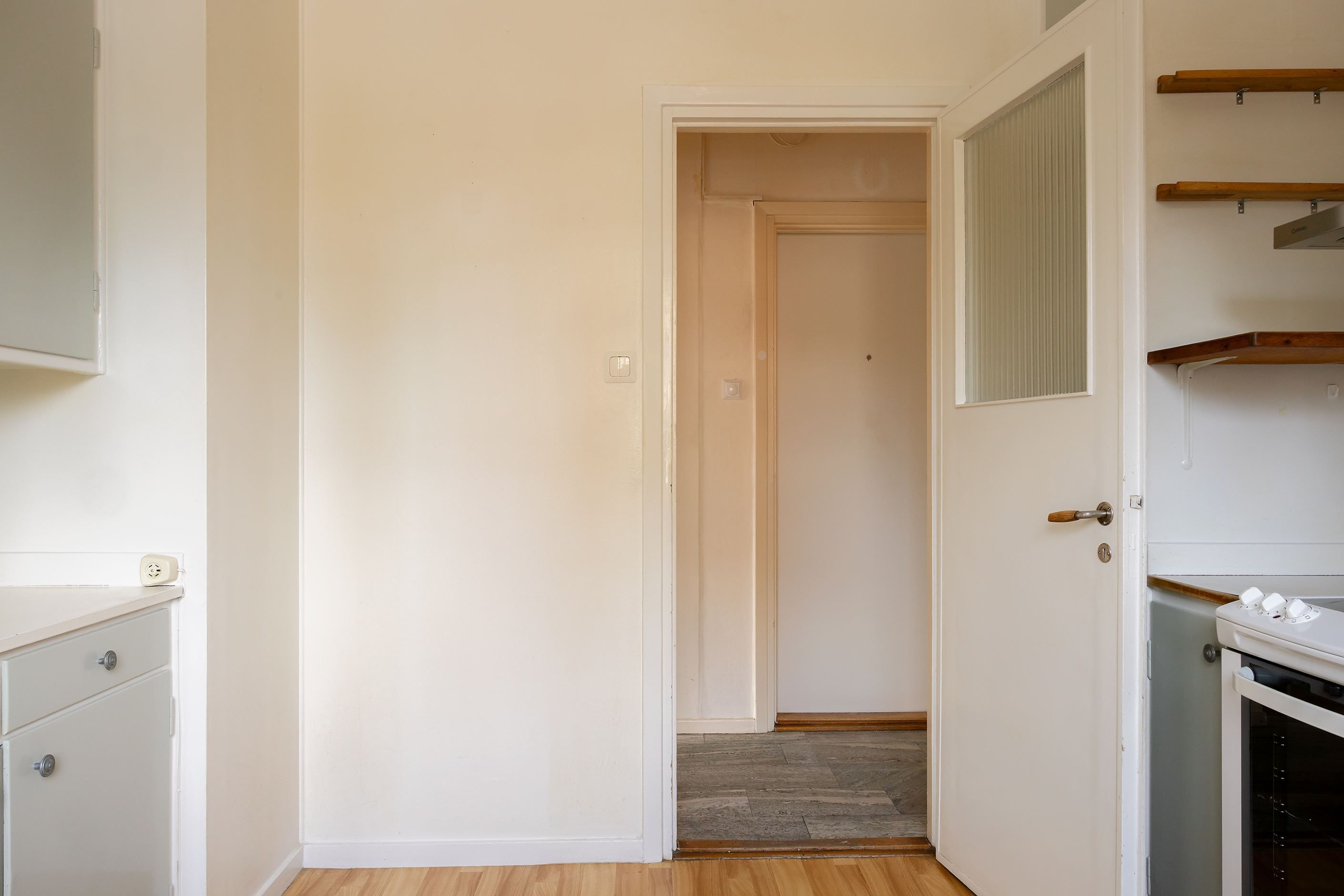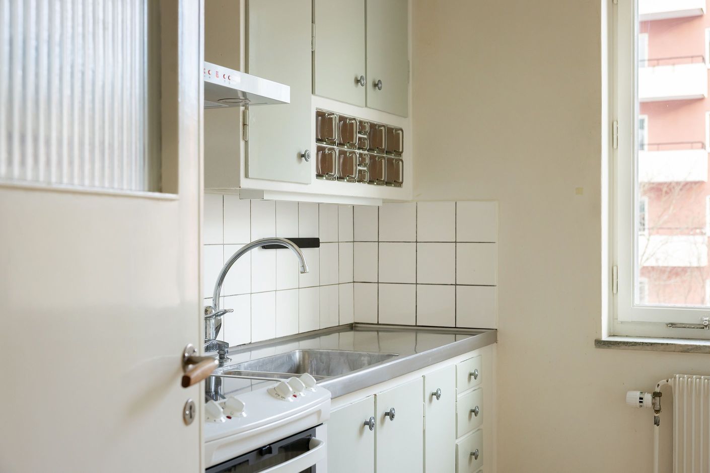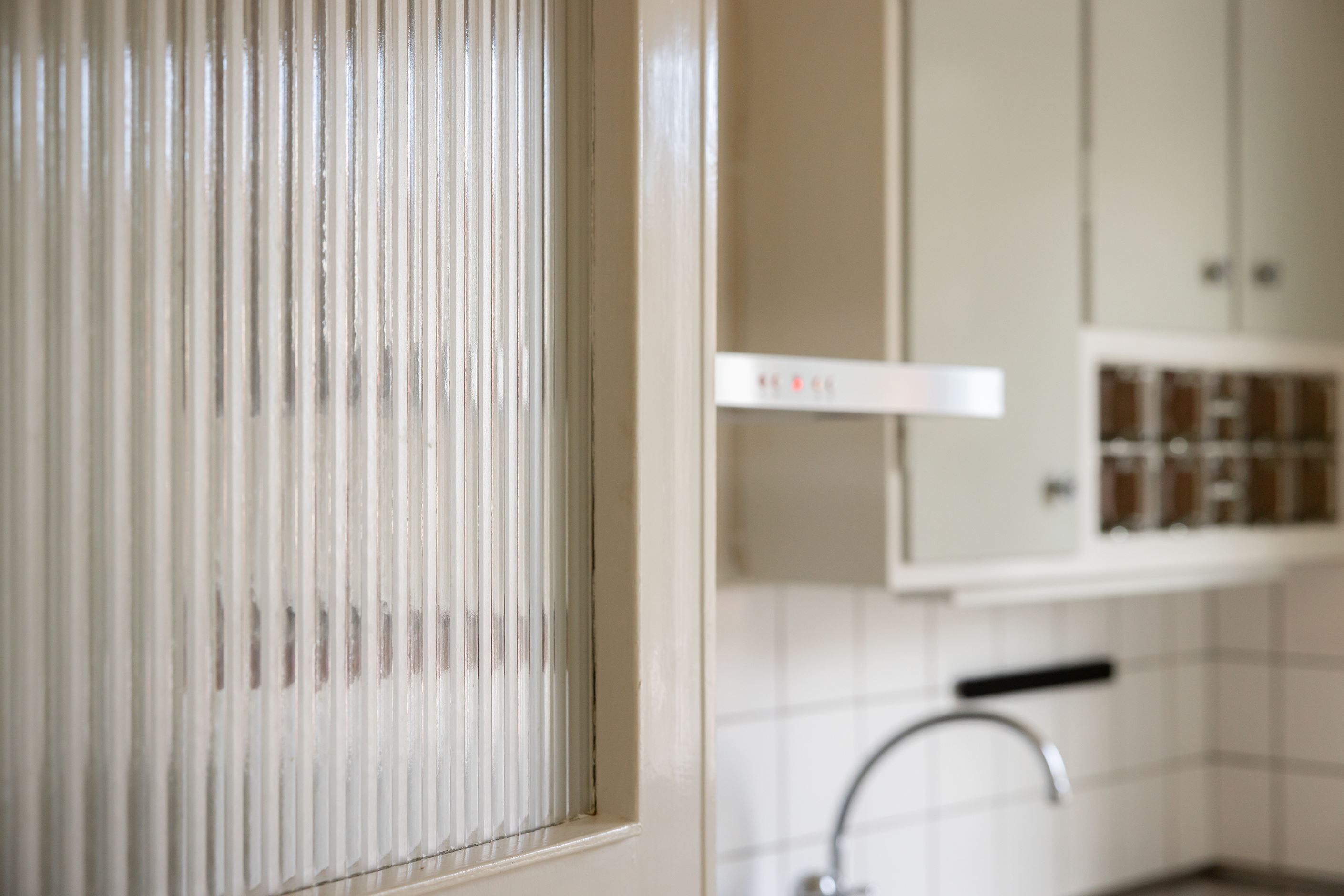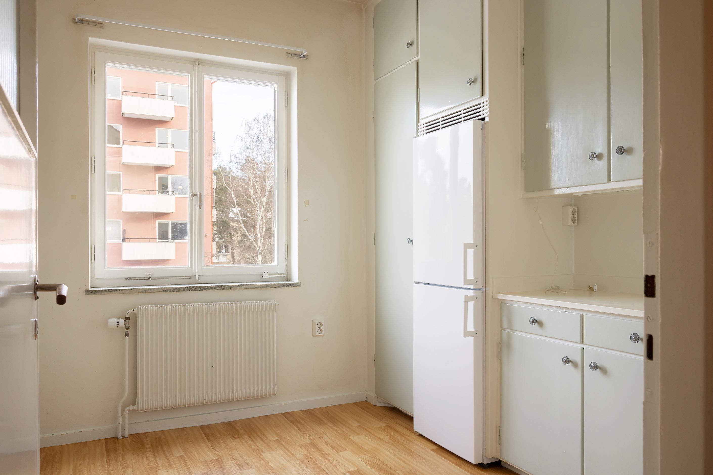 Köket är charmigt med överfalsade luckor och den klassiska Redahyllan som ger den rätta funkiskänslan – eftertraktad av många. Här finns gott om förvaring, bra arbetsytor och moderna vitvaror såsom spis, fläktkåpa och kombinerad kyl/frys. Ett stort fönster skänker ljus och golvytan ger plats för mindre matbord för den som önskar.