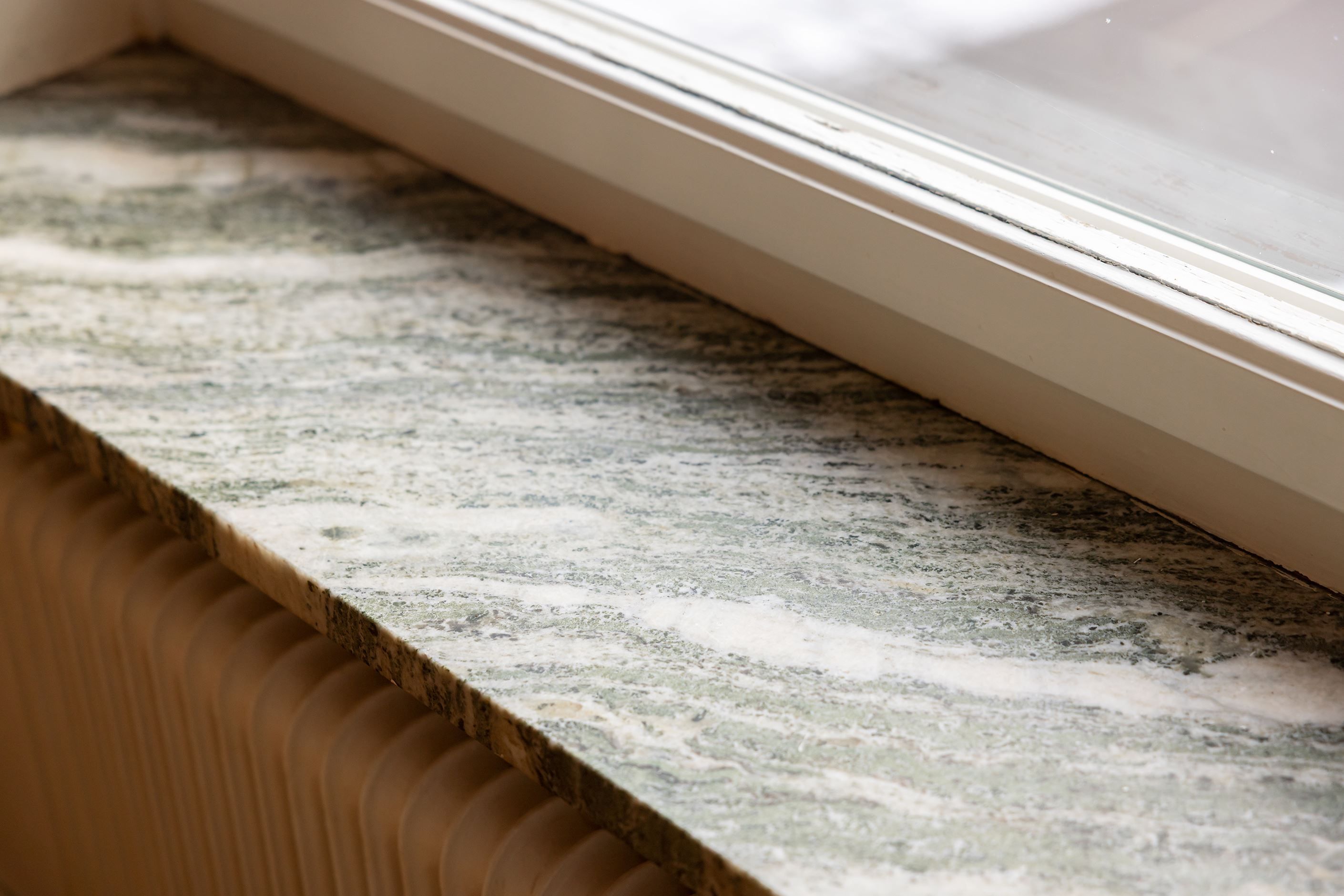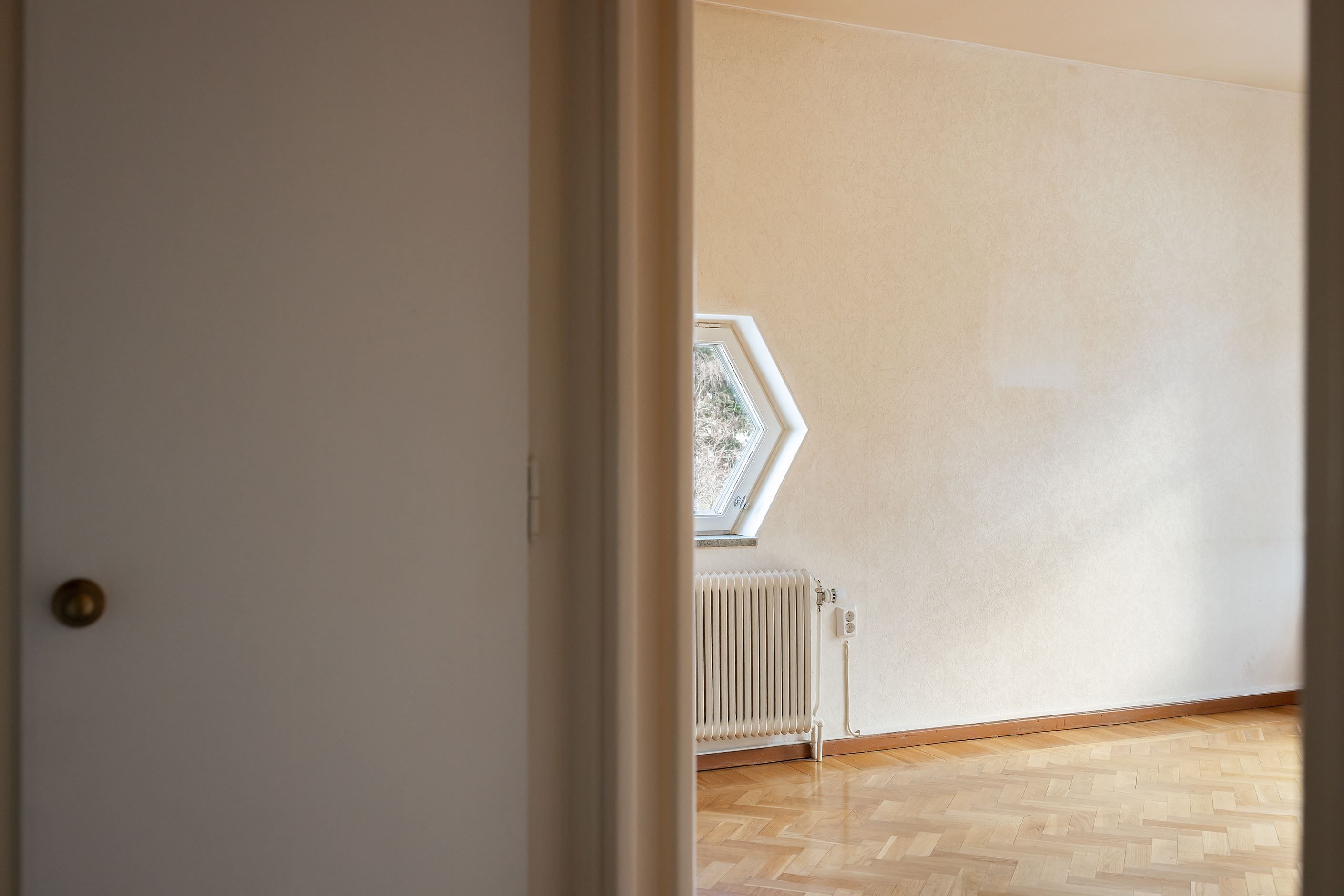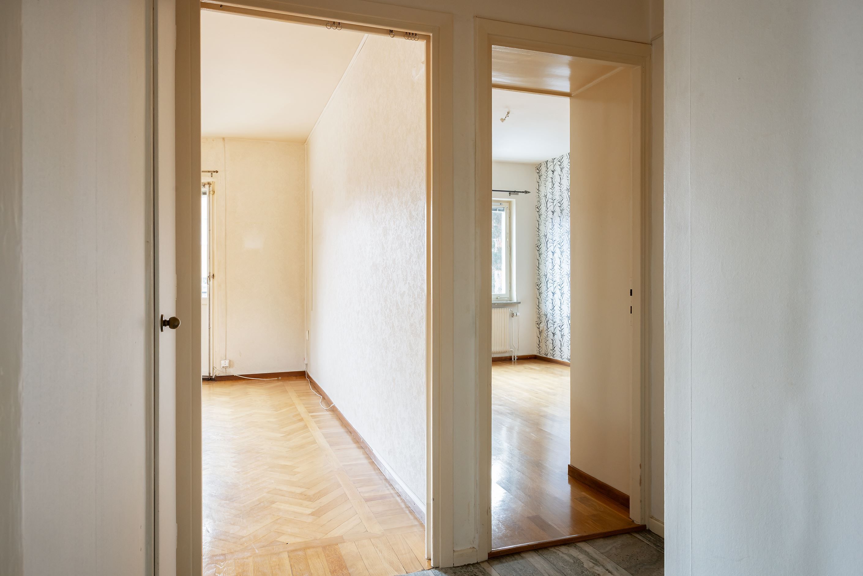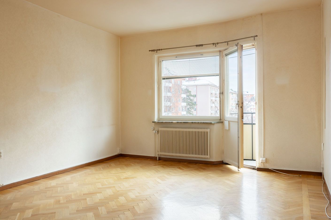 Vardagsrummet i gavel är hemmets hjärta med gott om plats för både soffgrupp och matbord med bibehållen luftig känsla. Ett stort fönster och en glasinfattad balkongdörr ger tillsammans med ett hexagonformat fönster fina ljusinsläpp från två väderstreck. Fiskbensparkett på golvet, tidstypiska beslag och fönsterbänkar i natursten ger rummet karaktär. Från vardagsrummet kommer man ut på balkongen som blir en naturlig förlängning och en mysig oas att vistas på under årets varma månader.