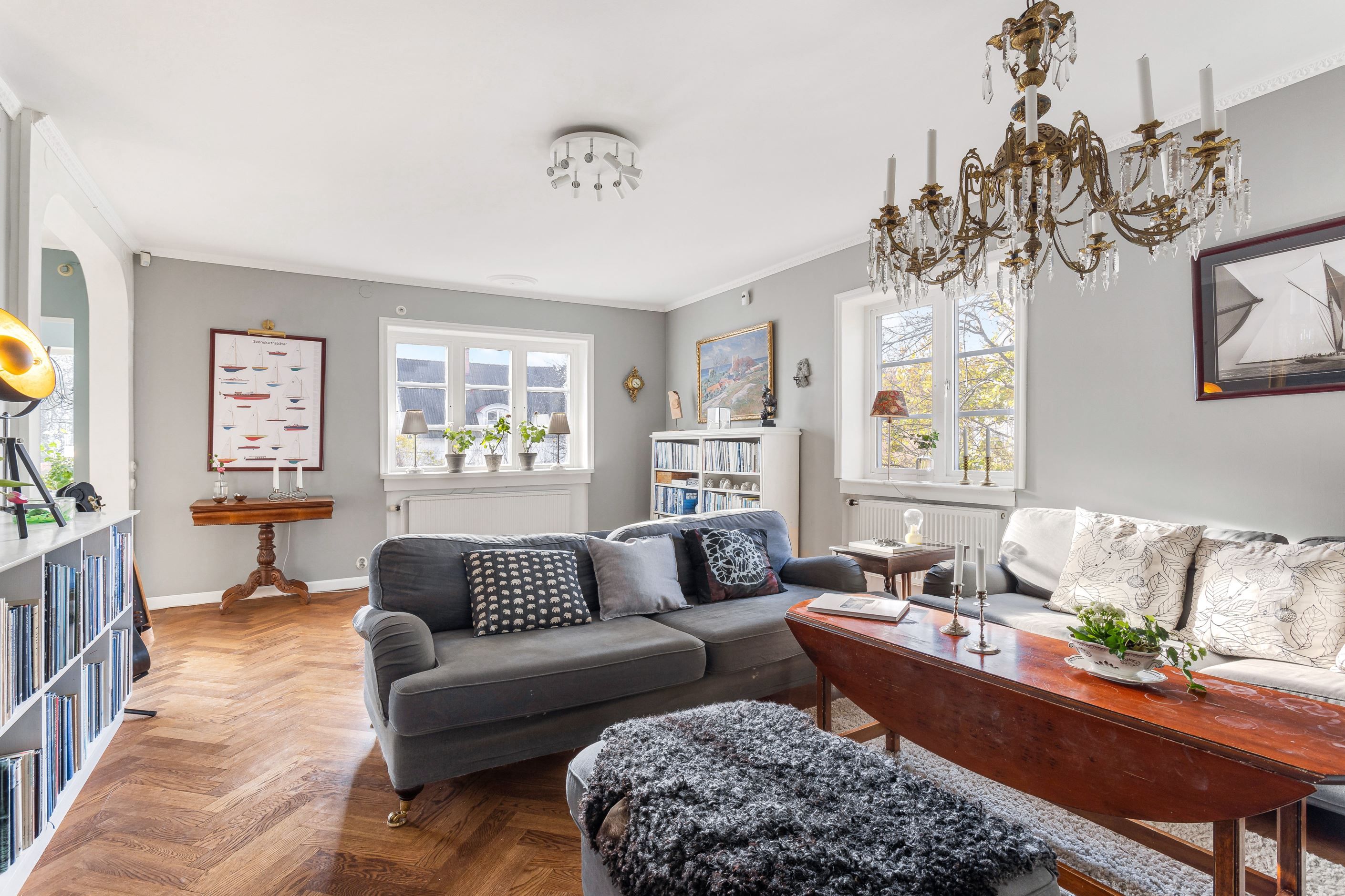 ENTRÉPLAN - Möblerbar HALL med gott om plats för ytterkläder. Vackra och väl tilltagna SÄLLSKAPSYTOR med underbart ljusflöde och härlig rymd. Rummen badar i ljus genom höga spröjsade fönster, med vy mot vackert grönskande tomt. VARDAGSRUM med gott om plats för soffgruppen. ALLRUM/SOVRUM med egen entré. Stilfullt KÖK av hög klass och med tidstrogen, varm atmosfär. MATRUMSDEL i tillbyggt UTERUM med glasad dörr ut mot trädgården. Här ryms det stora sällskapet runt bordet.
