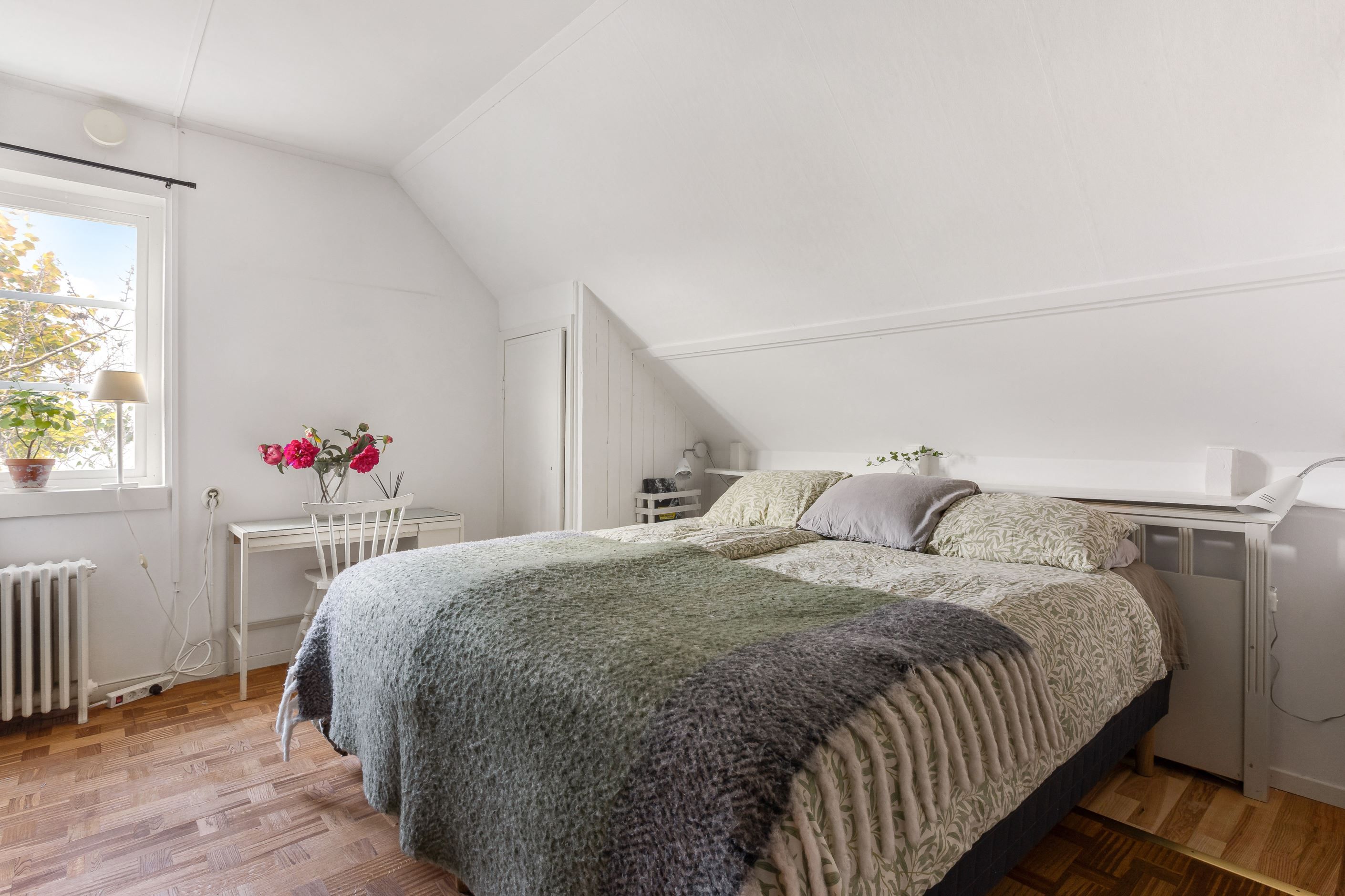 ÖVRE PLAN - Rymmer möblerbar ÖVRE HALL med dörr ut mot soldränkt ALTAN i söderläge. Därtill 3 SOVRUM varav ett genomgångsrum med kakelugn. Gott om förvaring. Kaklat BADRUM med dusch..