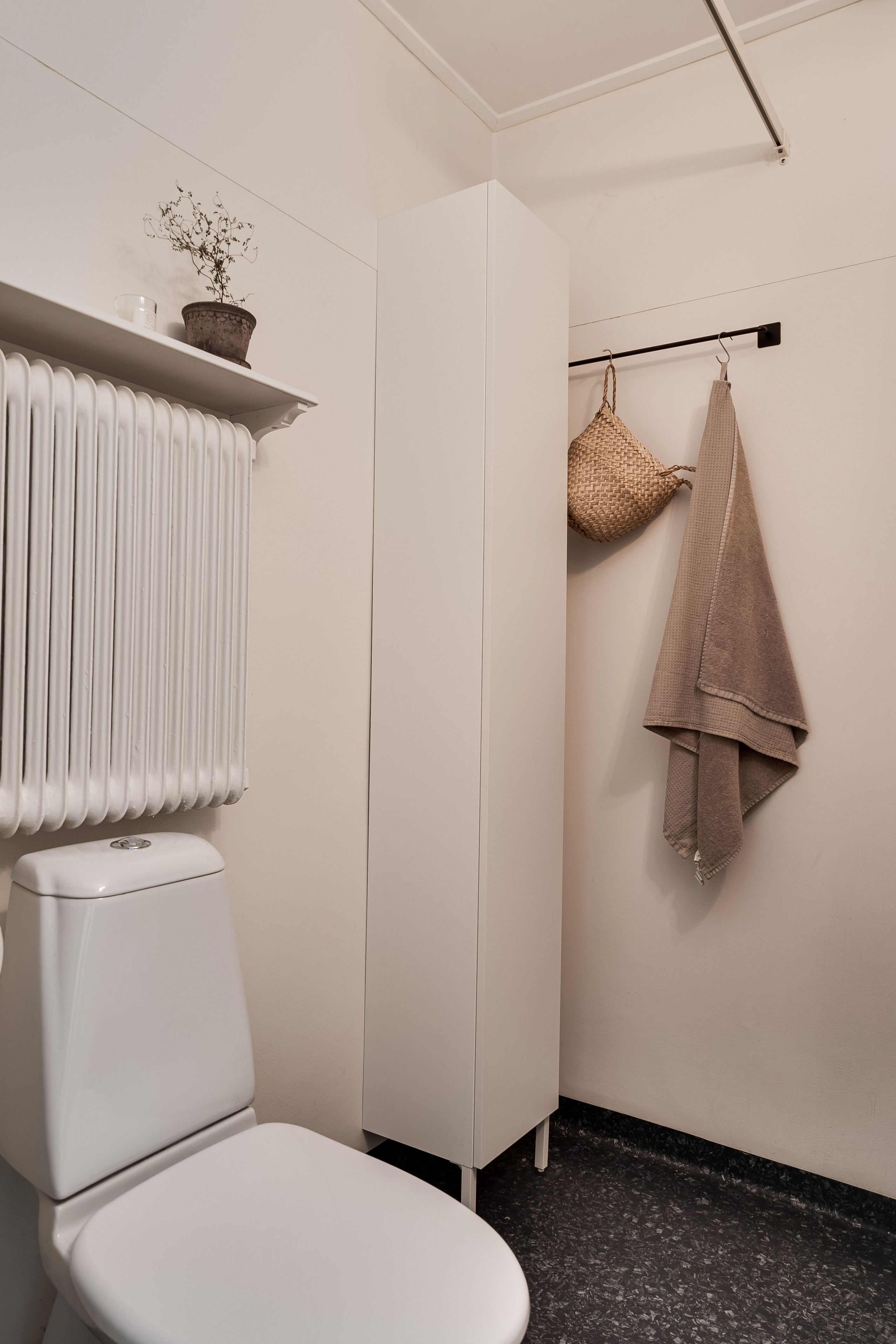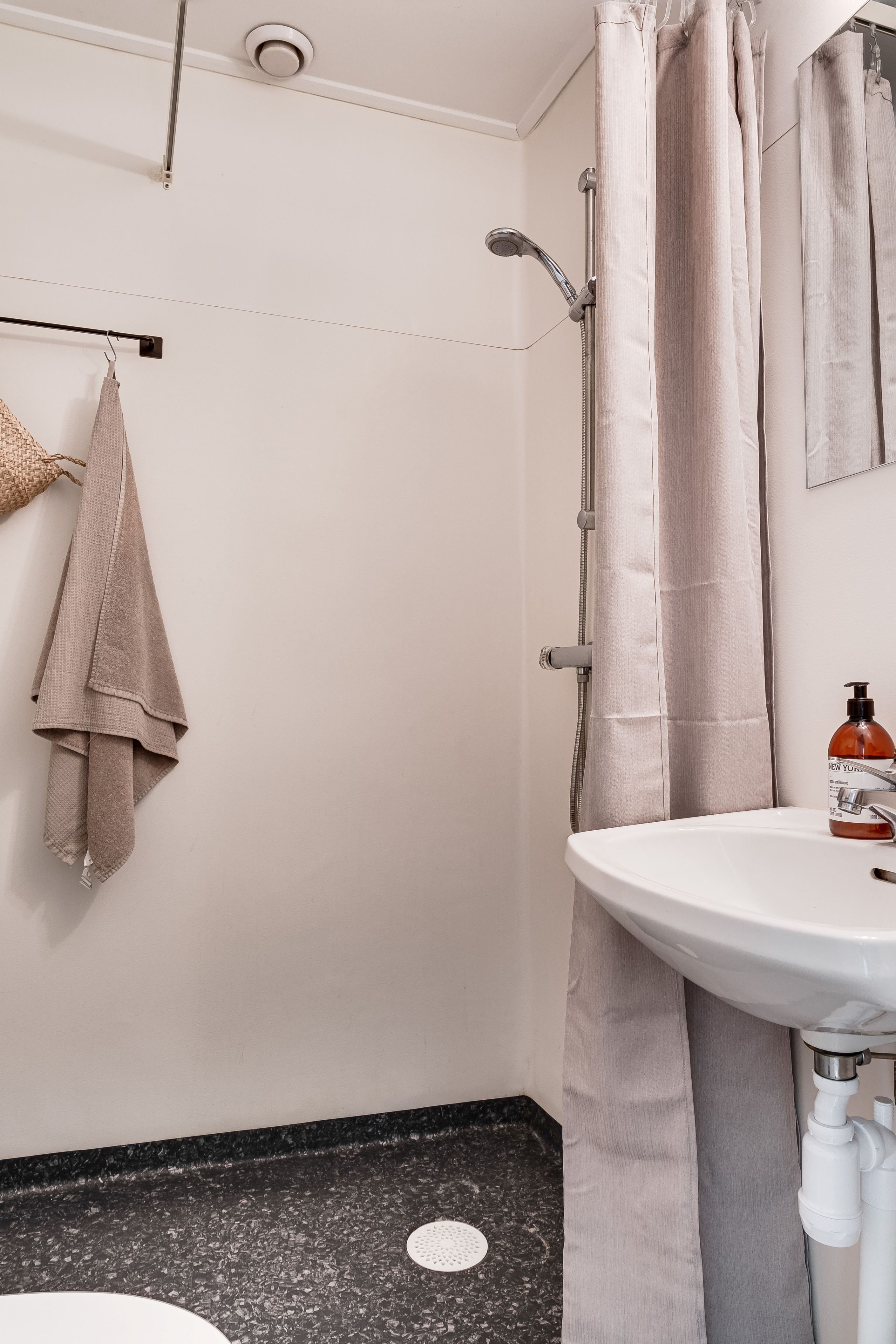 Rakt fram från hallen ligger bostadens badrum placerat. Här finer du ett renoverat utrymme med en mörkare våtrumsmatta på golvet och en vit våtrumstapet på väggarna. Utrymmet är utrustat med WC, handfat med spegel ovan samt dusch.