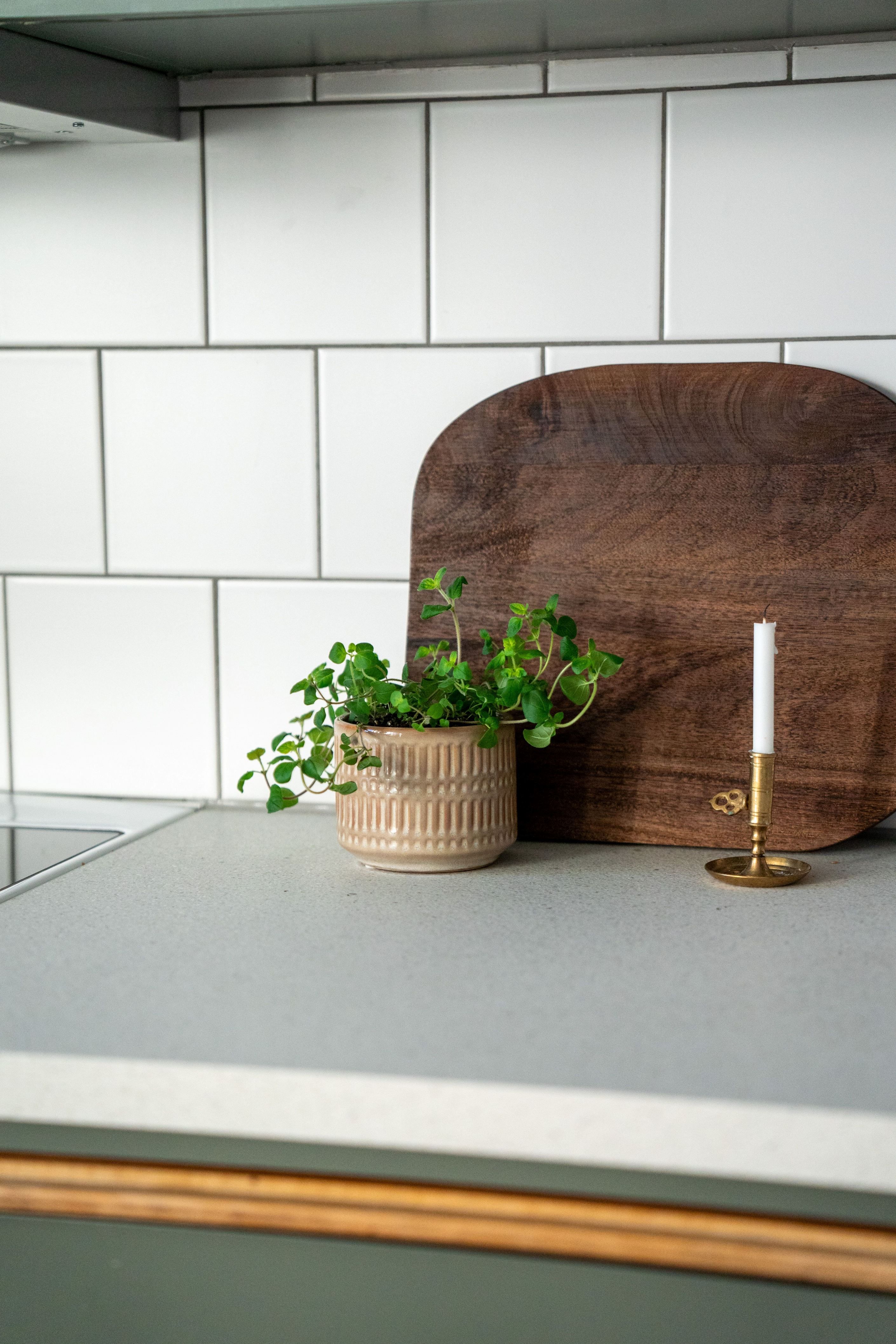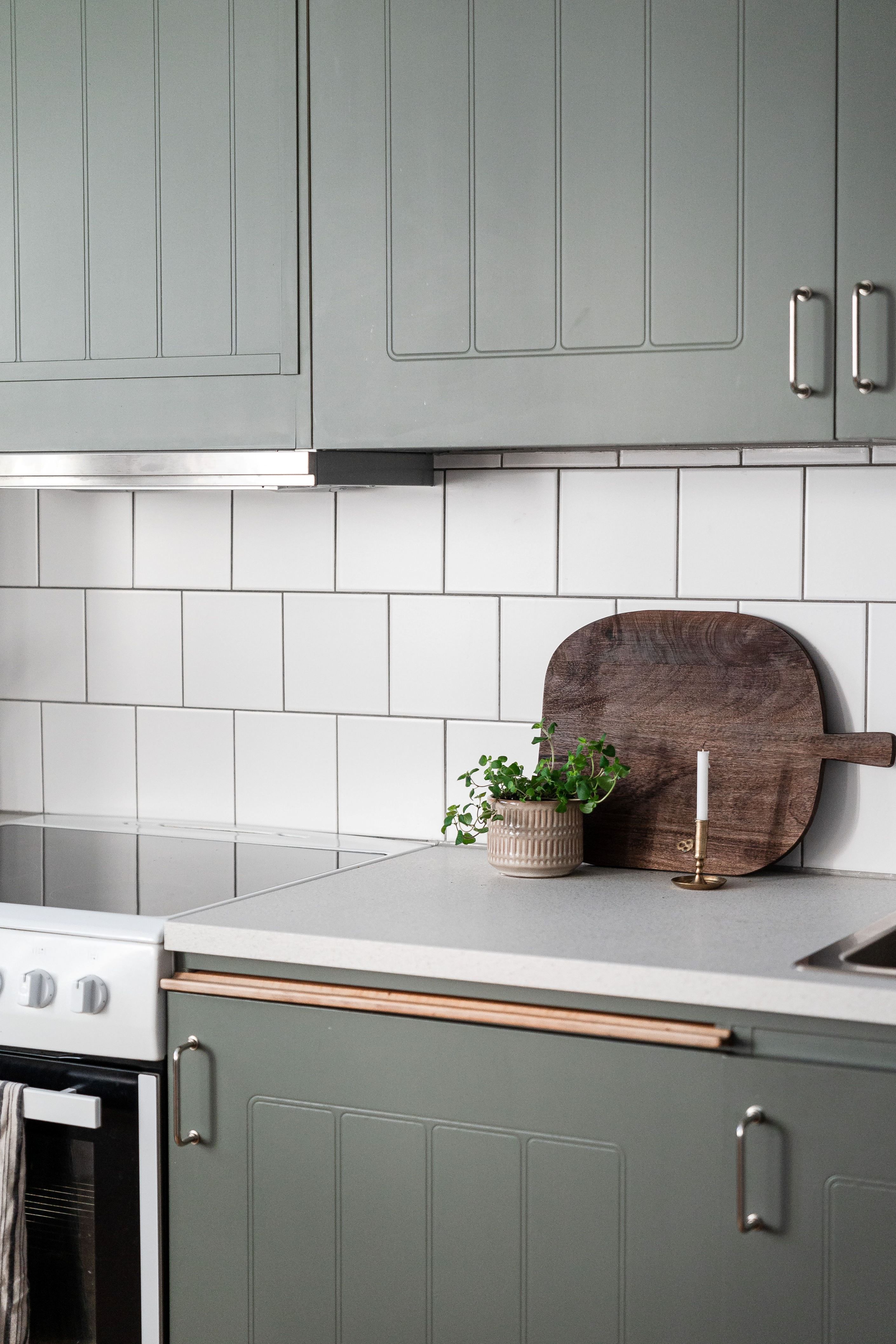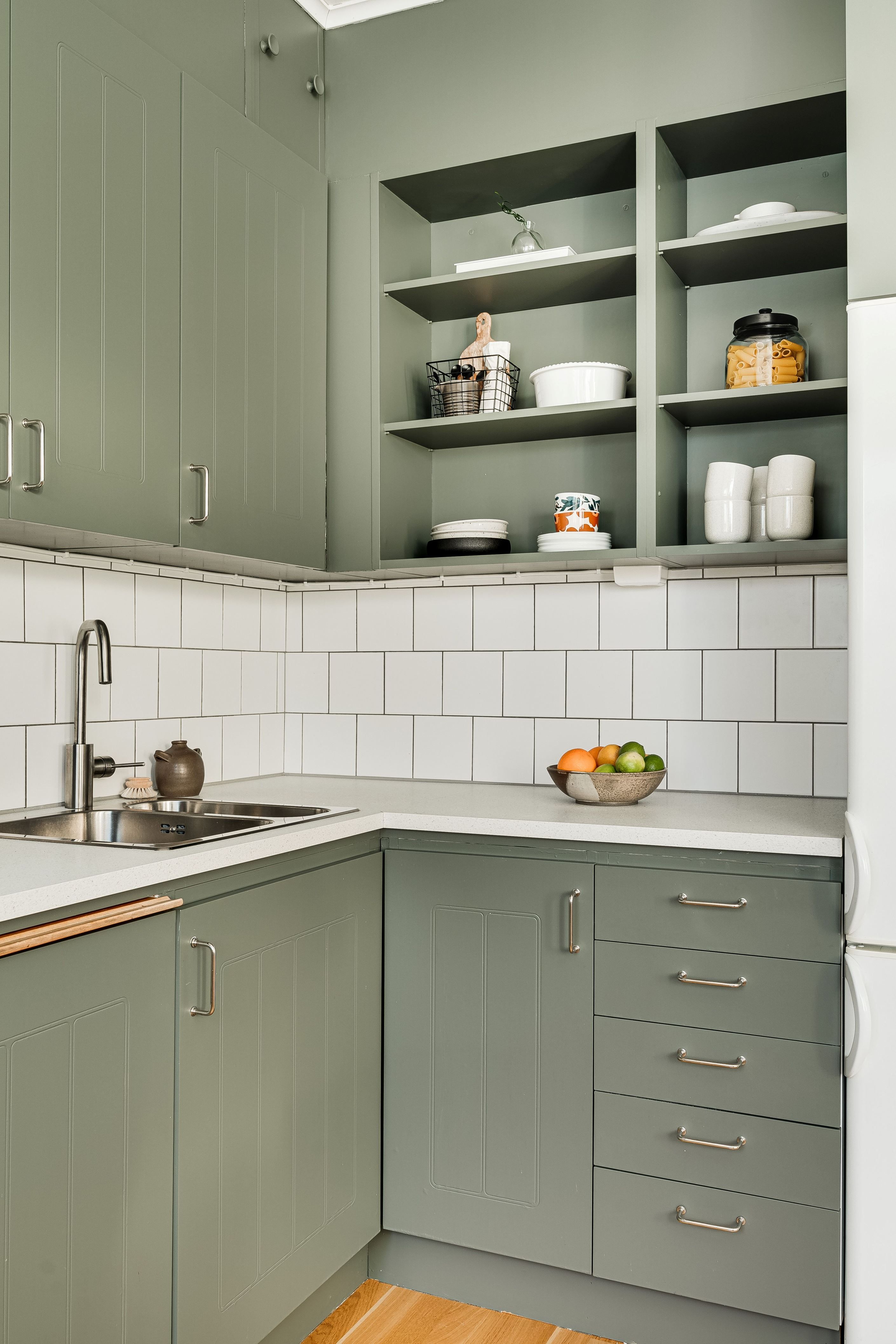 Till vänster ligger köket som har renoverats med en vacker mörkgrön färg på skåp och luckor, stilfulla beslag, bänkskiva i vitt samt vitt kakel. Köket har en fullutrustad maskinpark och intill stora fönsterpartier ryms en matgrupp.