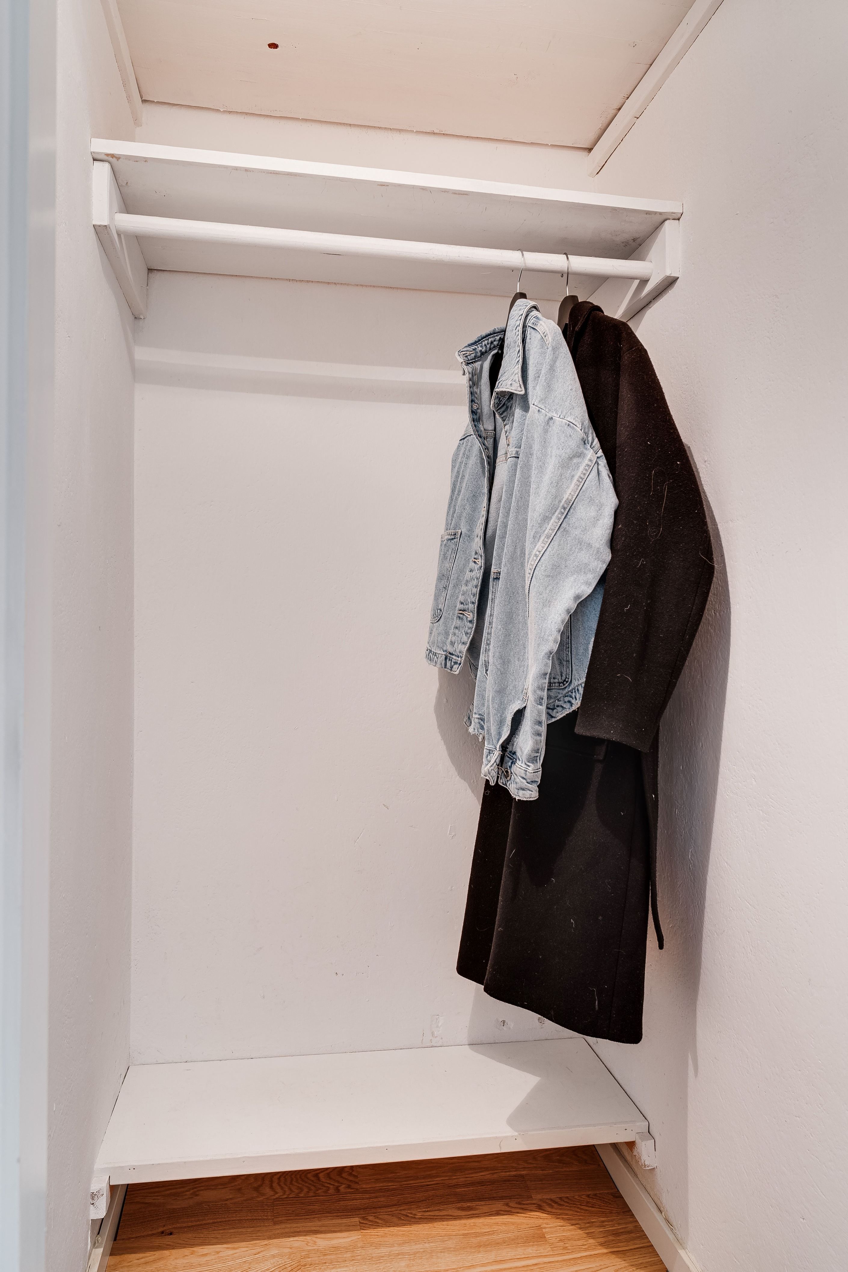Till höger finner du sedan ett utrymme för säng längst ena väggen och smakfullt inbyggda garderober längst den andra. Detta skapar en egen plats för sömn utan att behöva ha sängen placerad i vardagsrummet där du önskar kunna umgås med dina vänner och familj.