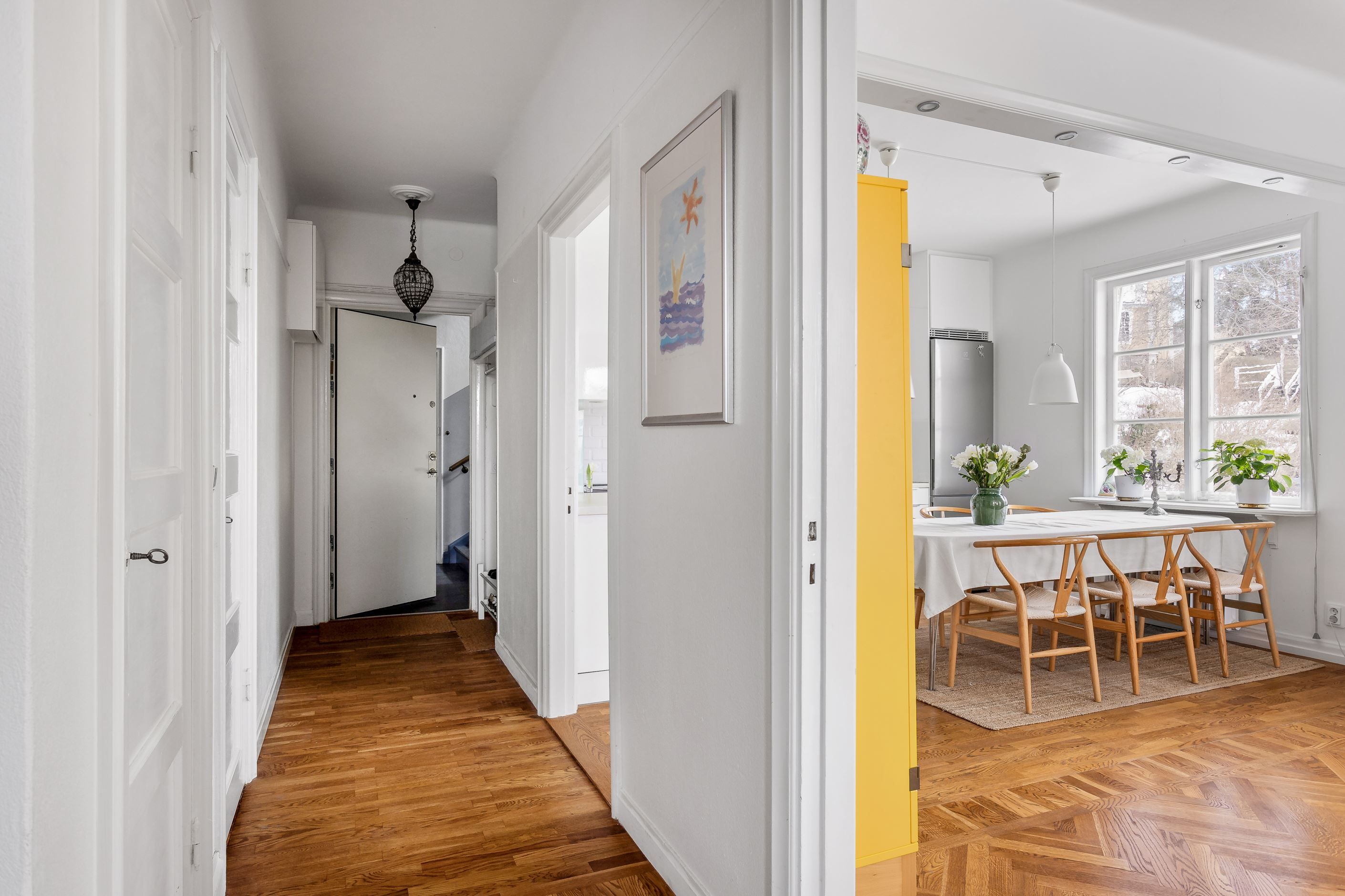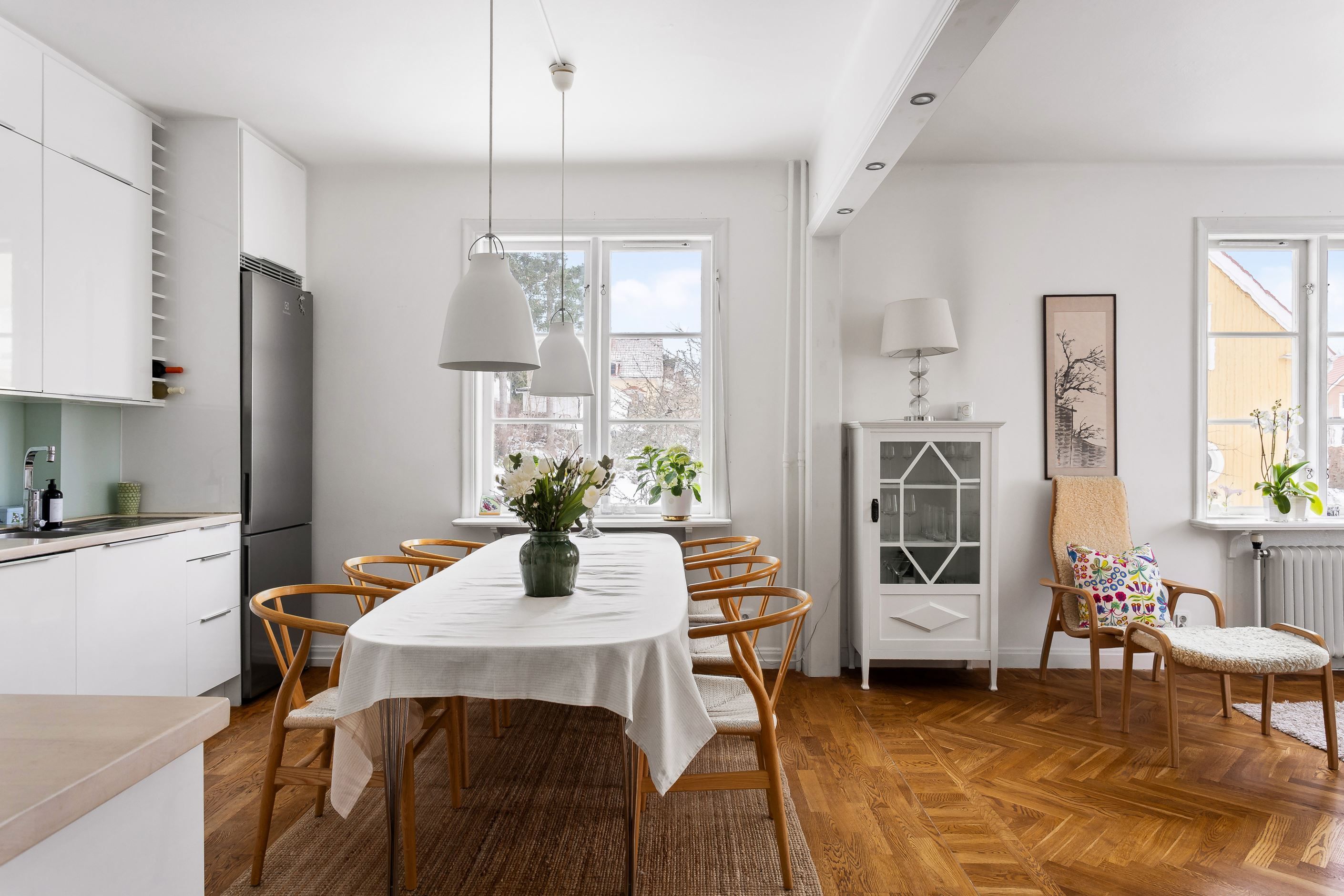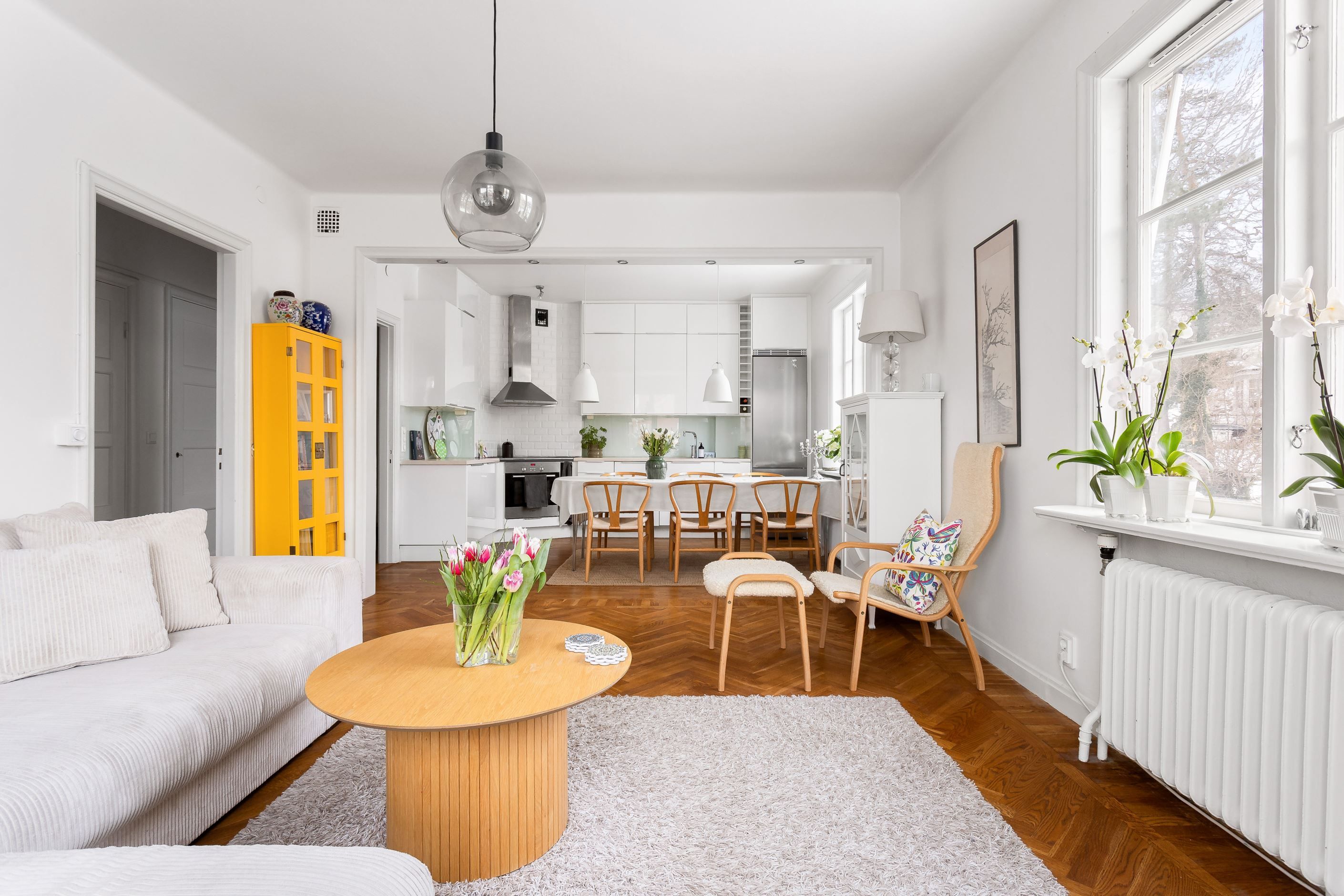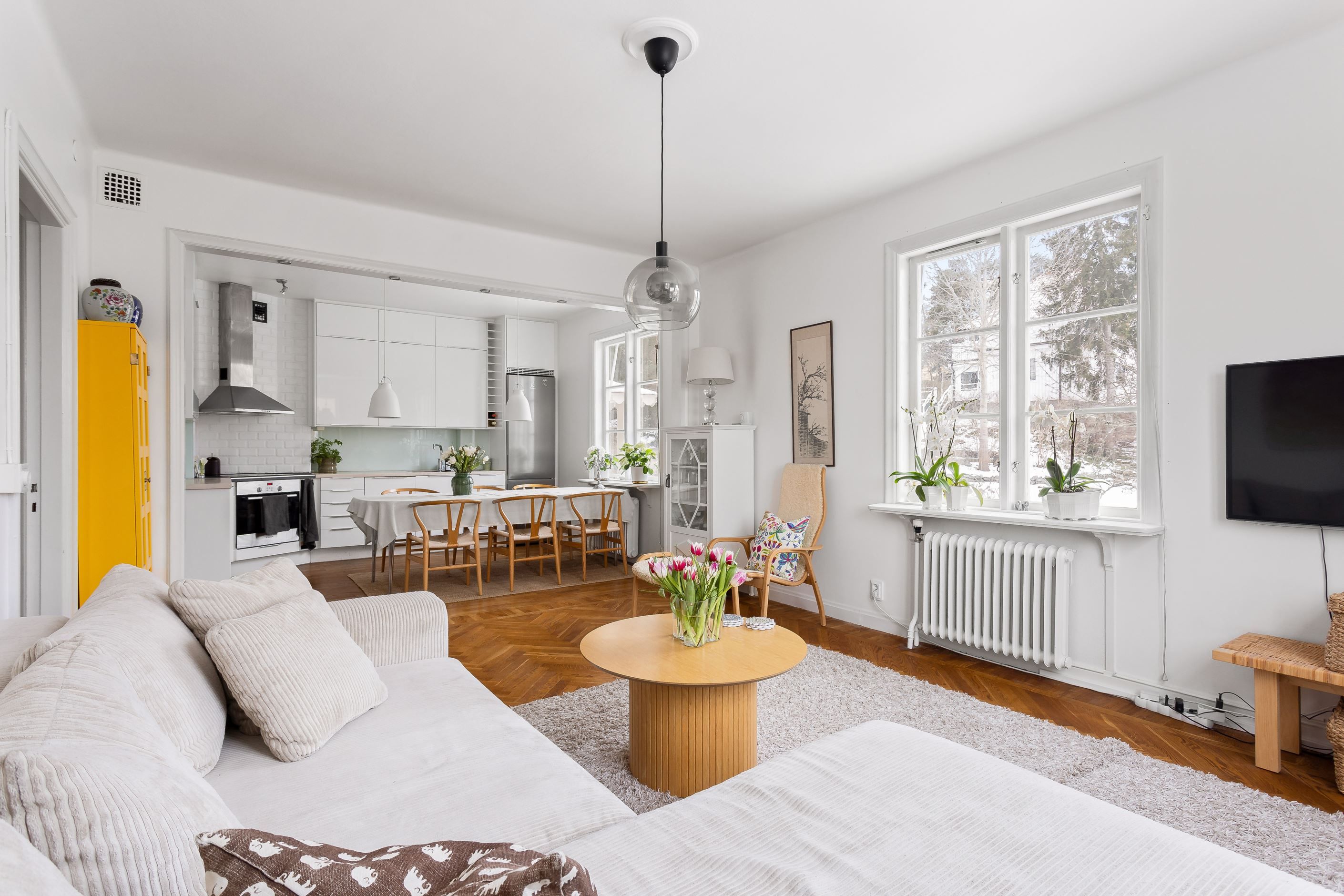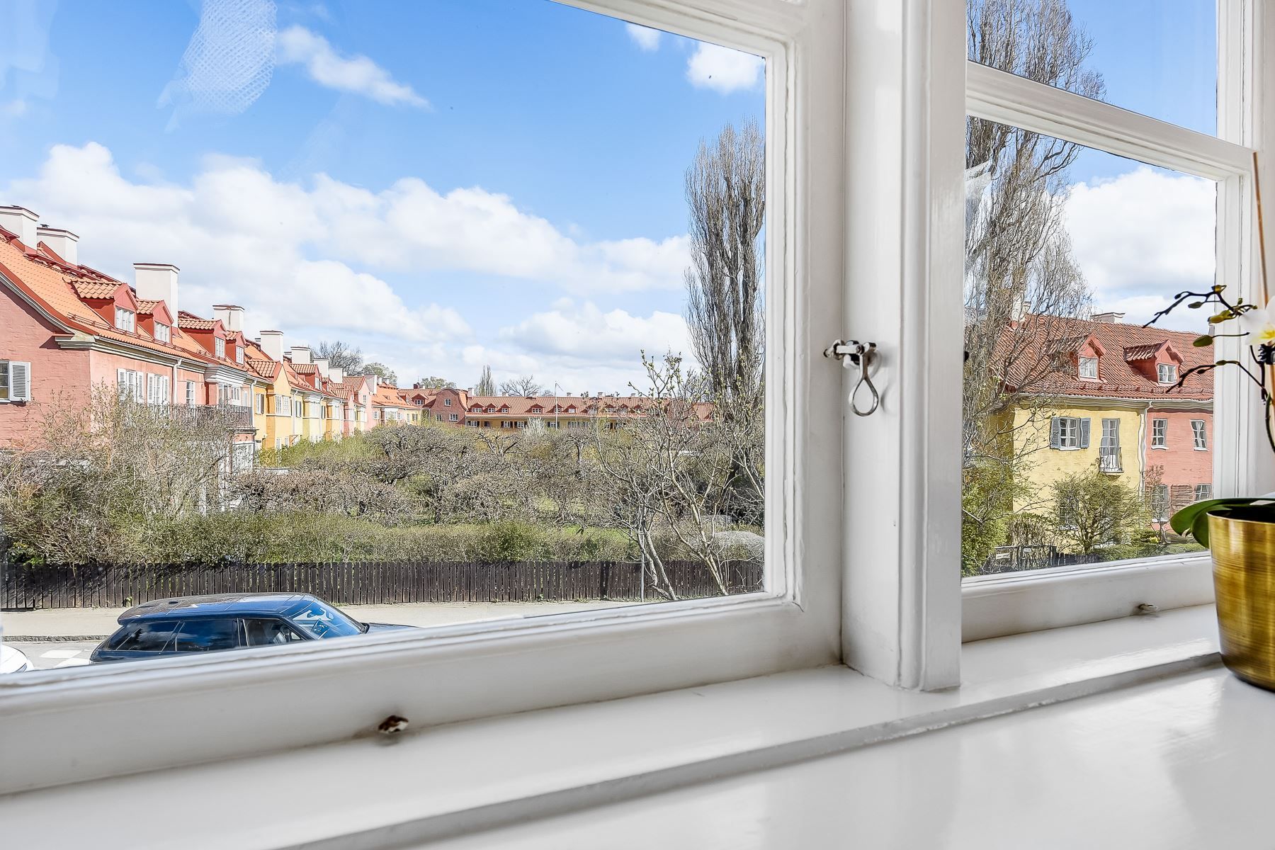 Stilfull 20-talscharm på eftersökt adress där Äppelviken är som vackrast. Spröjsade fönster mot lugn grönskande idyll. Ljusa, luftiga och insynsfria rum i fil med härlig takhöjd och fina ekgolv. Välplanerad lägenhet i mycket fint skick med genomgående påkostade materialval och stilsäker charm. Gedigen fastighet med vacker trädgård. Centralt, nära 12:an, butiker och skolor. Citynära med gångavstånd till Alviks Torg och Mälaren. Bra Brf med synnerligen låg belåning(1948kr/kvm).