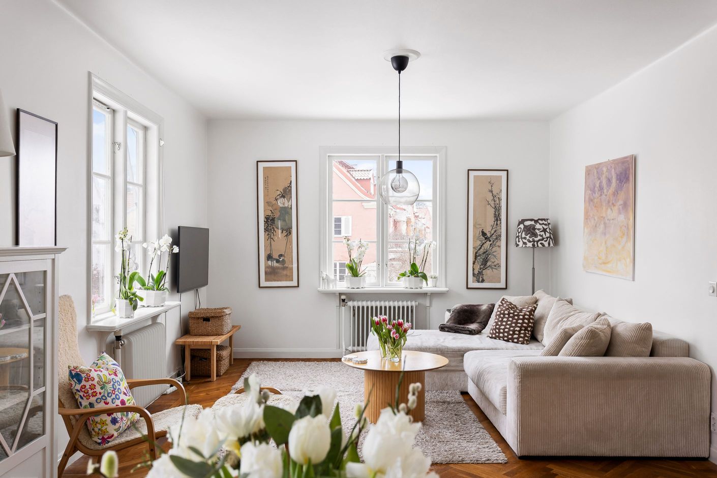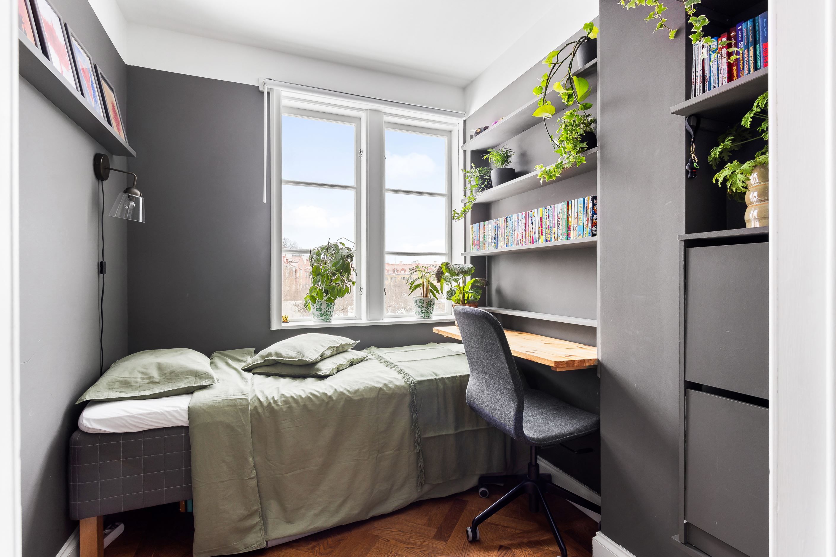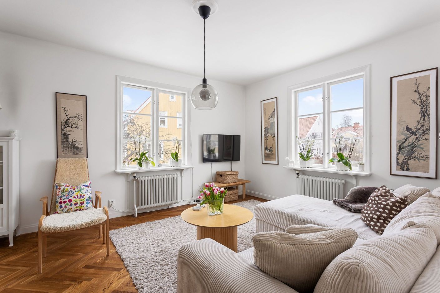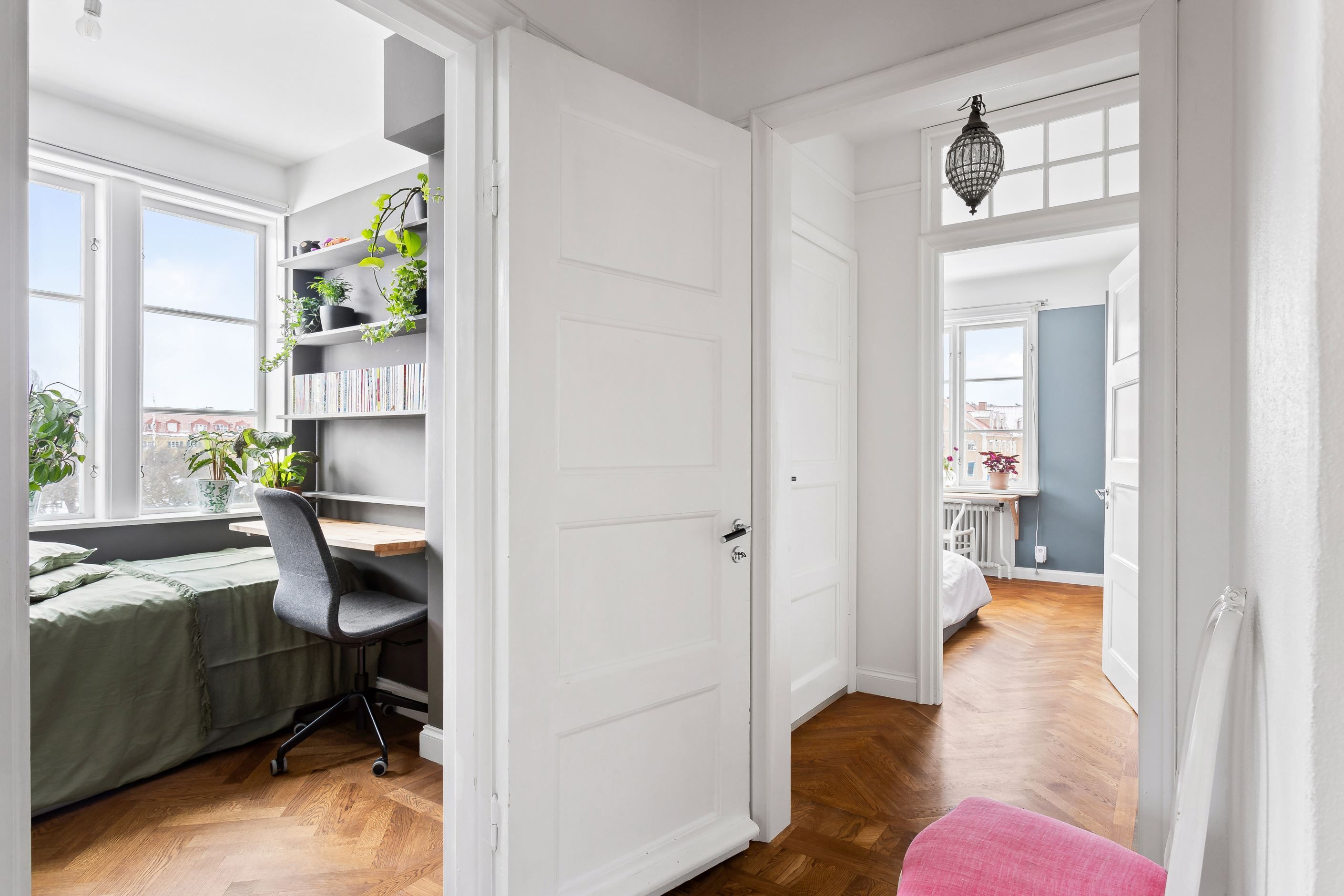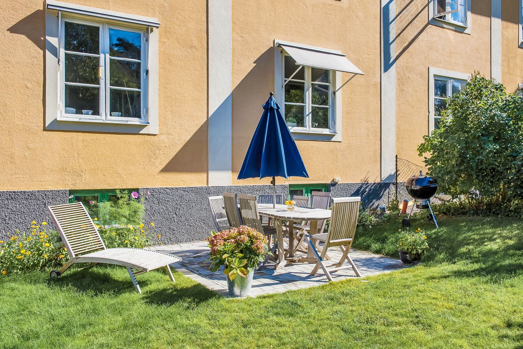 Stilfull 20-talscharm på eftersökt adress där Äppelviken är som vackrast. Spröjsade fönster mot lugn grönskande idyll. Ljusa, luftiga och insynsfria rum i fil med härlig takhöjd och fina ekgolv. Välplanerad lägenhet i mycket fint skick med genomgående påkostade materialval och stilsäker charm. Gedigen fastighet med vacker trädgård. Centralt, nära 12:an, butiker och skolor. Citynära med gångavstånd till Alviks Torg och Mälaren. Bra Brf med synnerligen låg belåning(1948kr/kvm).