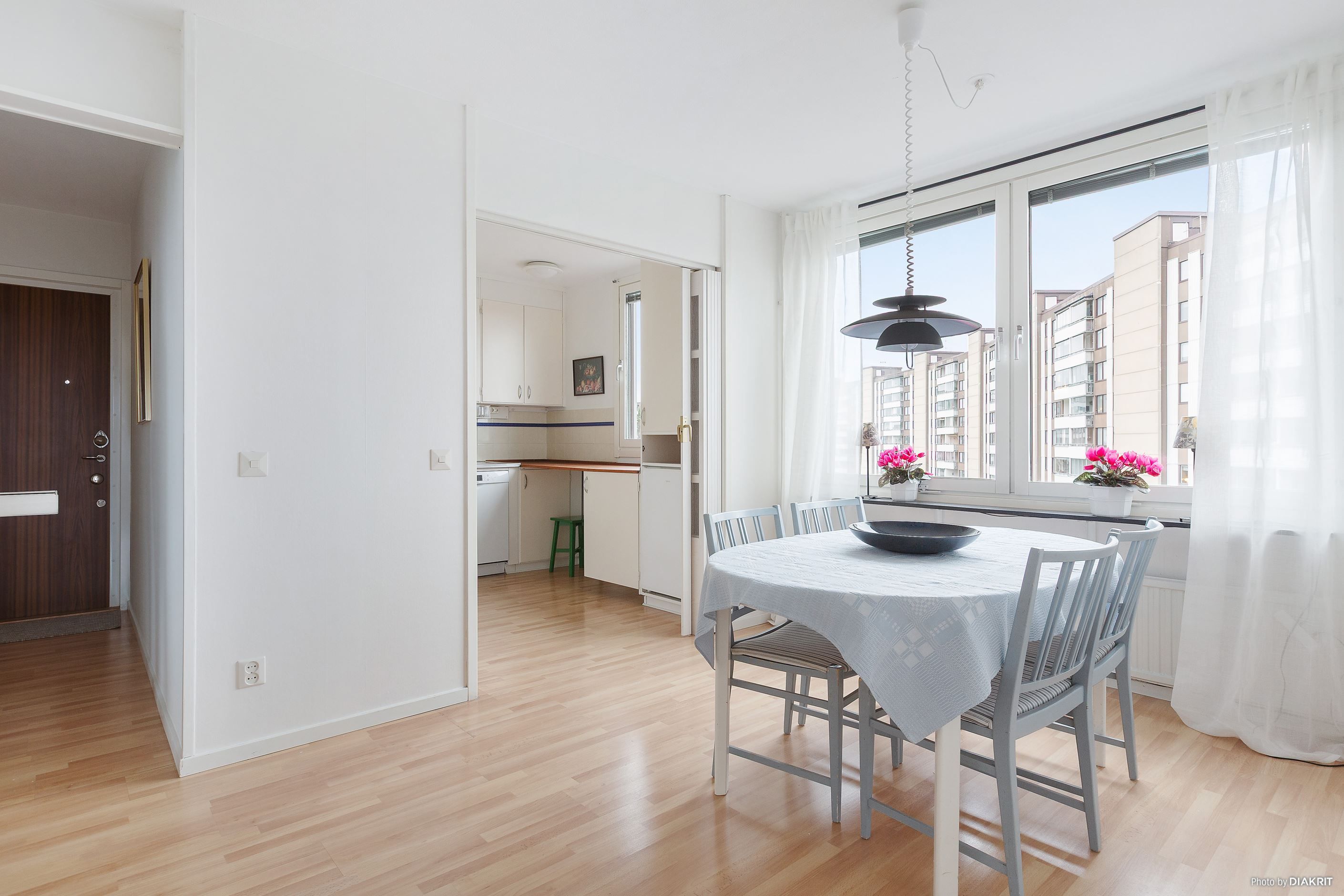Ljus och rymlig matplats i öppen planlösning med arbetsköket