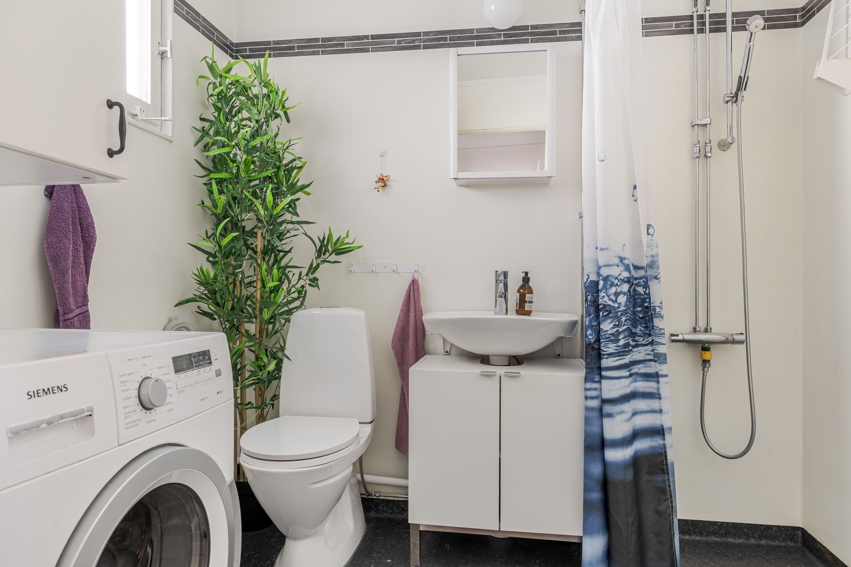 Badrummet är funktionellt och utrustat med dusch med draperi, wc, handfat, spegelskåp och tvättmaskin. Väggar och golv är klädda i plastmatta för enkel skötsel.