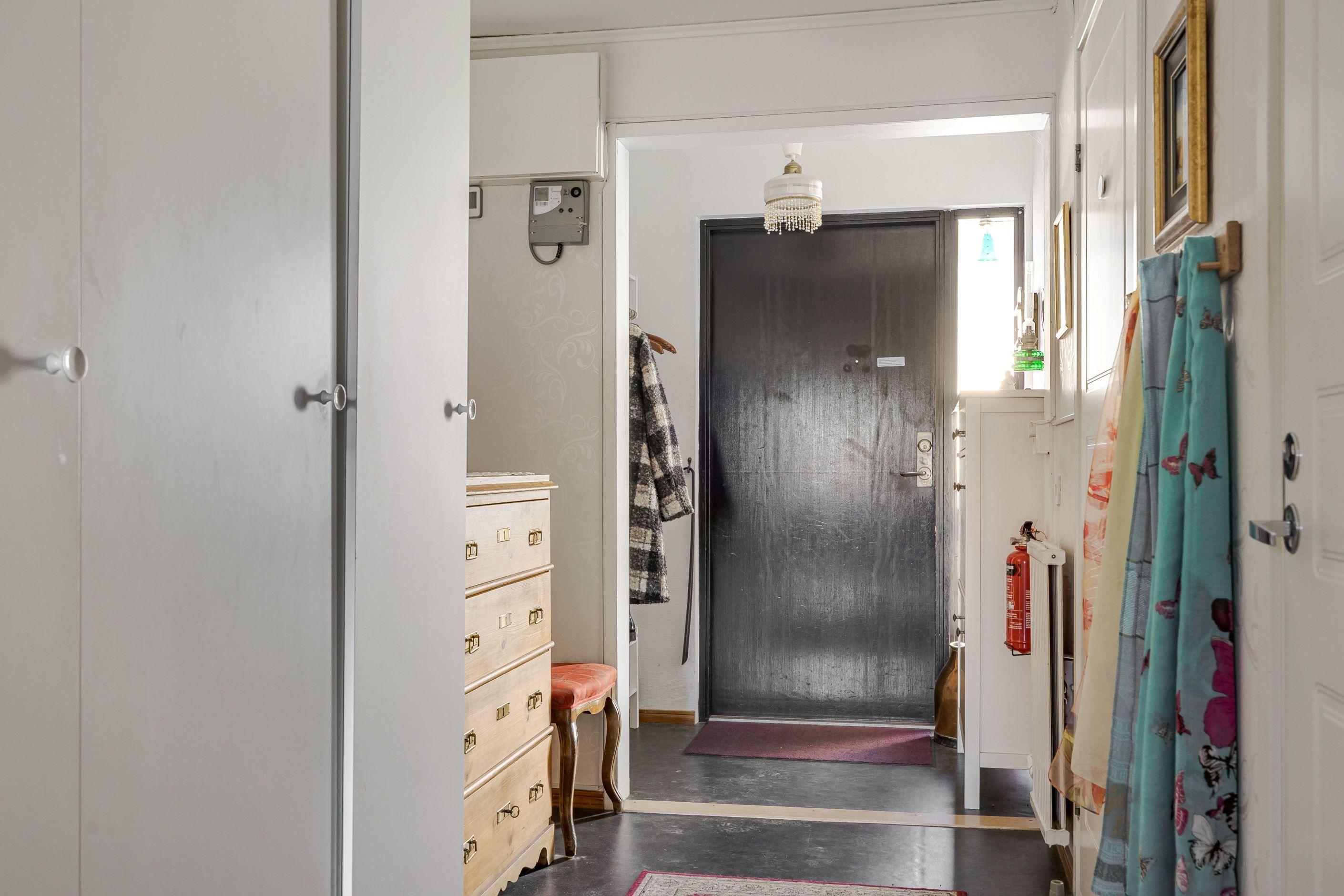 Entrésidan är inbjudande med en takad förstukvist, sittbänk och plats för cykel eller barnvagn. Vidare möts du av en rymlig hall med gott om plats för avhängning samt förvaring i två garderober. Härifrån nås även en praktisk klädkammare.