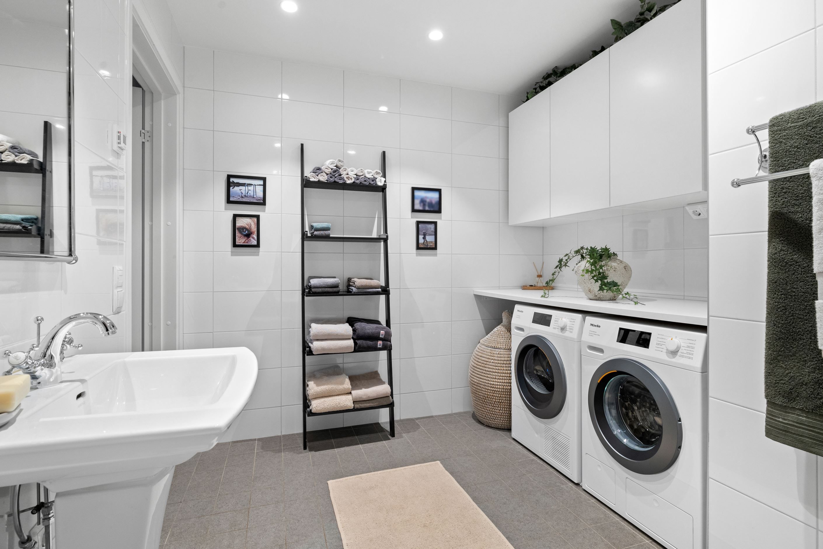 Två badrum, med exklusiva materialval, varav ena badrummet är utrustat med integrerad tvättdel, ny Miele tvättmaskin och torktumlare (2025) samt badkar, medan det andra har dusch. Båda badrummen har skön golvvärme som gör det extra behagligt under årets kalla månader.