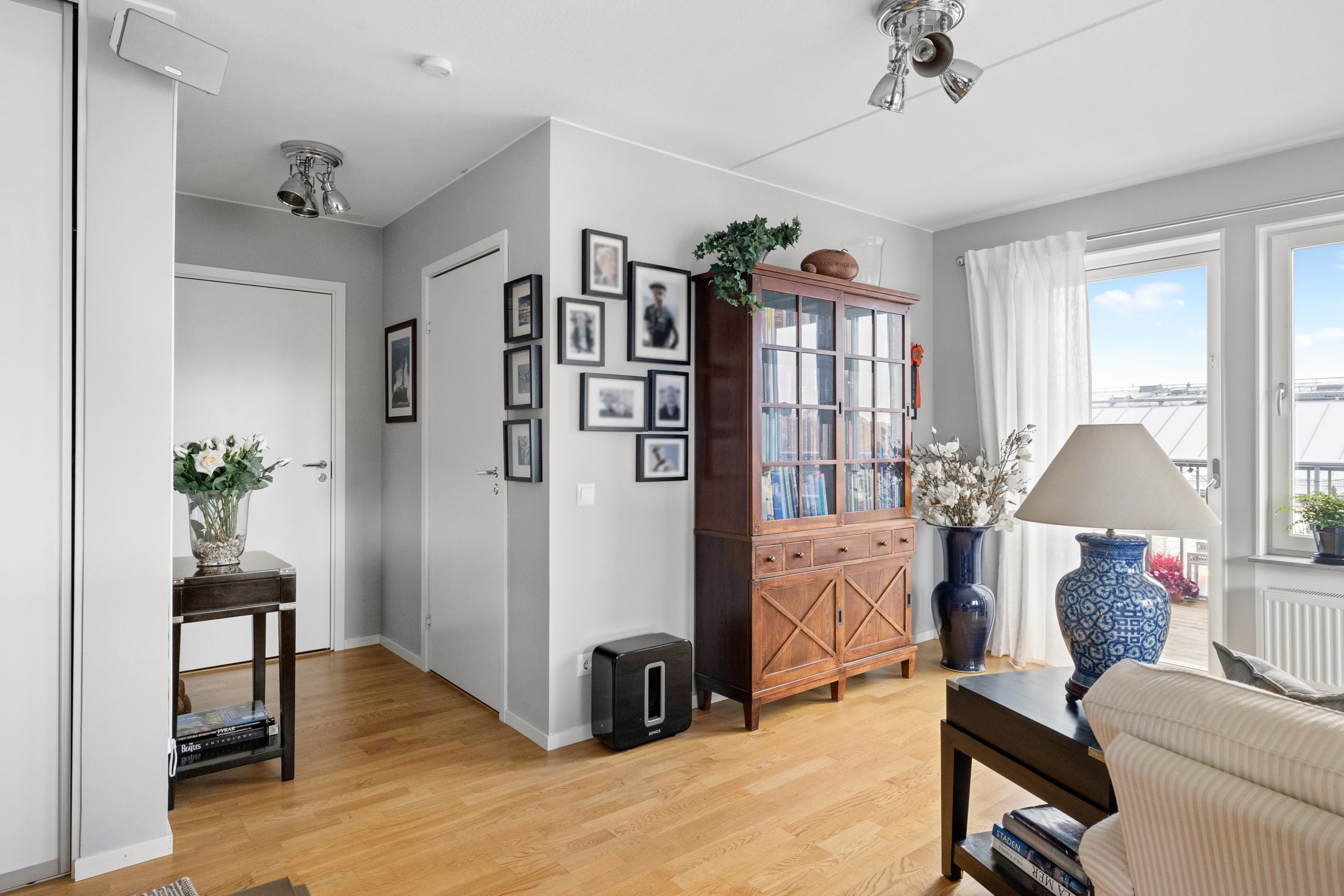 Högst upp i huset, med hiss som tar dig till eget våningsplan, helt utan insyn och med en vy som sträcker sig över trädtoppar och villaområden, väntar en bostad utöver det vanliga. Här får du känslan av att bo i hus fast med bekvämligheten av lägenhet och kan följa solen hela dagen, kanske grilla på någon av terasserna till kvällen, njuta av lugnet och ändå ha närhet till allt.
