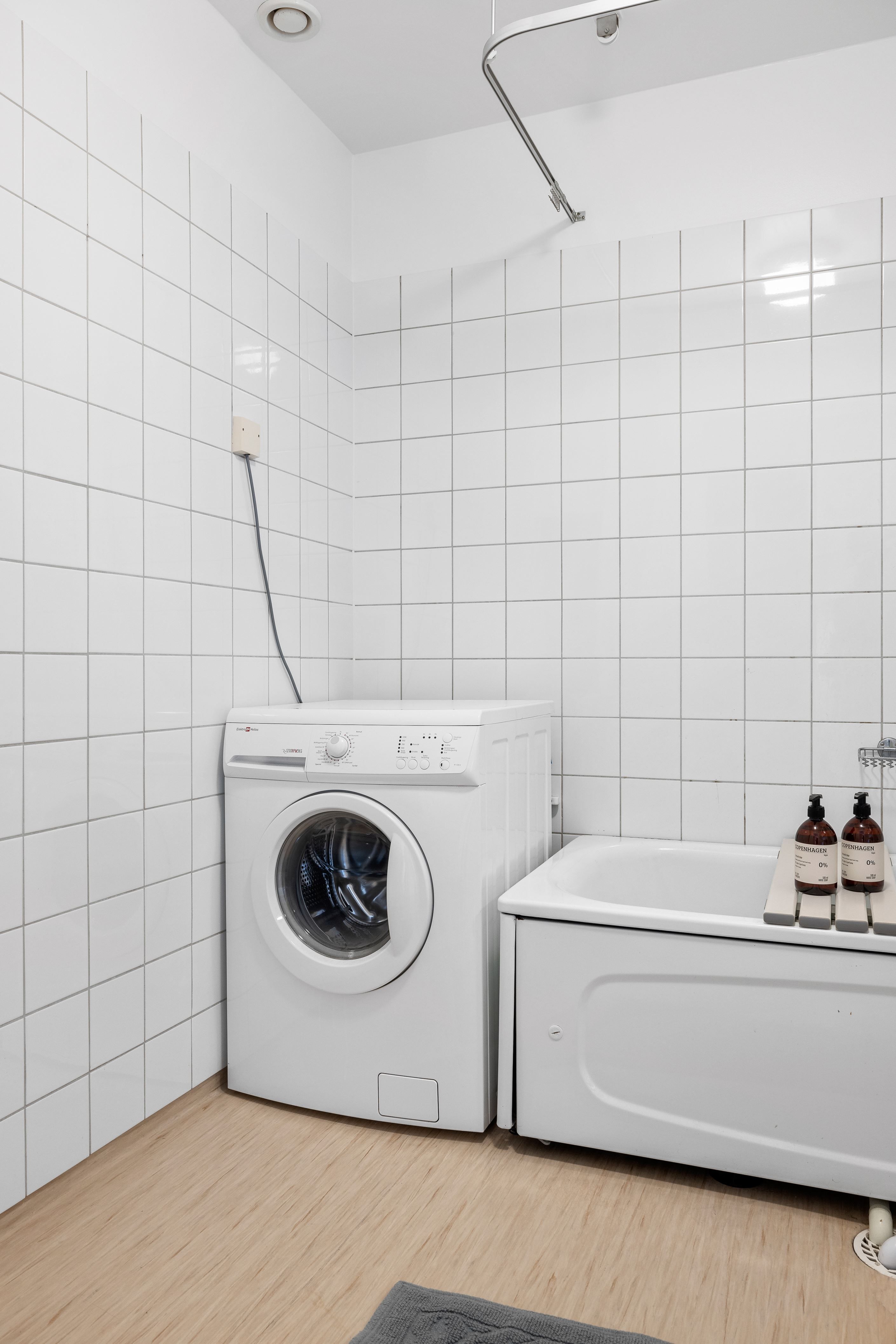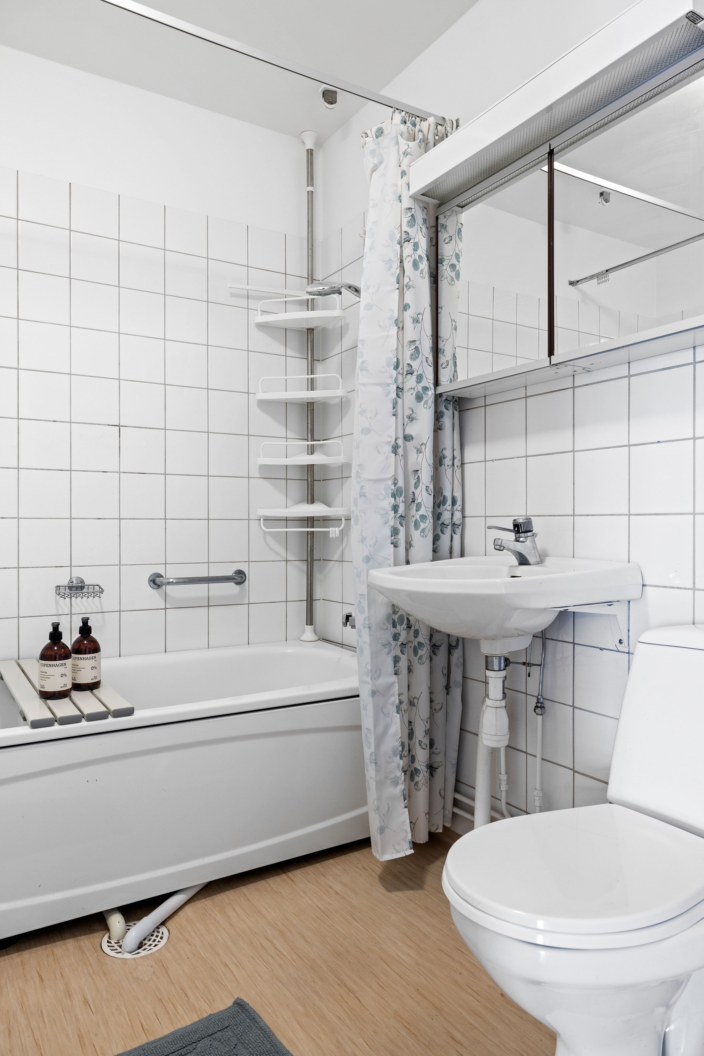 Badrummet har våtrumsmatta och är delvist kaklat. Kaklet är i vitt och i övrigt målade väggar i ljus kulör. Badkar, WC samt tvättställ. Tvättmaskin finns installerad och ingår.