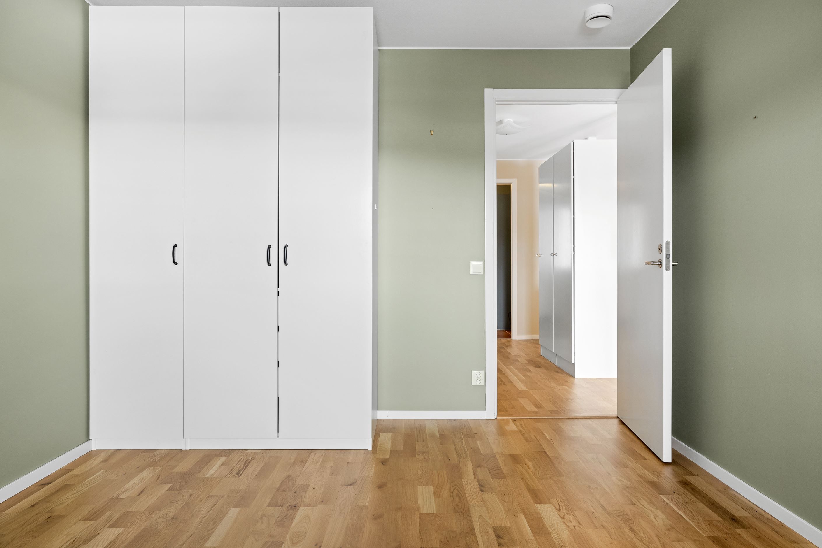 De två sovrummen har nymålade väggar varav ett sovrum med en trevlig fondtapet. I det större sovrummet finns tre garderober. Utanför det större sovrummet finns dessutom en dessutom rymlig klädkammare.